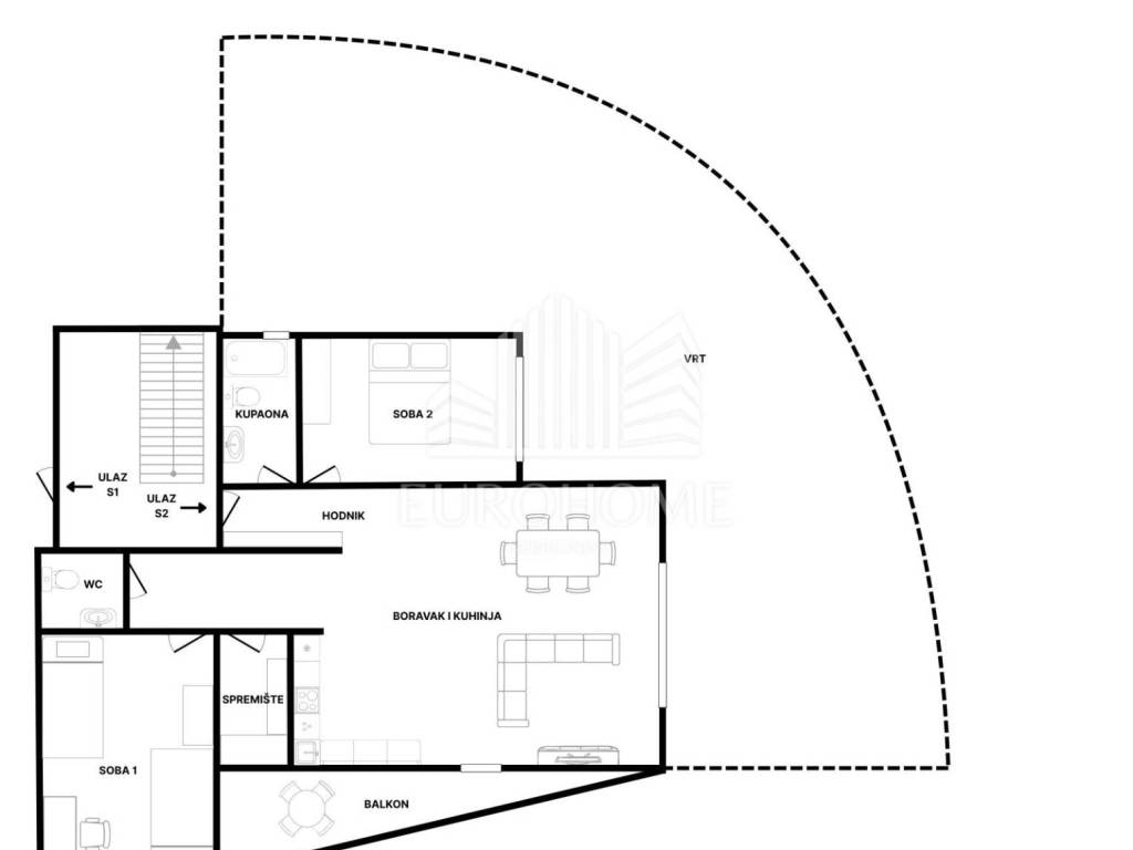 Stan se sastoji od: - prostranog dnevnog boravka integriranog s kuhinjom i blagovaonicom - dvije udobne spavaće sobe - kupaonice - WC-a - vrta - natkrivenog balkona - spremišta - garaže