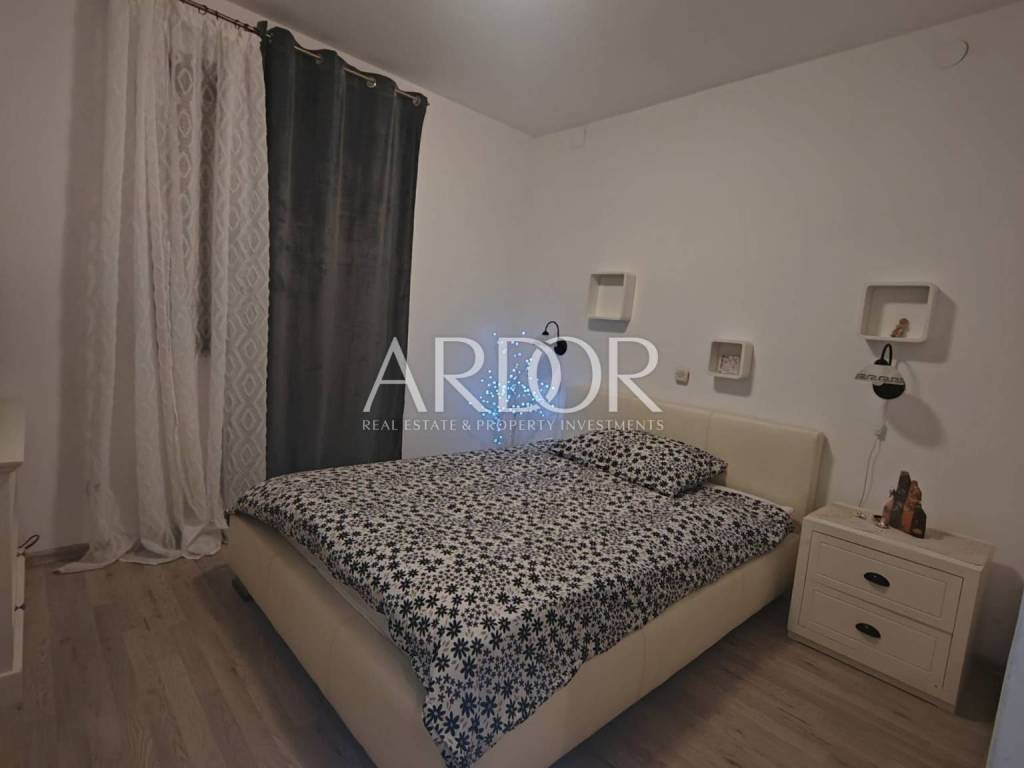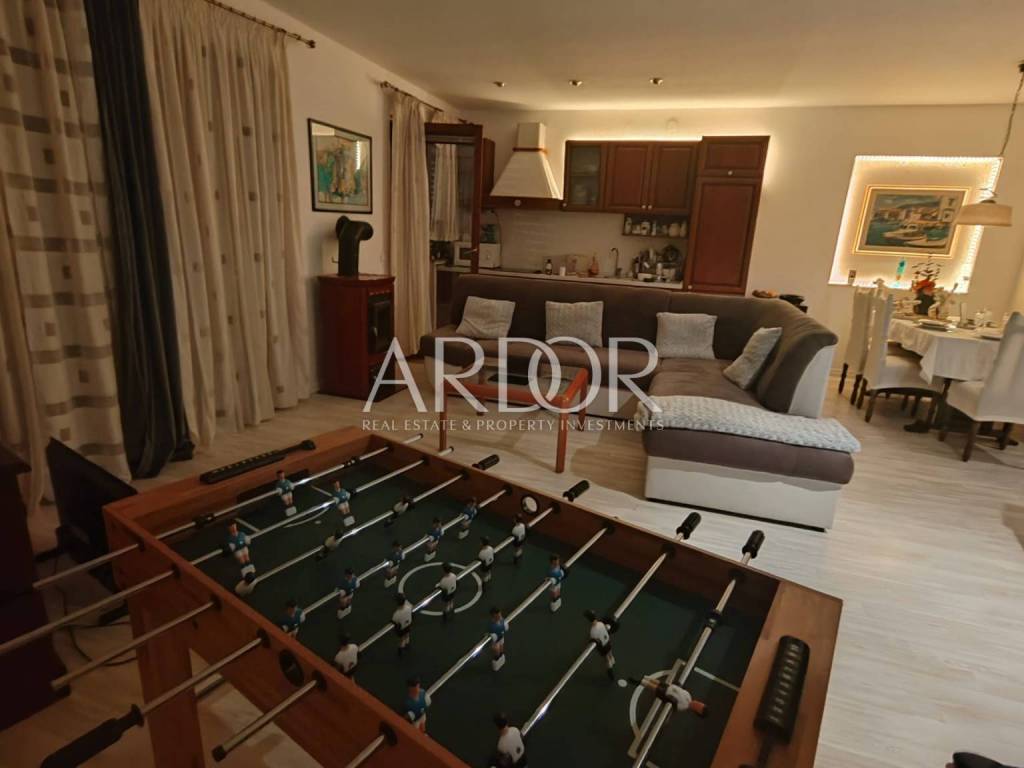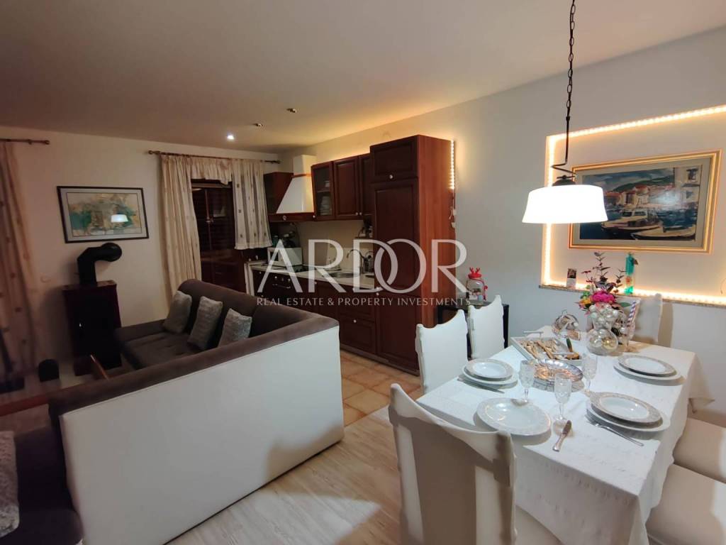 Stan je potpuno namješten, ima čisto vlasništvo i nalazi se u mirnom okruženju, a istovremeno u blizini svih važnih sadržaja – vrtića, škole, trgovine, ambulante, javnog prijevoza, plaže i mora. Grijanje i hlađenje omogućeni su pomoću klima uređaja, električne energije te peći na drva ili pelete. Orijentacija je južna, a iz stana se pruža pogled na more. Nekretnina je pogodna za turistički najam, a dostupna je odmah.