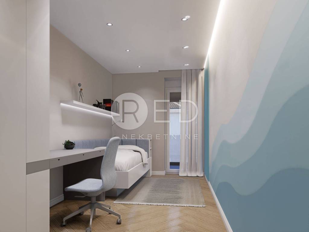 Gornja etaža rezervirana je za mir i privatnost te obuhvaća četiri spavaće sobe, kupaonicu i balkon površine oko 8 m2. Prostor je svijetao, prozračan i praktično organiziran, s posebnim naglaskom na udobnost svakodnevnog života.