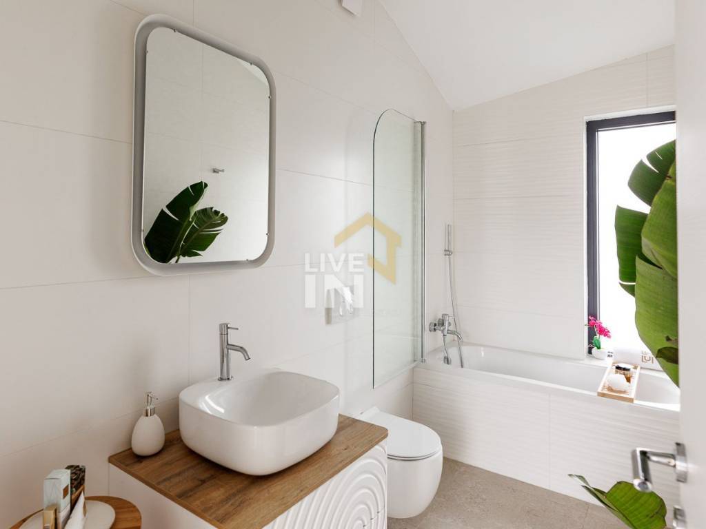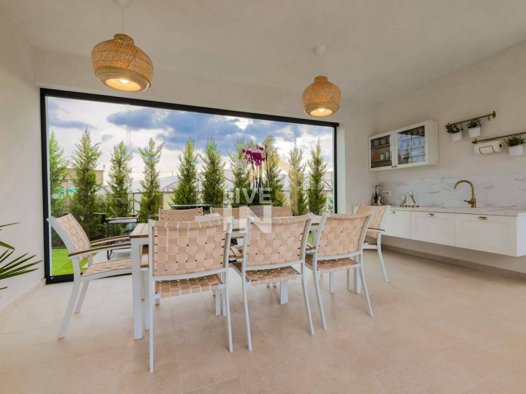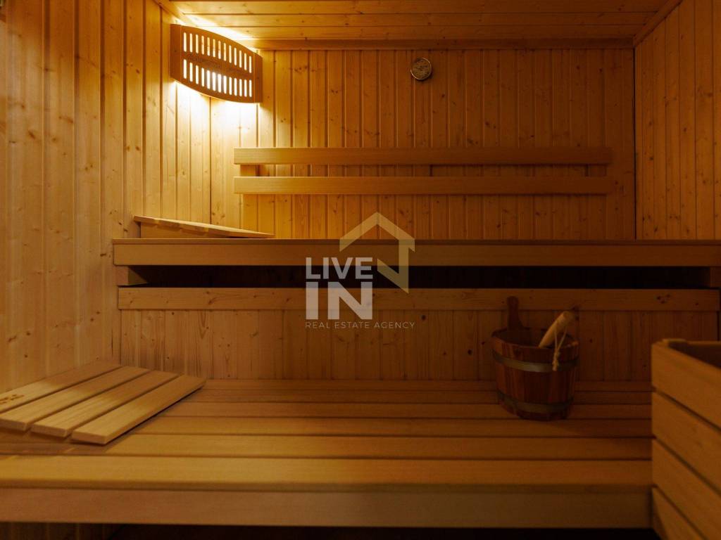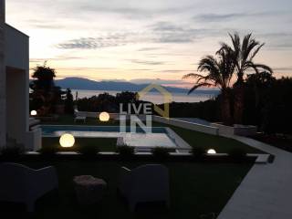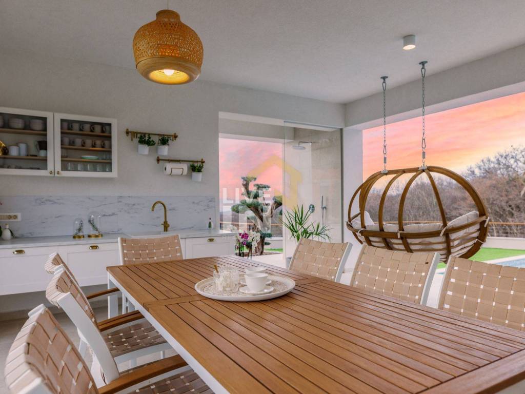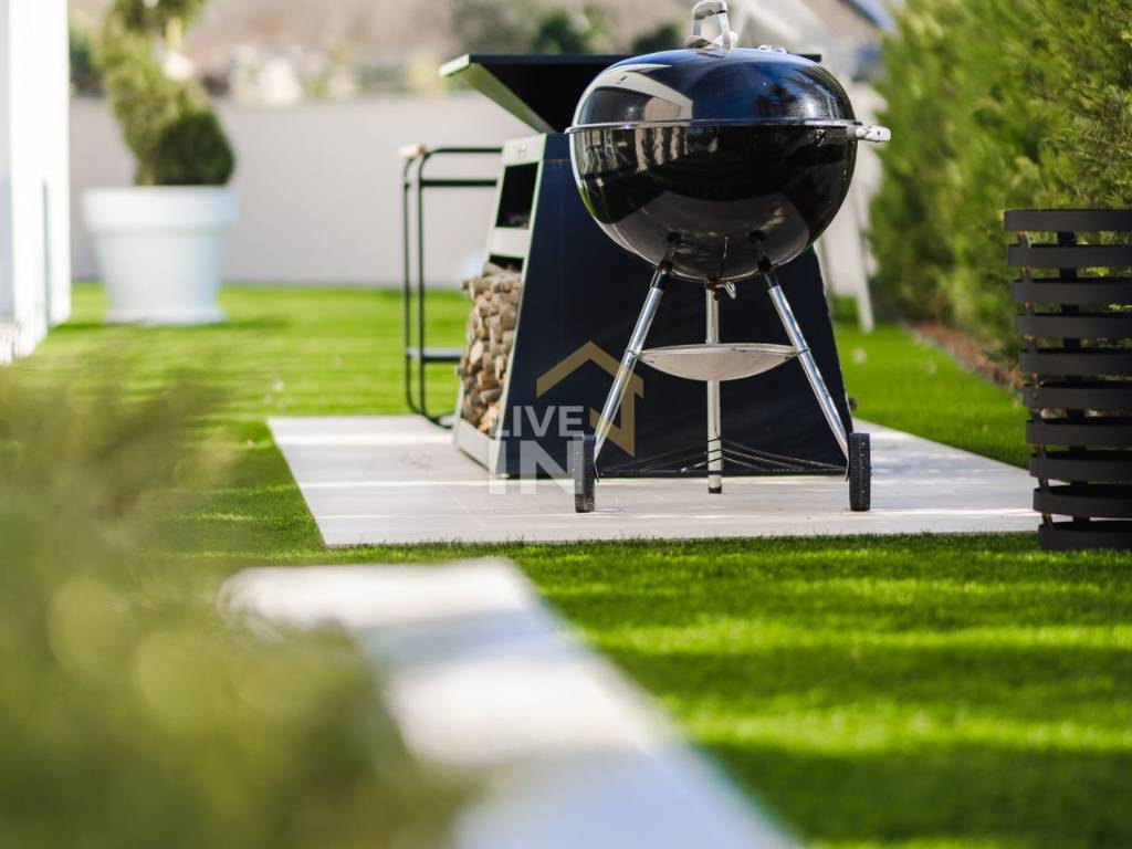Čarobni okoliš proteže se na 700 m2, a od sadržaja nudi grijani bazen veličine 38 m2, čiju čistoću i prirodnost osigurava najnovija tehnologija solinatora. Za potpuni doživljaj tu je i masažni dio bazena, a estetama će svakako zapeti za oko i činjenica da je bazen popločen mozaik pločicama s perla efektom koje svjetlucaju na suncu. Tu je i sunčalište te nekoliko posebno uređenih zona za odmor i opuštanje uz bogatu hortikulturu te grill zona koja uključuje luksuzni vrtni Quan roštilj.