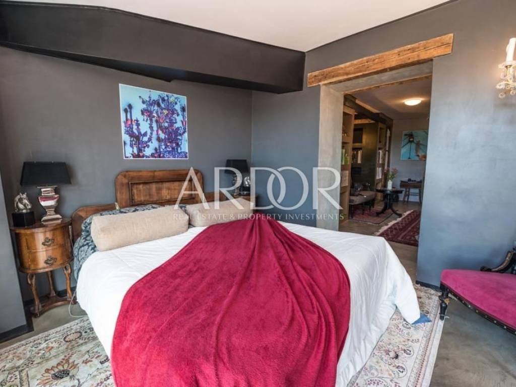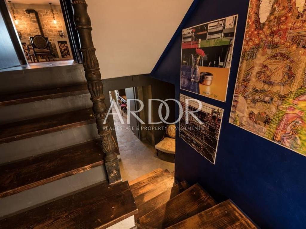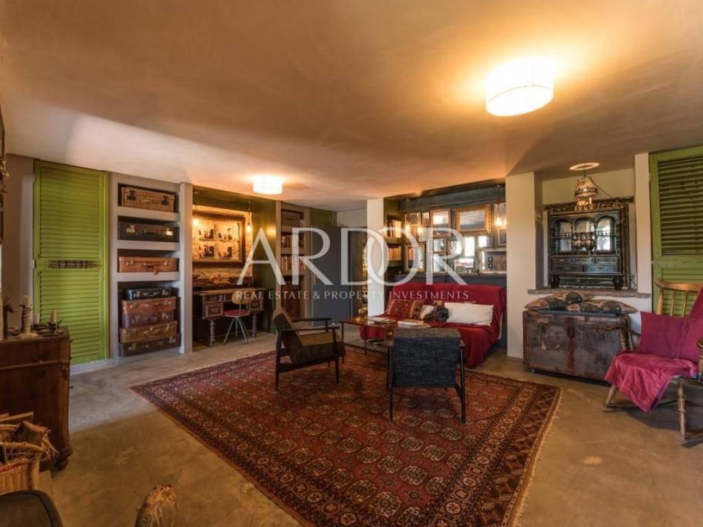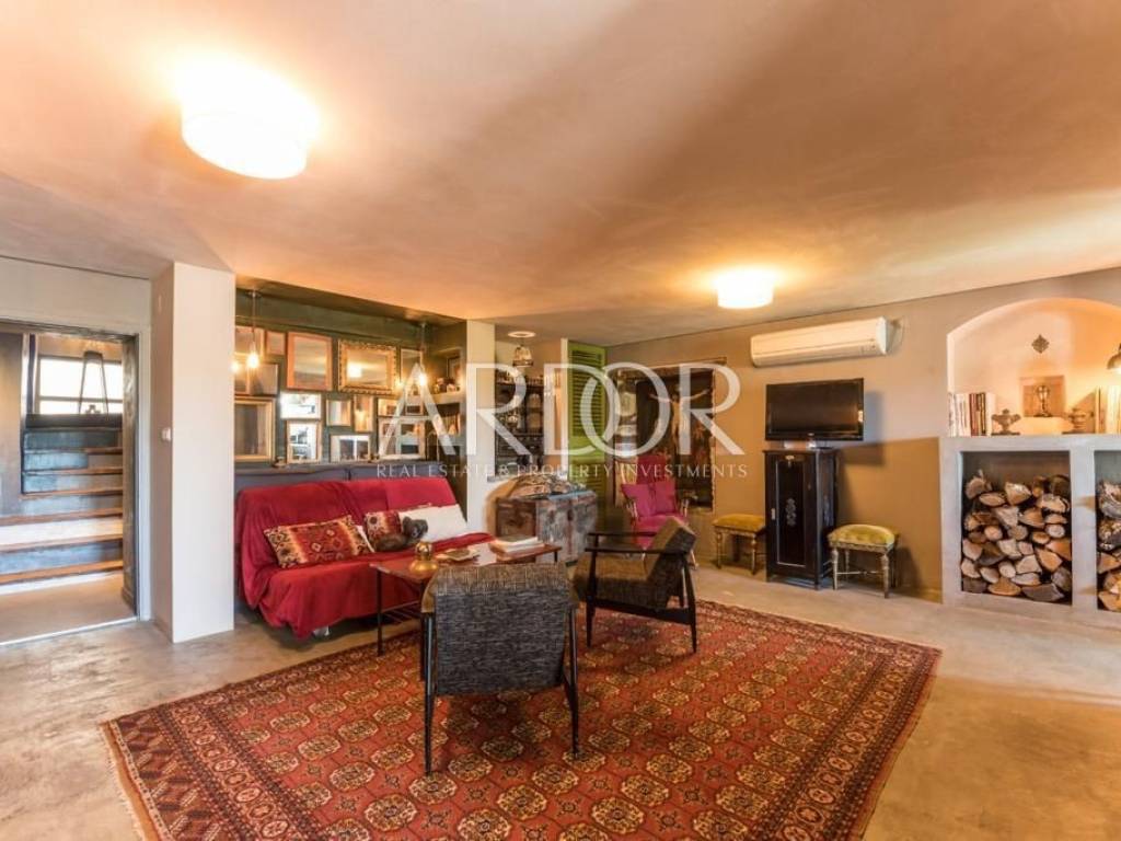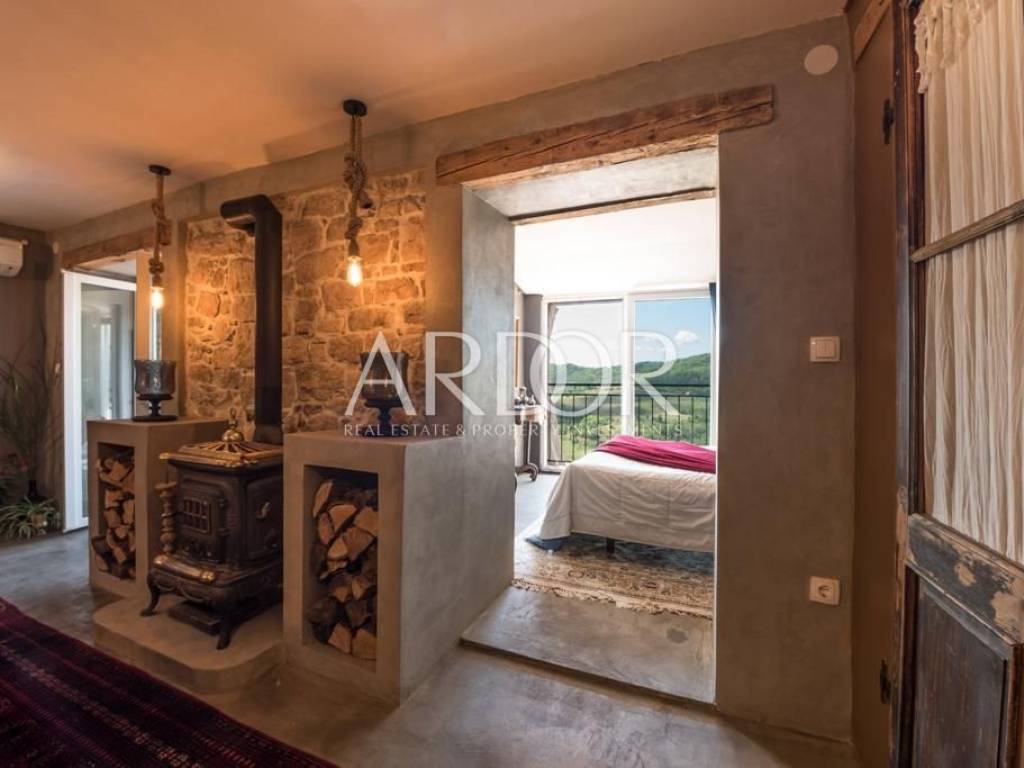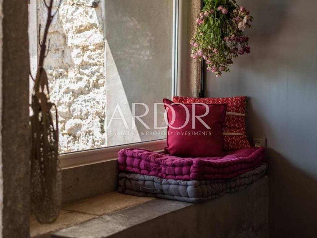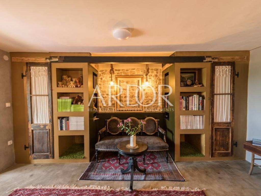 Interijer je raspoređen na tri etaže i uređen u rustikalnom stilu s mnogo drvenih detalja i antiknog namještaja. Na svakoj etaži je po jedan stan sa svojim ulazom izvana ali iako zasebne jedinice funkcioniraju kao jedan prostor, povezan unutarnjim stubištem uz dvije terase i mali vrt.