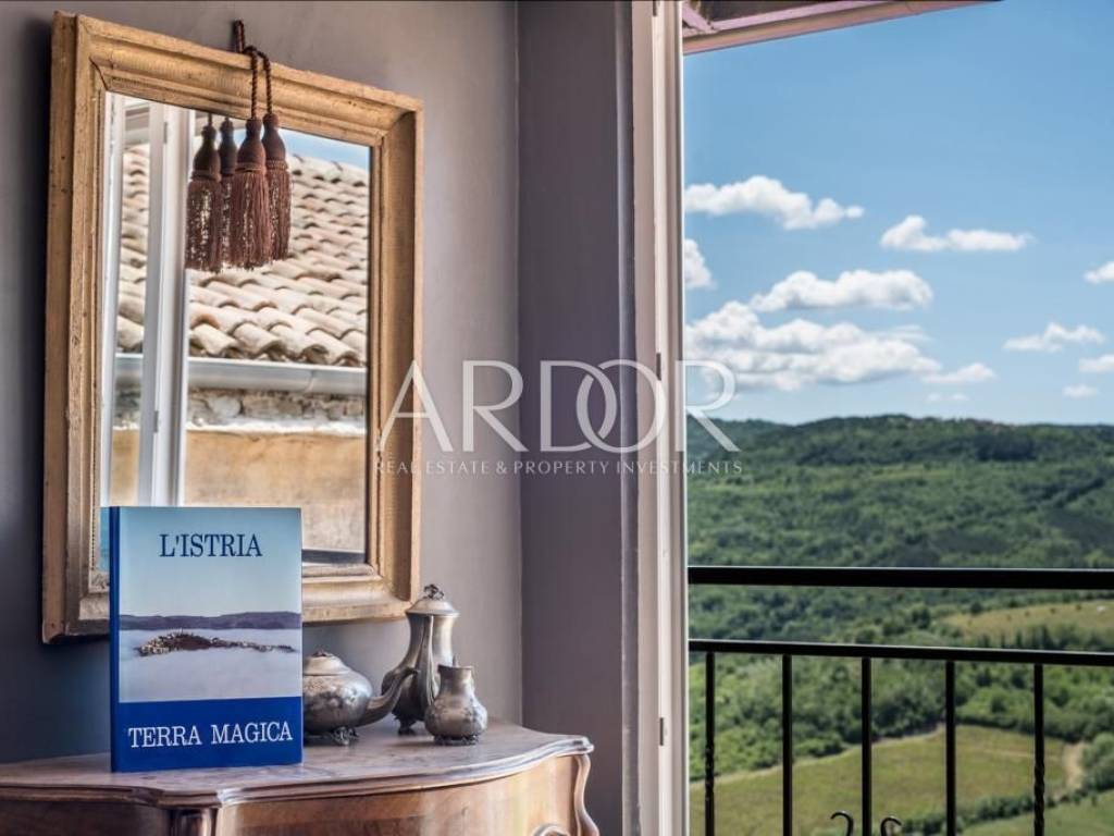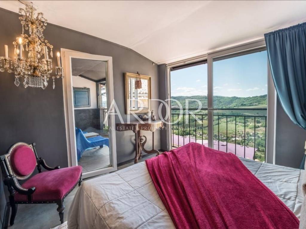 Ova šarmantna eklektično renovirana kuća iz 18. stoljeća, skrivena je u vijugavoj i slikovitoj popločanoj cesti u mirnom dijelu srednjovjekovnog grada Motovuna. Nalazi se na vrhu obrambenog zida s prekrasnim pogledom na raštrkane brežuljke, vinograde i maslinike.