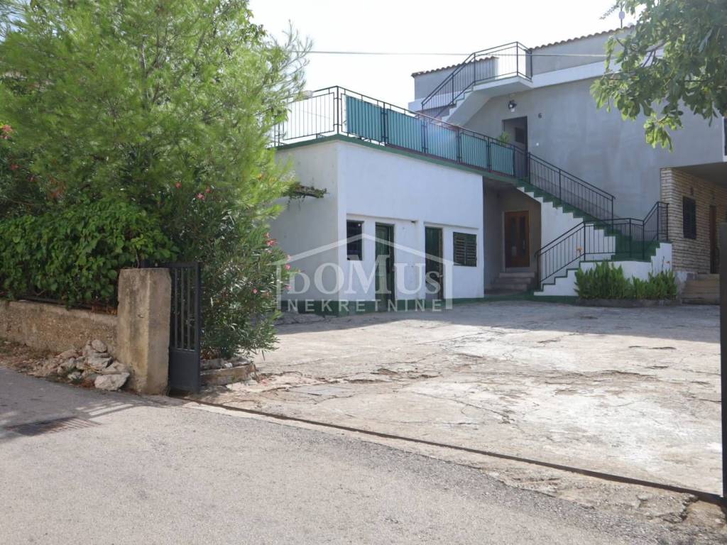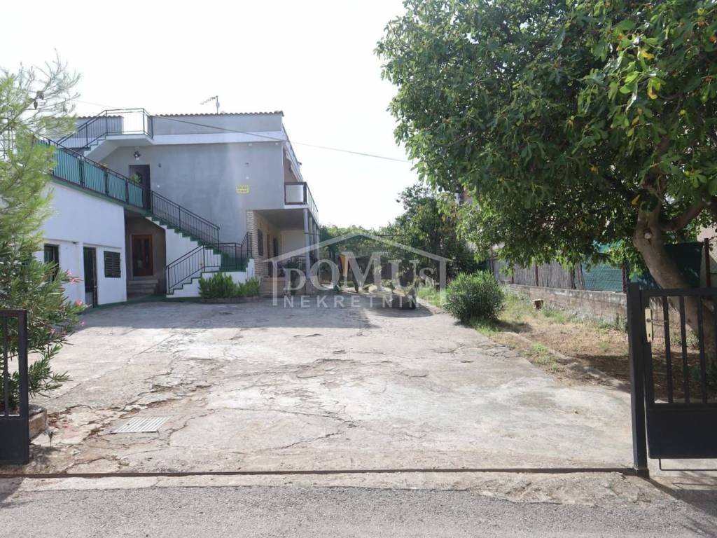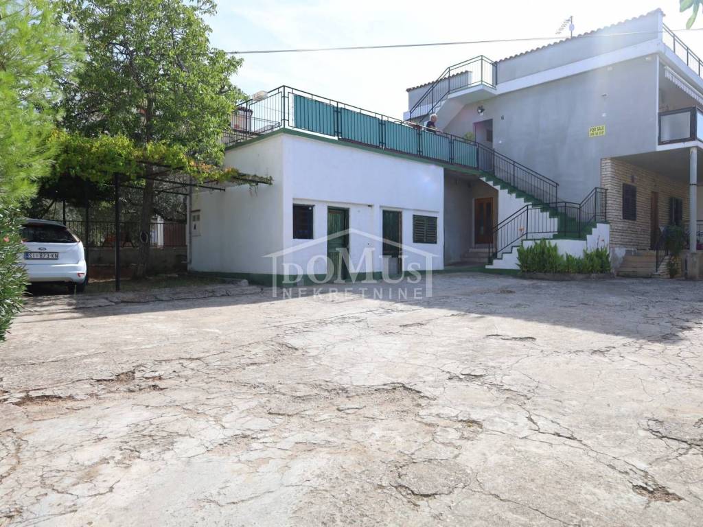 Brodarica, atraktivna lokacija iznad magistrale (30m) nalazi se obiteljska kuća s dvije zasebne stambene jedinice, od kojih se jedna nalazi u prizemlju, a druga na prvom katu. Kuća je starije gradnje, s velikim dvorištem i mogućnošću parkiranja više vozila. Prizemlje kuće je površ. 105,14 m2, a sastoji od dnevnog boravka, kuhinje, kupaone, četiri sobe, te vanjske terase (cca 20m2). Na prvom katu se nalazi stambena jedinica površ. 142,59 m2, raspored je isti kao u prizemlju kuće, ali stambena jedinica na katu ima jednu manju terasu (30,oo m2) i jednu veliku terasu iznad prvog kata površ. 104,25 m2, s prekrasnim pogledom na more. Kuća je udaljena samo 100 m od mora - plaže i oko 500 m od centra mjesta.
