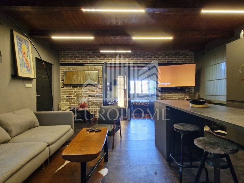 Drugi stan površine oko 110 m² smješten je na prvom katu i razveden je na dvije etaže. Donja etaža sastoji se od ulaznog hodnika, prostranog dnevnog boravka s blagovaonicom i kuhinjom, jedne spavaće sobe, kupaonice, garderobe te terase s pogledom na zelenilo. Gornja etaža je galerijskog tipa, otvorena prema nižoj etaži, a sastoji se od radnog predprostora i dvije spavaće sobe. Stan karakterizira visoki open space, prostran balkon orijentiran prema jugozapadu te vrlo ugodan i svijetao raspored.