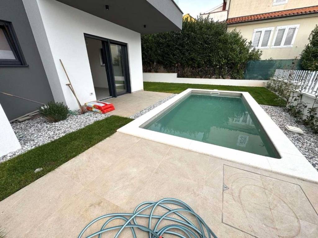 Površina samog stana iznosi 58,20 m2, natkrivena terasa 8,00 m2, dok razliku do 83 m2, čini koeficijentni obračun površine vrta/okućnice s bazenom.