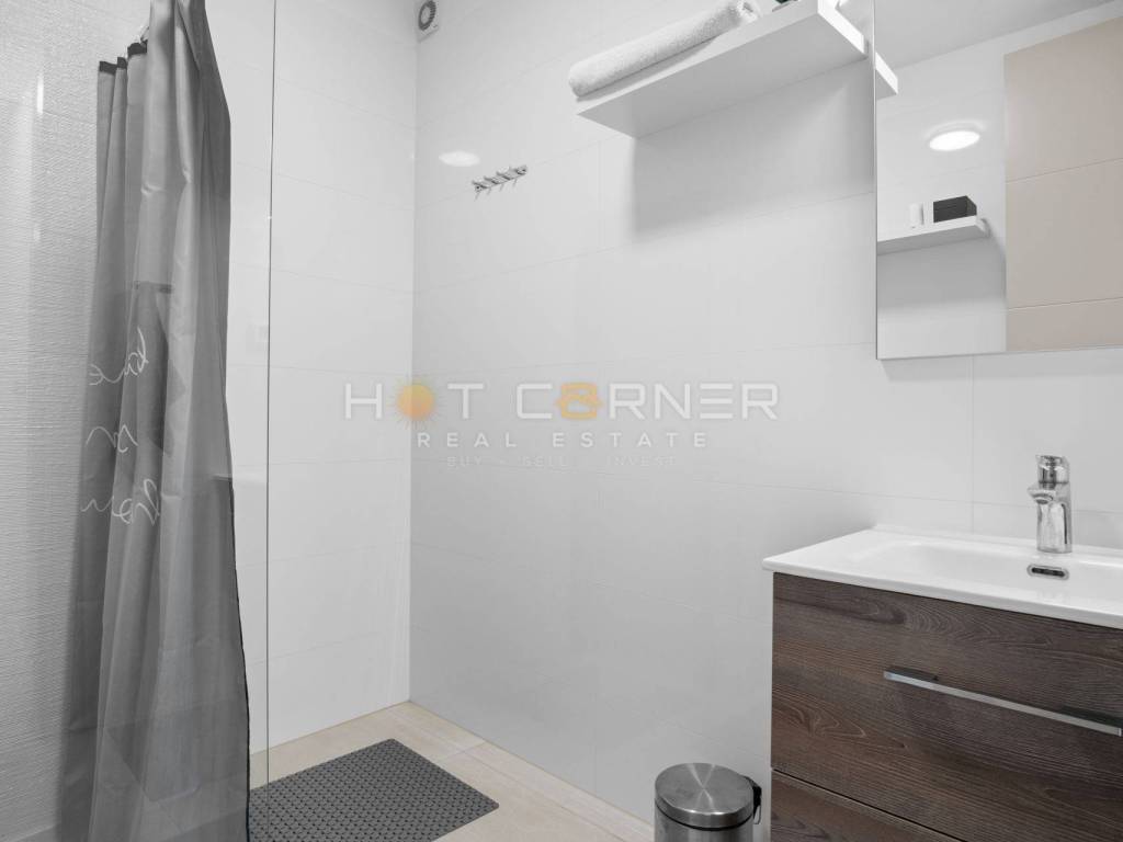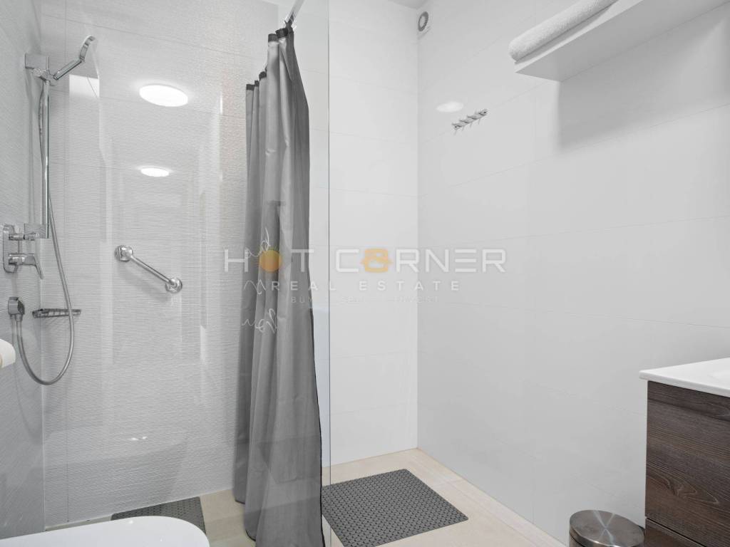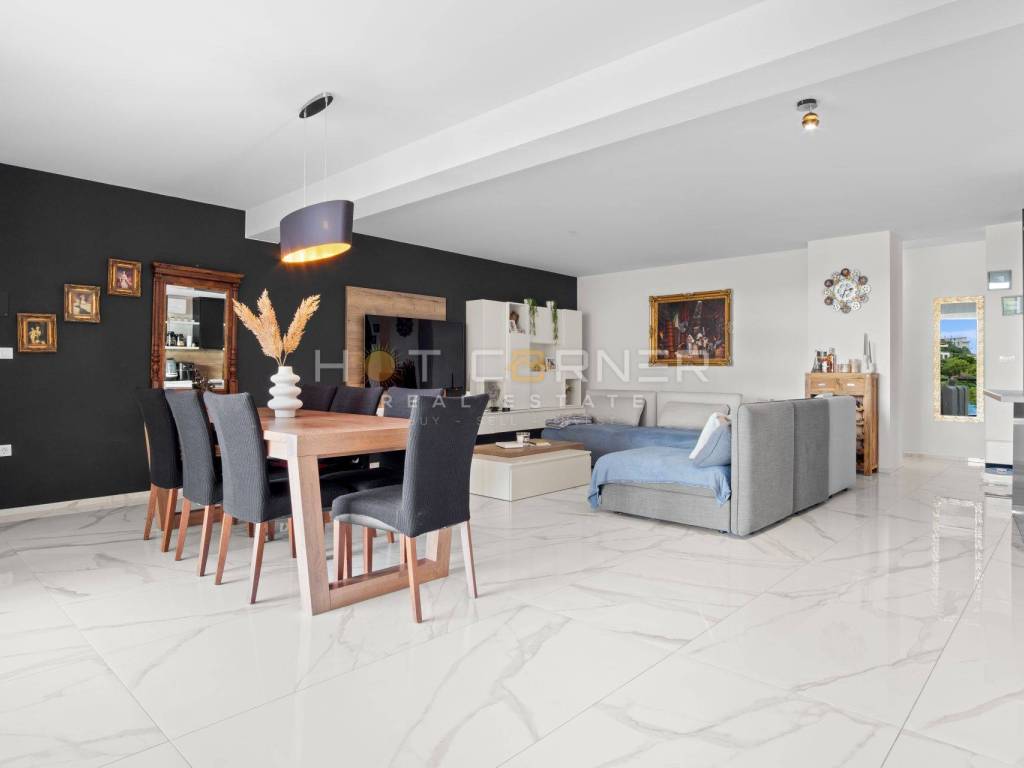 Smješten u prizemlju luksuzne novogradnje, stan nudi prostrani dnevni boravak otvorenog koncepta sa suvremeno opremljenom kuhinjom, iz kojeg se izlazi na veliku natkrivenu terasu. Terasa se nastavlja na privatno dvorište sa sunčalištem i hidromasažnom kadom – savršeno mjesto za opuštanje uz pogled na more i zalaske sunca.