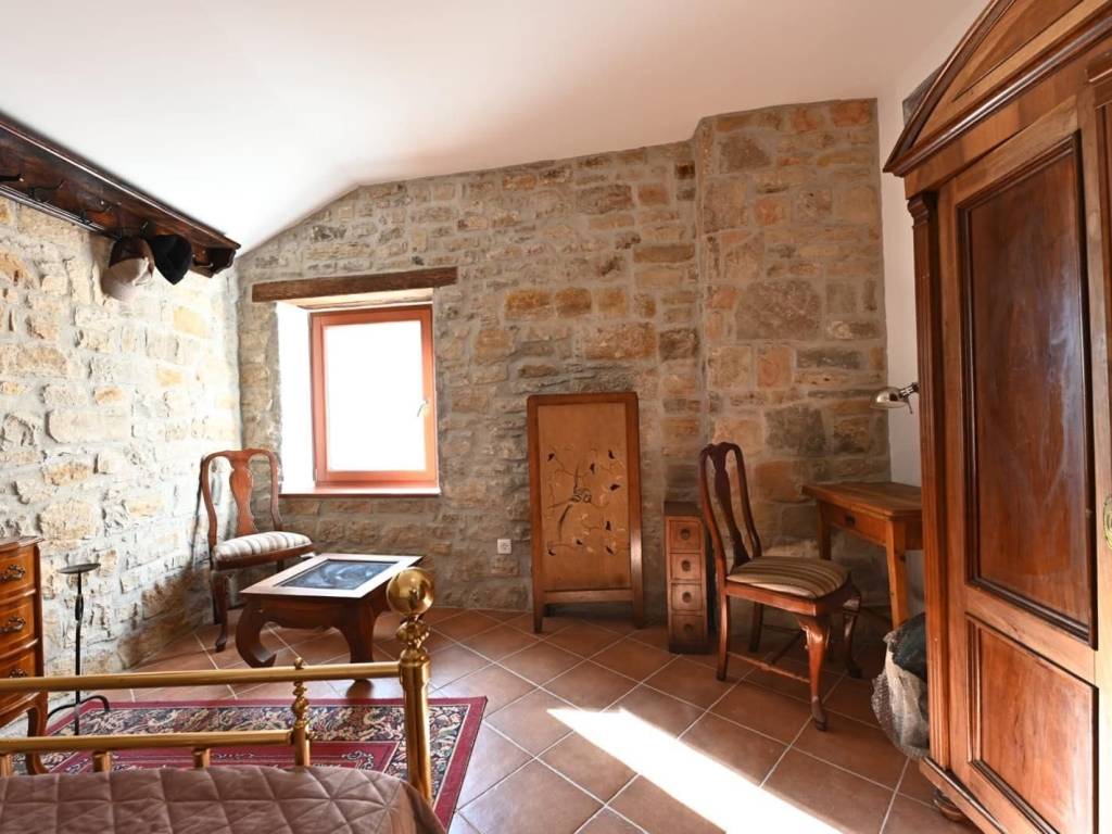 Na katu se nalaze tri spavaće sobe, od kojih glavna ima vlastitu kupaonicu i walk-in garderober, dodatna kupaonica , hodnikom dolazimo na prostranu terasu s otvorenim pogledom na starogradsku jezgru Buja, zelene brežuljke okolice i more u daljini.