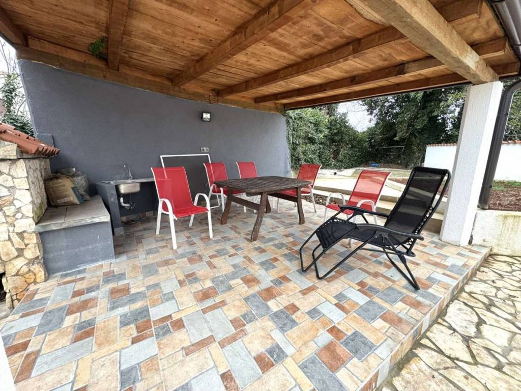 Na prostranom dvorištu površine 360 m2 nalazi se vanjski kamin,roštil i natkrivena nastrešnica za opuštanje i druženje te dva parkirna mjesta.