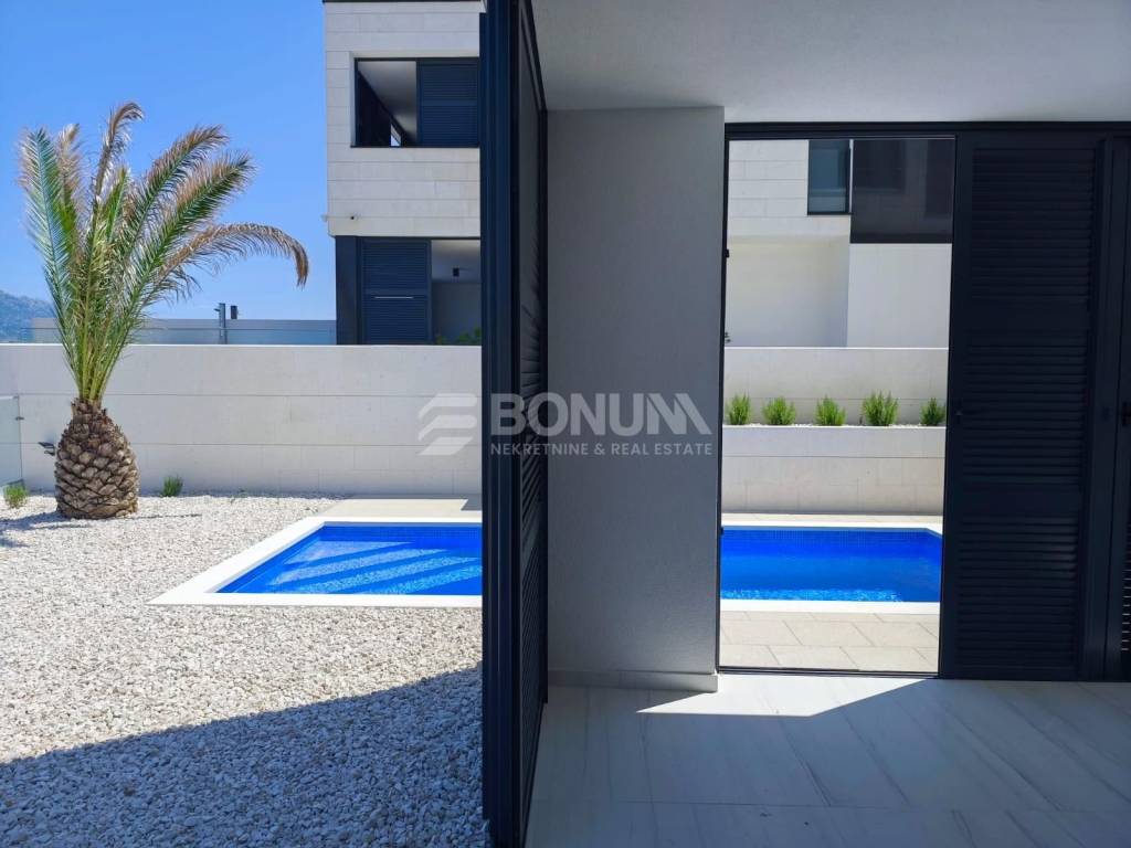 Prodaje se luksuzan apartman (B-E2) s bazenom i prekrasnim pogledom na more. Apartman se sastoji od ulaznog hodnika, dvije spavaće sobe, od kojih jedna ima vlastitu kupaonicu, još jedne kupaonice, zatim dnevnog boravka s kuhinjom i blagovaonicom u jednoj cjelini iz kojeg se izlazi na natkrivenu terasu 33 m2 te dvorište 99 m2 u kojem se nalazi bazen. Apartmanu pripada i jedno parkirno mjesto.
