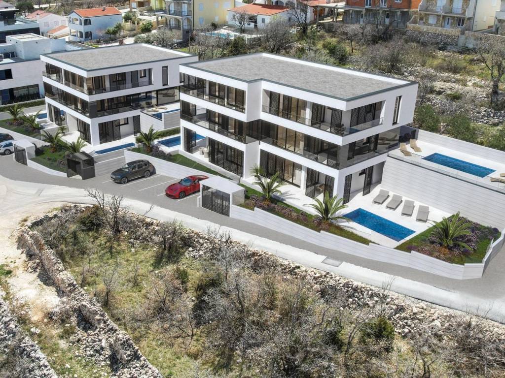 Prodaje se novi luksuzan novi apartman (B-E5) u blizini plaže. Apartman se sastoji ulaznog hodnika, dvije spavaće sobe, dvije kupaonice, spremišta, zatim od dnevnog boravka s kuhinjom i blagovaonicom u jednoj cjelini iz kojeg se izlazi na veliku natkrivenu terasu 24 m2 s koje se pruža prekrasan pogled na more. Apartmanu pripada i jedno parkirno mjesto u dvorišnom dijelu zgrade.