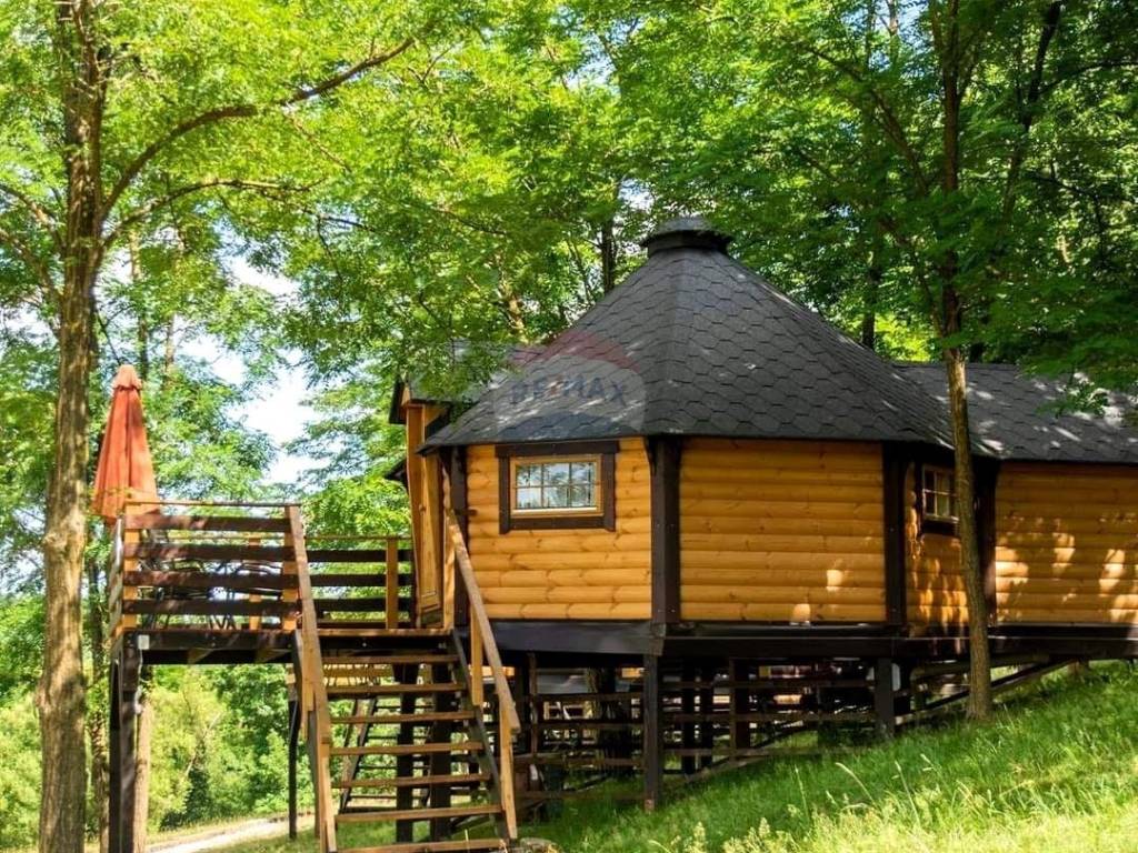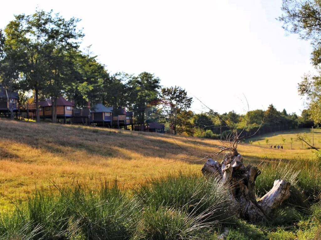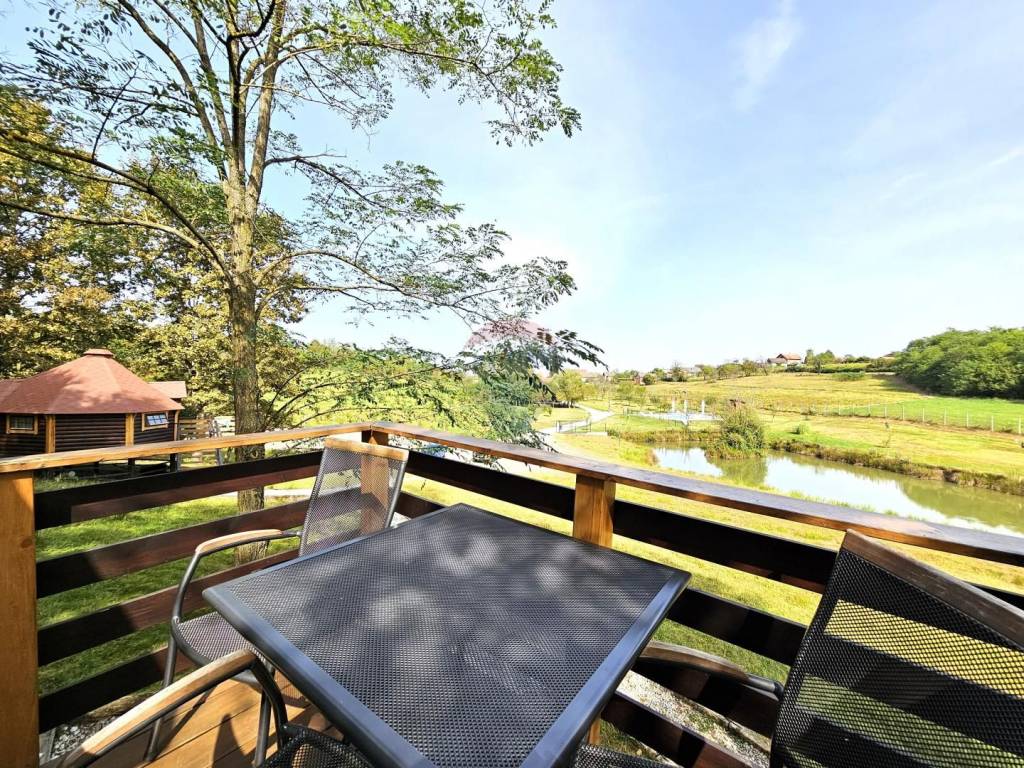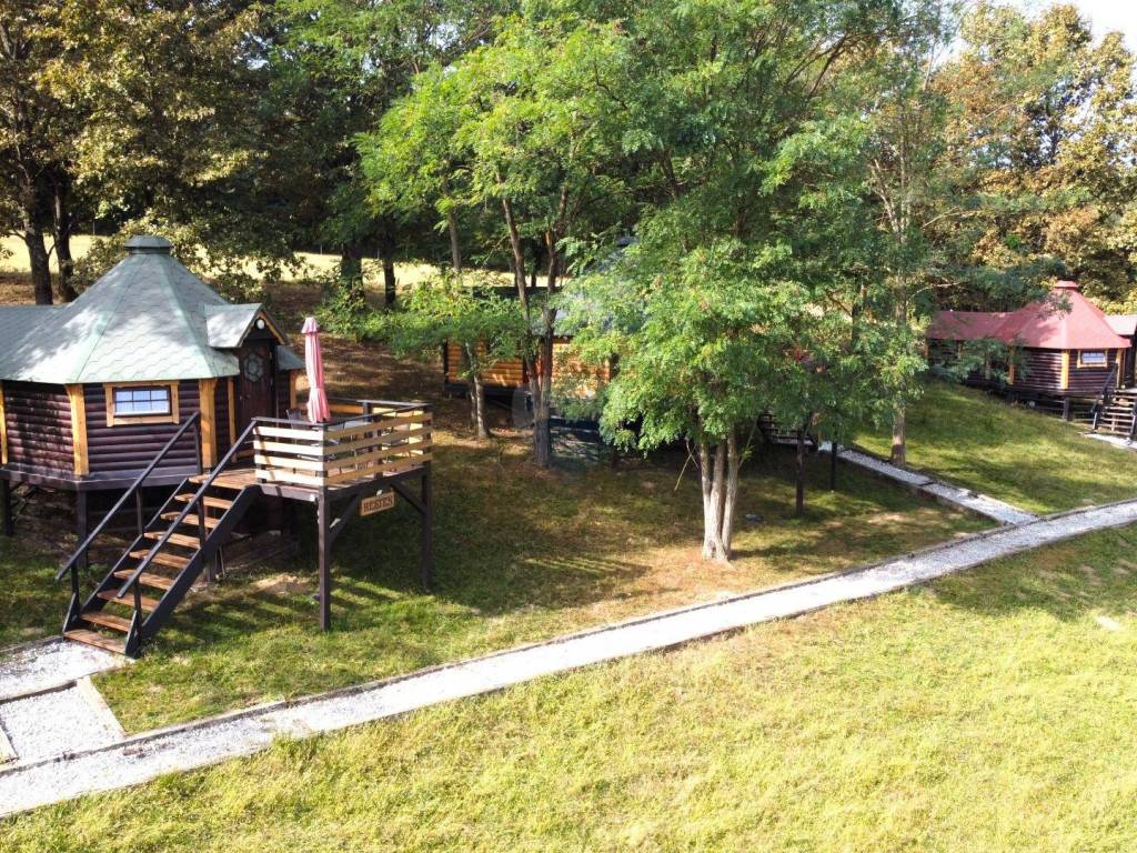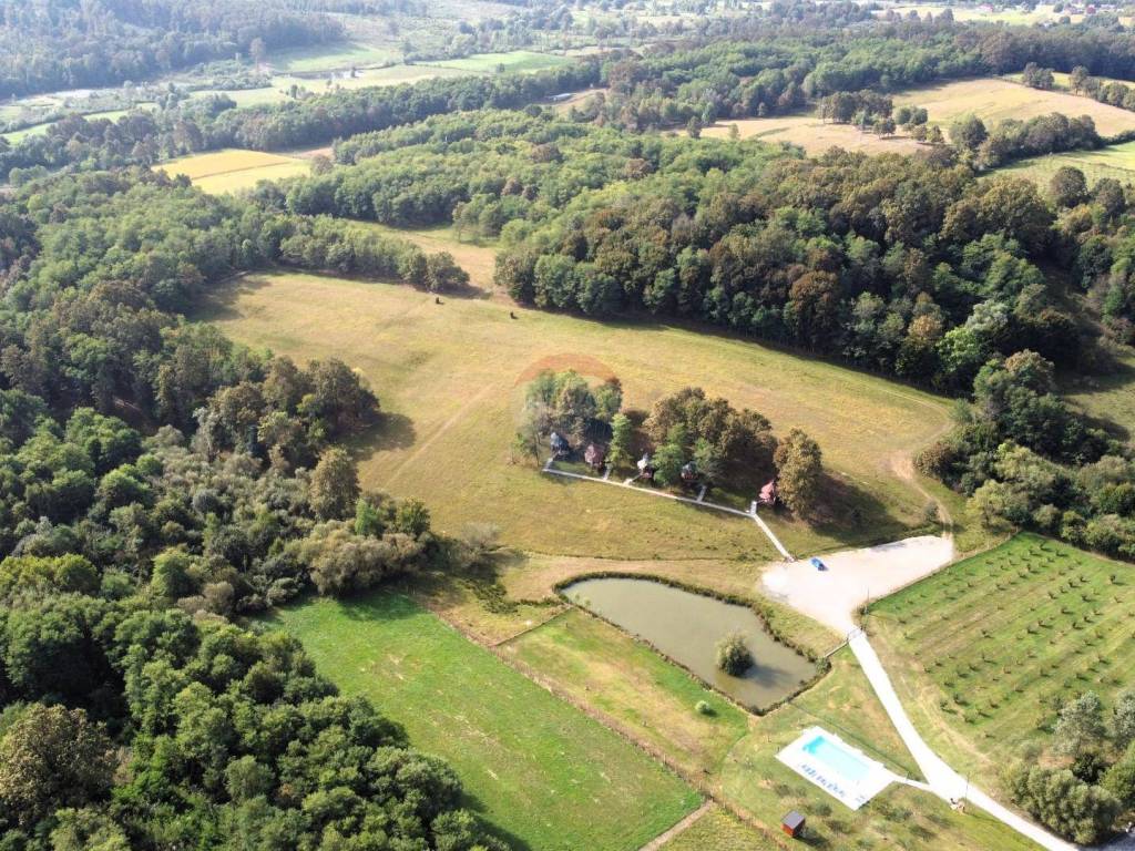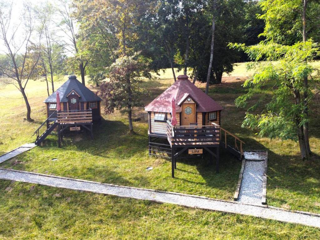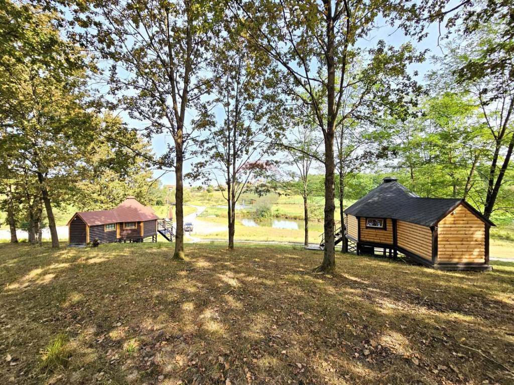 U središnjem, mirnijem dijelu imanja, smješteno je 5 glamping kućica s terasom koja gleda na jezera i okolno zelenilo. Svaka kućica ima 3 kreveta, vlastitu kupaonicu te klima uređaj, wi-fi, TV, hladnjak.
