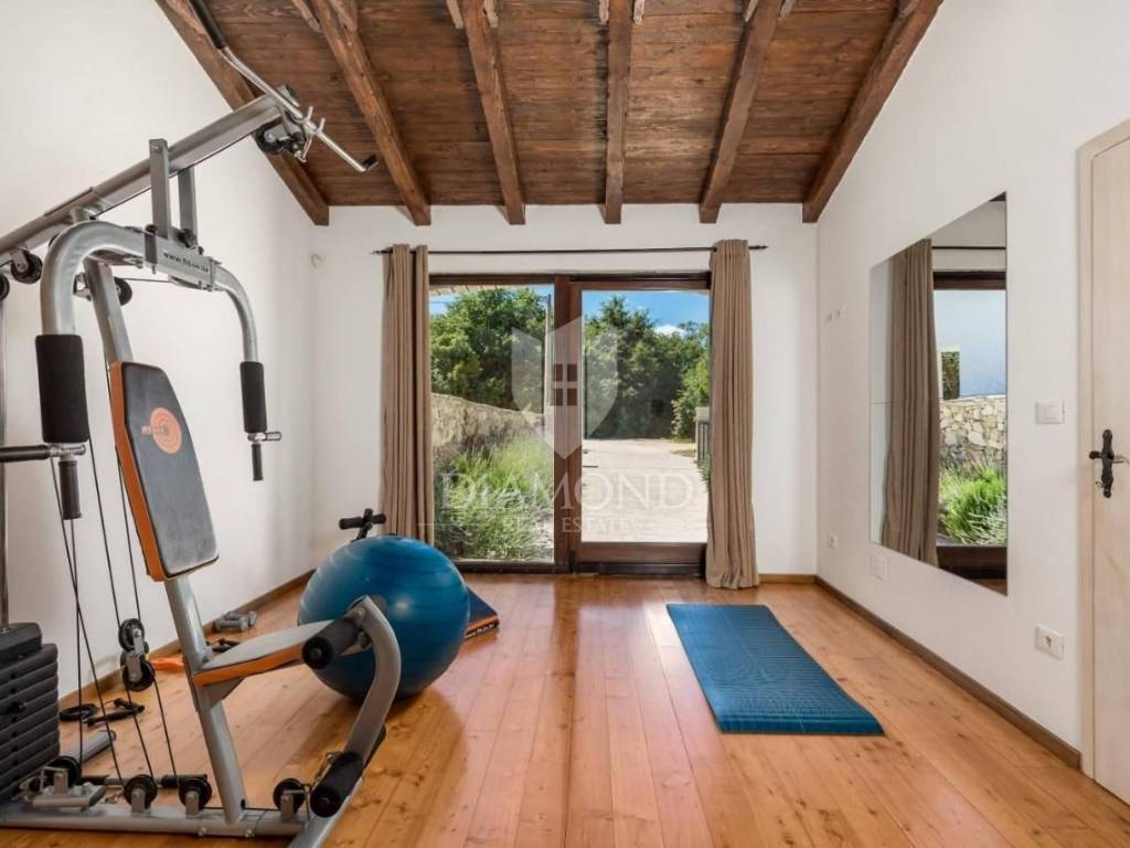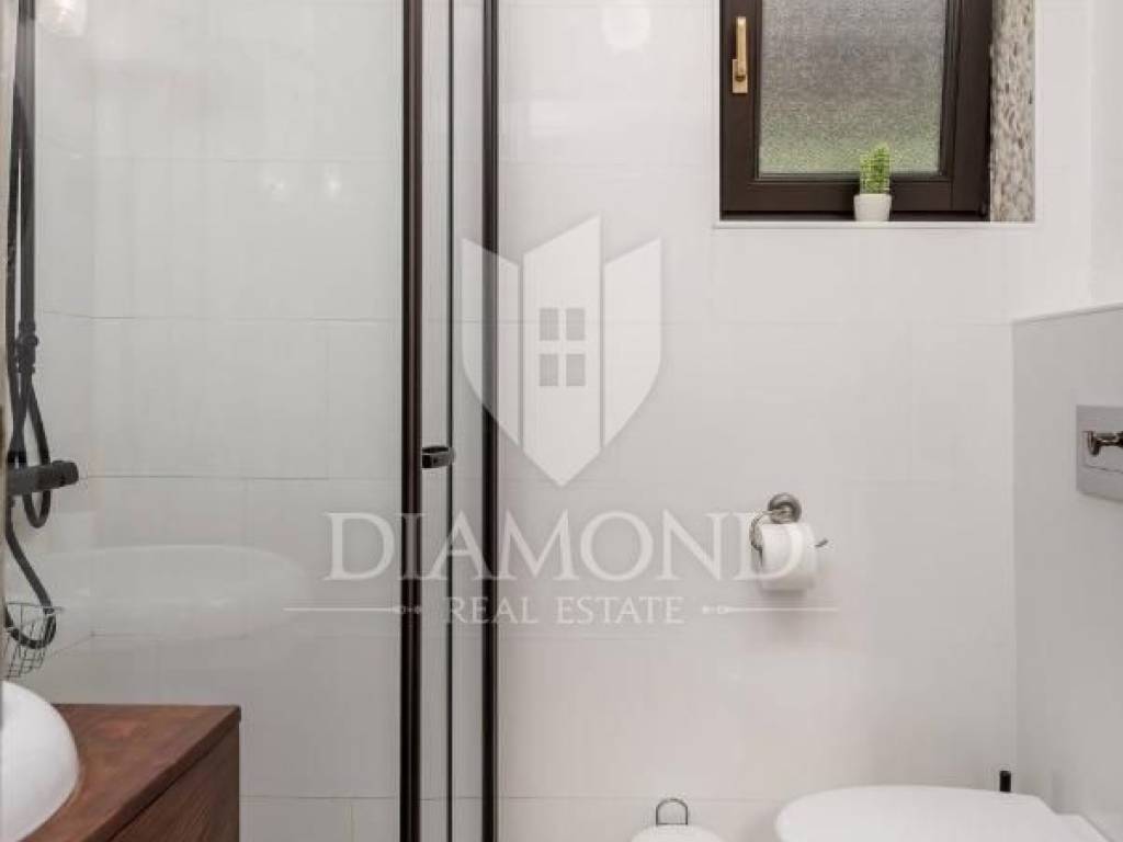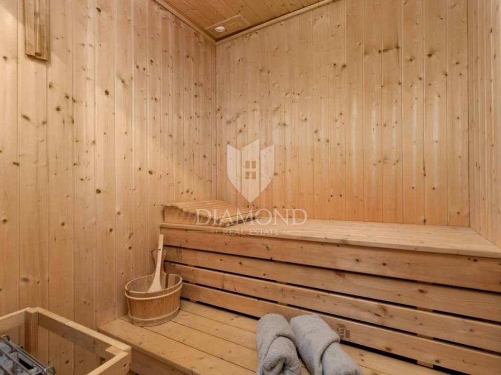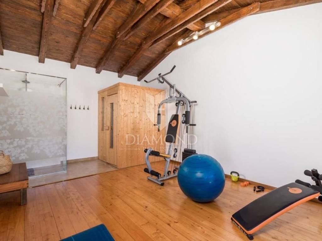 Na terenu veličine 1020 m2 smjestila se ova prekrasna autohtona Villa koncipirana kao katnica ukupne stambene površine 159 m2. Prizemlje obuhvaća potpuno opremljenu kuhinju, blagovaonicu i udoban dnevni boravak. Tu se nalazi i fitness soba sa saunom i tušem, kupaonica, spavaća soba te praonica. Na katu se nalaze dvije komforne spavaće sobe i jedna kupaonica sa hidromasažnom kadom. Pitanje grijanja i hlađenja riješeno je klima uređajima u svakoj sobi, kaminom na pelete u dnevnom dijelu a u svim kupaonicama postavljeno je i podno grijanje što ovu nekretninu čini ugodnom za život i boravak tijekom cijele godine.