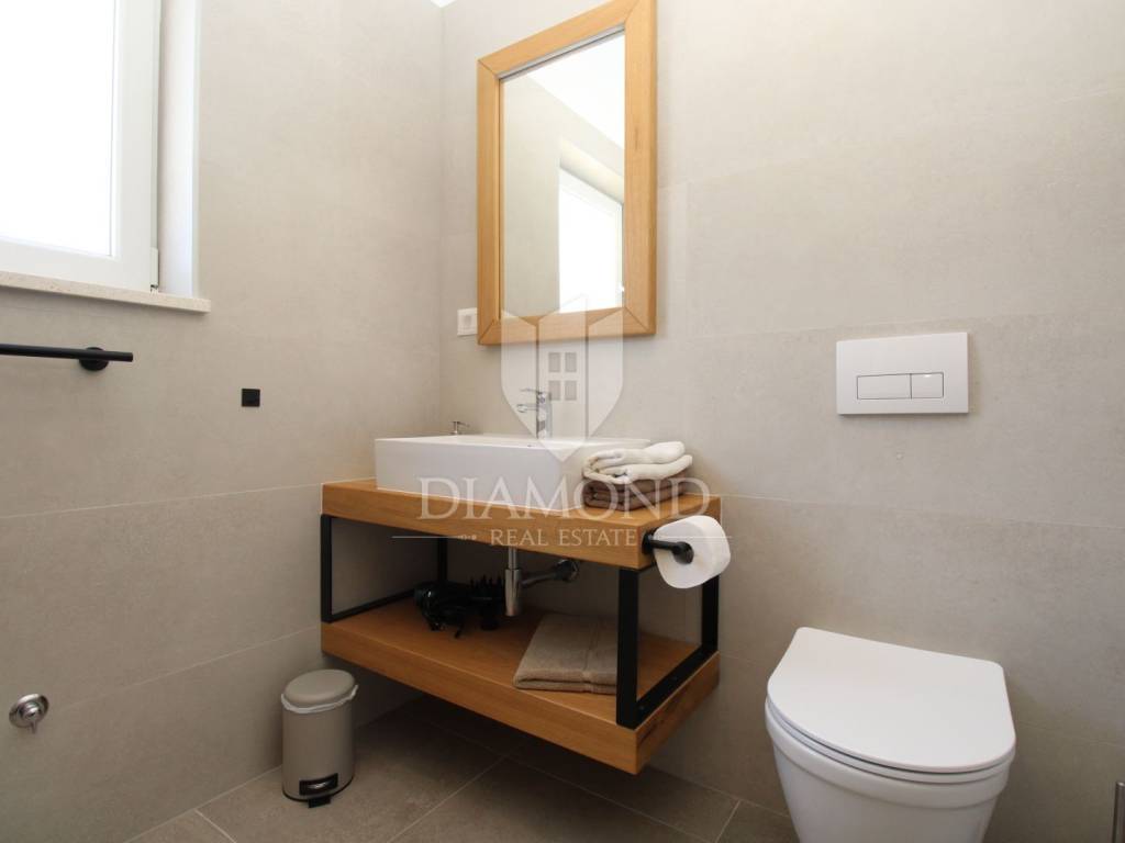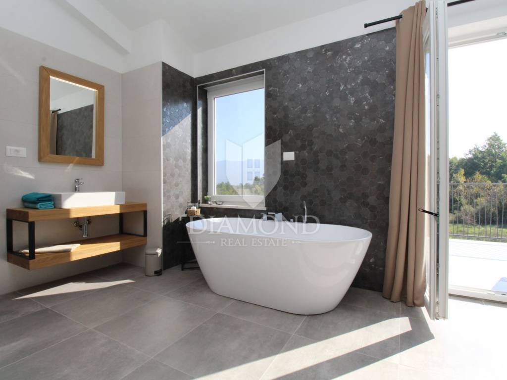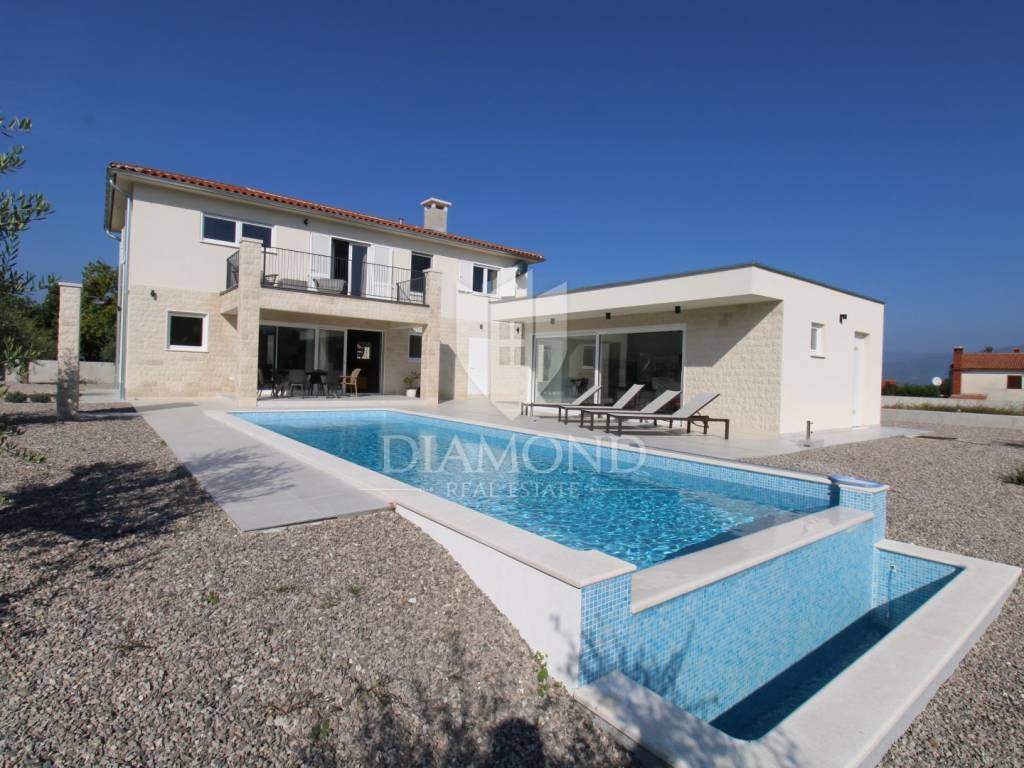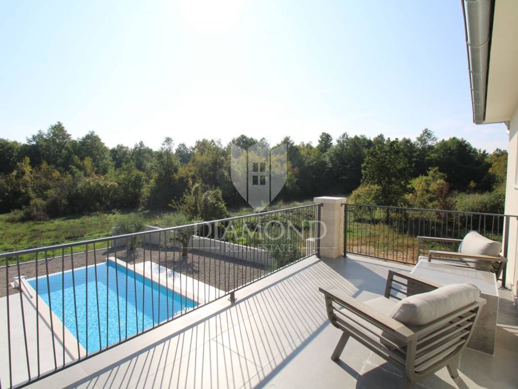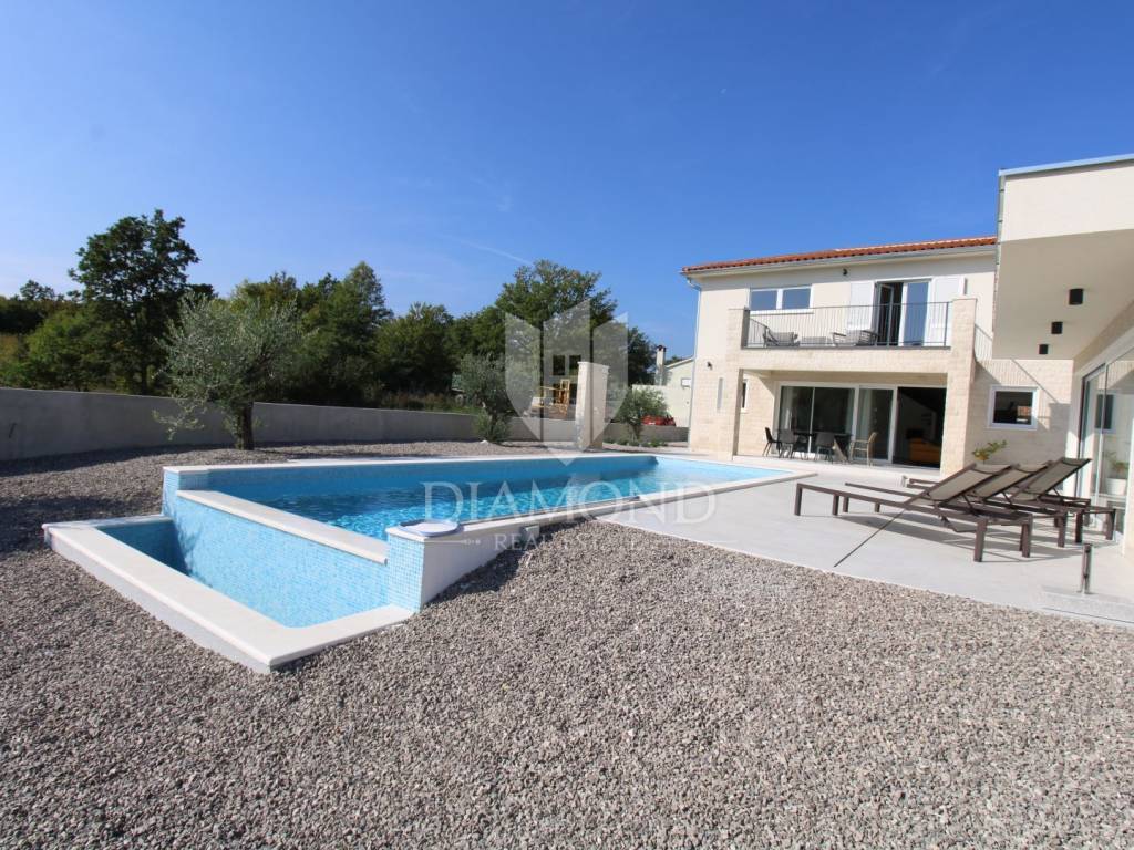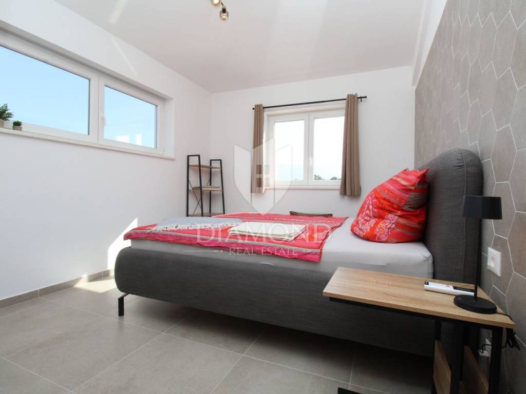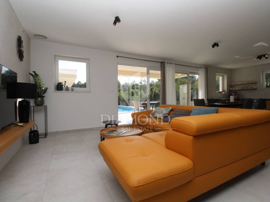 Na rubu manjeg naselja udaljenog od Labina 13 kilometara, prodajemo ovu novoizgrađenu kuću za odmor. Kuća je koncipirana kao katnica ukupne površine 180 m2. Kat predstavlja noćni dio sa tri spavaće sobe i tri kupaonice. Master spavaća soba ima i izlaz na balkon sa lijepim pogledom na bazen i okolno zelenilo. Prizemlje se sastoji od velikog, svijetlog prostora u koji je uklopljena potpuno opremljena kuhinja, blagovaonica i komforan dnevni boravak sa velikim staklenim stijenama kao poveznicama sa vanjskom terasom i plažom bazena. U prizemlju se nalazi i jedan gostinjski toalet te ostava. Interijer je modernog dizajna sa udobnim i funkcionalnim namještajem. U svakoj prostoriji postavljen je klima uređaj a kuća ima i podno grijanje. Postoji mogućnost i ugradnje peći u dnevni prostor.