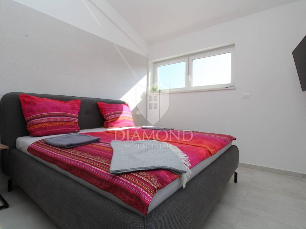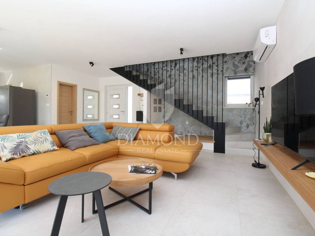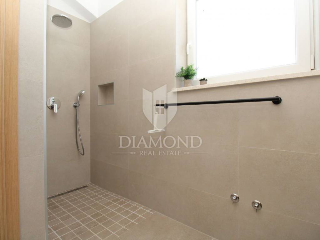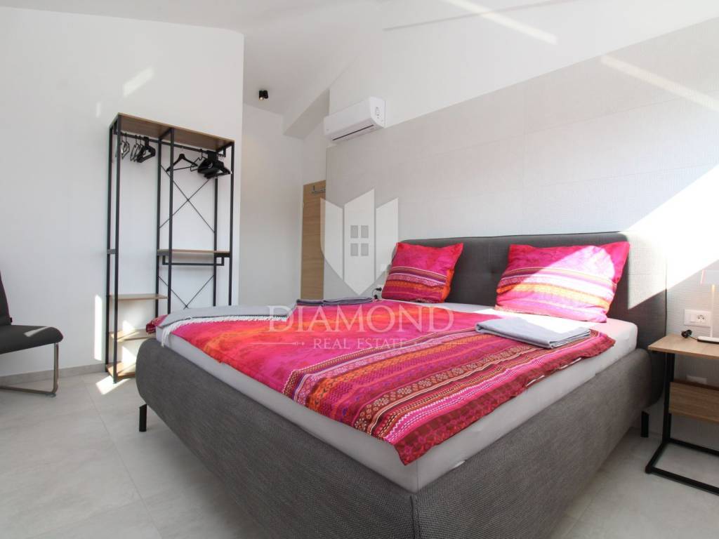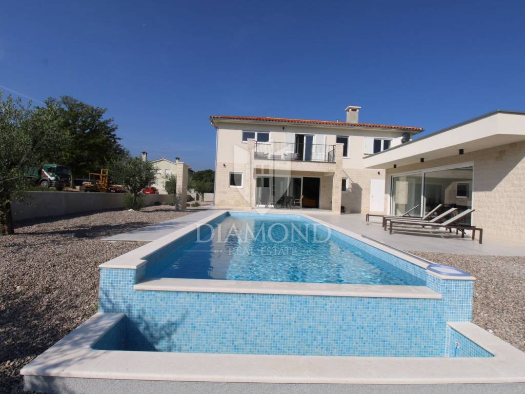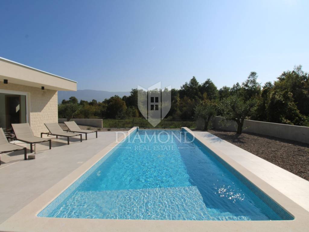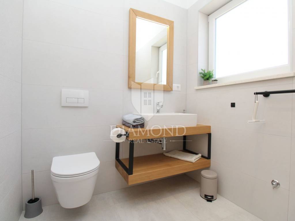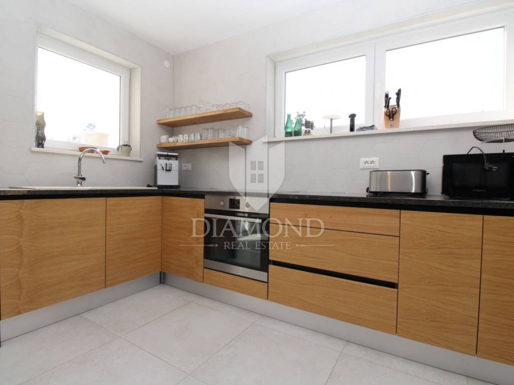 Na rubu manjeg naselja udaljenog od Labina 13 kilometara, prodajemo ovu novoizgrađenu kuću za odmor. Kuća je koncipirana kao katnica ukupne površine 180 m2. Kat predstavlja noćni dio sa tri spavaće sobe i tri kupaonice. Master spavaća soba ima i izlaz na balkon sa lijepim pogledom na bazen i okolno zelenilo. Prizemlje se sastoji od velikog, svijetlog prostora u koji je uklopljena potpuno opremljena kuhinja, blagovaonica i komforan dnevni boravak sa velikim staklenim stijenama kao poveznicama sa vanjskom terasom i plažom bazena. U prizemlju se nalazi i jedan gostinjski toalet te ostava. Interijer je modernog dizajna sa udobnim i funkcionalnim namještajem. U svakoj prostoriji postavljen je klima uređaj a kuća ima i podno grijanje. Postoji mogućnost i ugradnje peći u dnevni prostor.