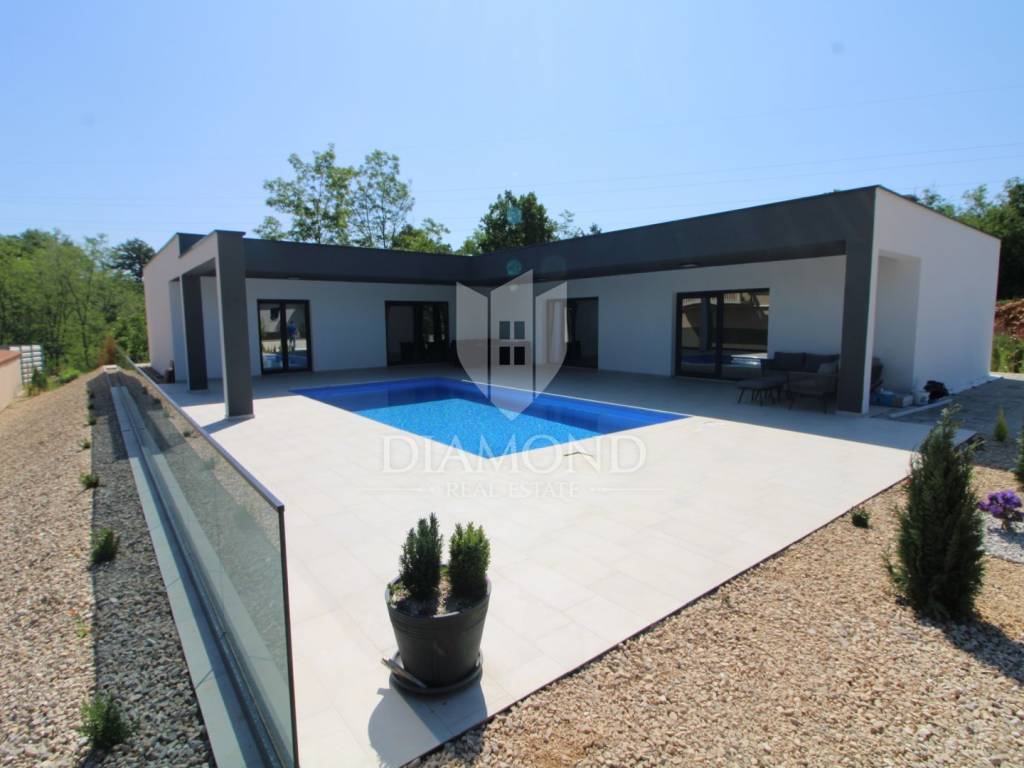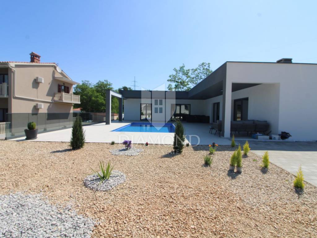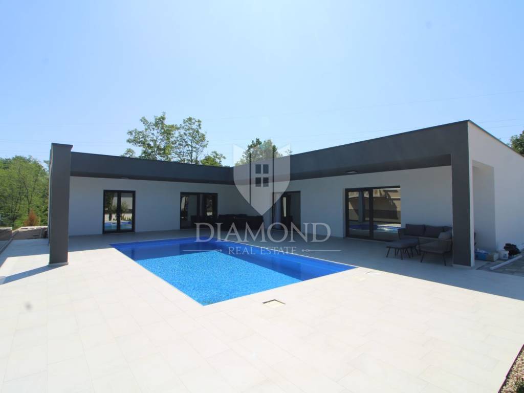 Na parceli veličine 1011 m2 smjestila se ova novoizgrađena kuća za odmor s bazenom. Kuća je ukupne površine 187.40 m2, koncipirana je kao prizemnica a sastoji se od tri spavaće sobe sa vlastitim kupaonicama, gostinjskog toaleta te open space prostor koji objedinjuje kuhinju, blagovaonicu i dnevni boravak sa velikim staklenim stijenama koje osiguravaju dovoljno prirodnog svjetla i prozračnost prostora. Dnevni prostor povezan je direktno sa vanjskom natkrivenom terasom i plažom bazena. Zasebni ulaz izvana imaju praonica i tehnička soba.