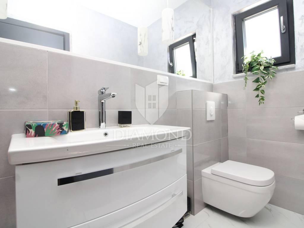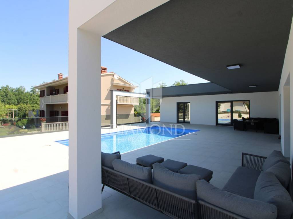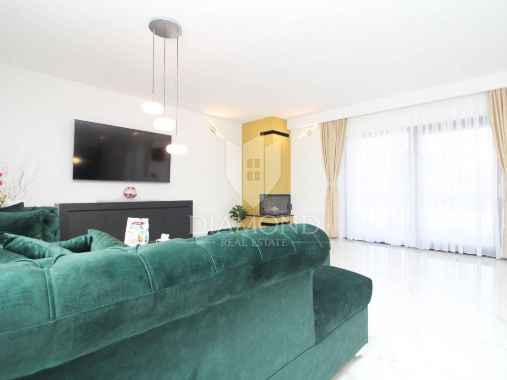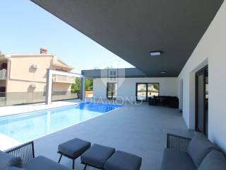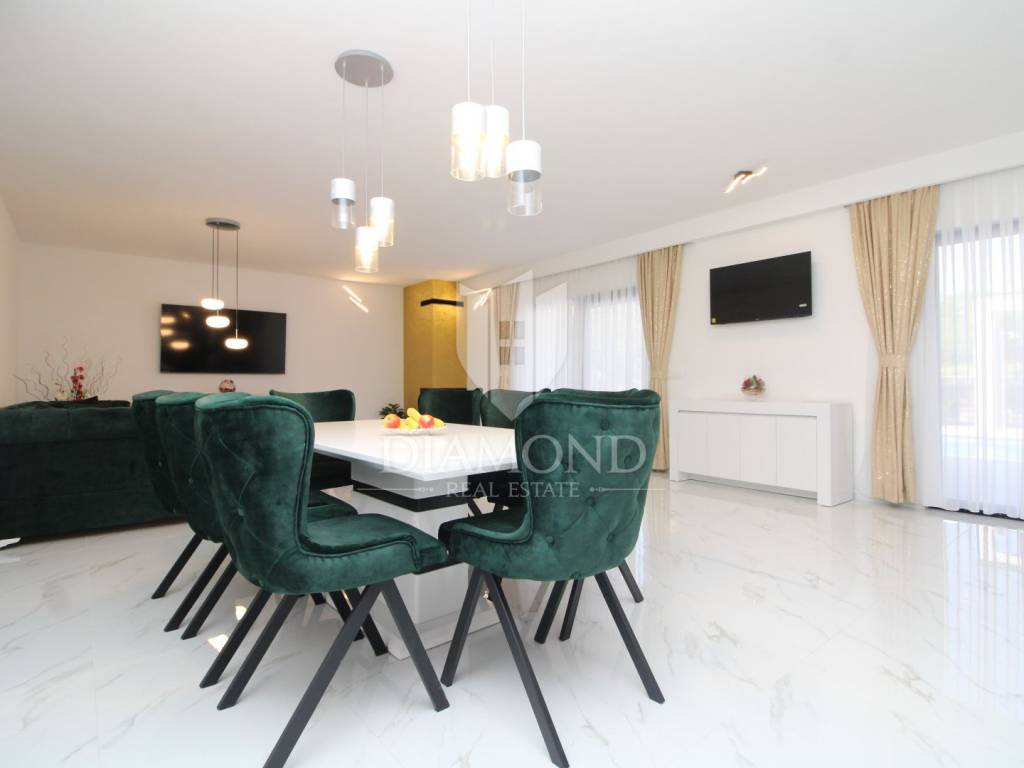 Prostrana okućnica osigurava komociju - dovoljno zelenih površina, parking za dva automobila a centar pozornosti svakako zauzima grijani bazen sa slanom vodom veličine 32 m2.