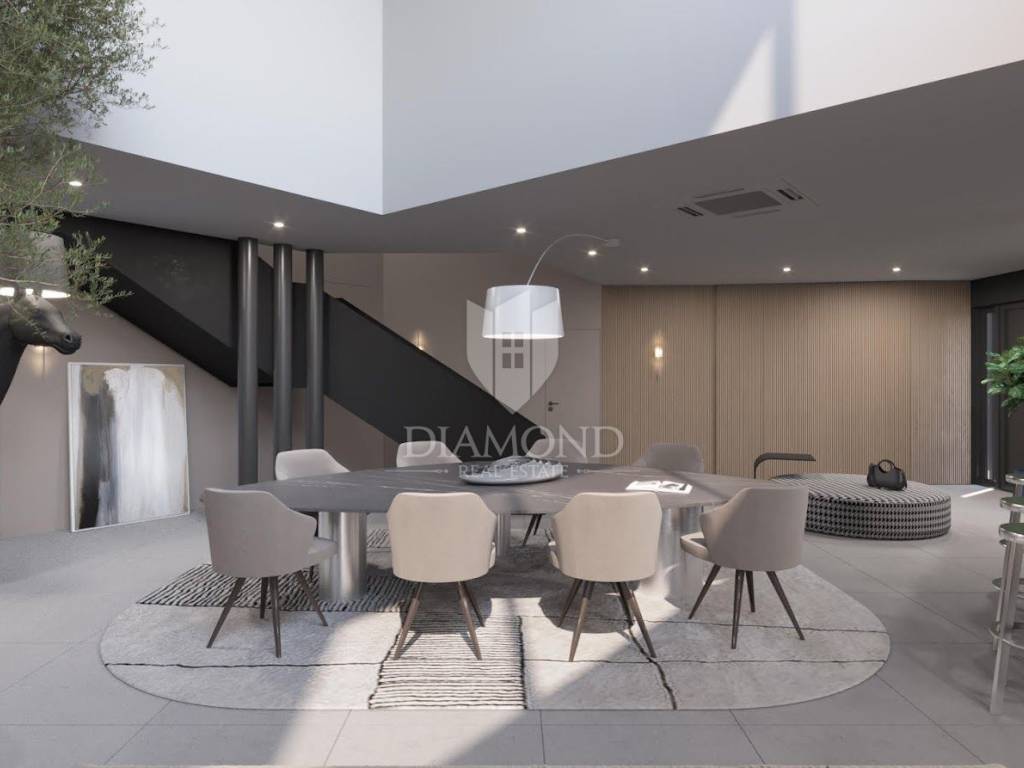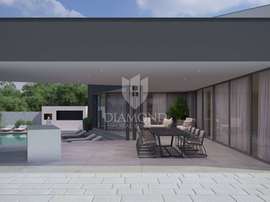 Ova prekrasna Villa modernog dizajna ukupne je kvadrature 506 m2 a sastoji se od prizemlja i kata. Prizemlje je otvorenog koncepta prostora koji objedinjuje kuhinju sa blagovaonicom i komforan dnevni boravak. Tu se nalazi i gostinjski toalet te praonica, spavaća soba sa vlastitom kupaonicom te wellness zona sa kućnom teretanom, hidromasažnom kadom, saunom i kupaonicom. Kroz cijelo prizemlje postavljeno je podno grijanje preko dizalice topline te klima uređaji u svakoj prostoriji. Postoji i mogućnost ugradnje kamina u dnevnom boravku, po želji kupca.
