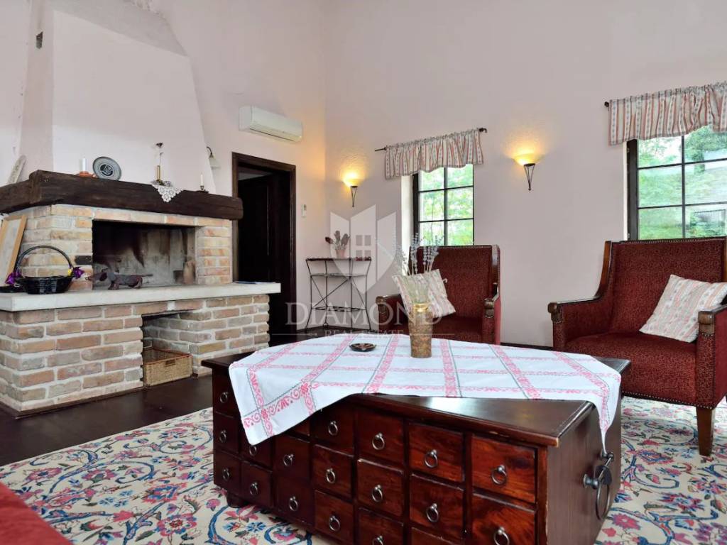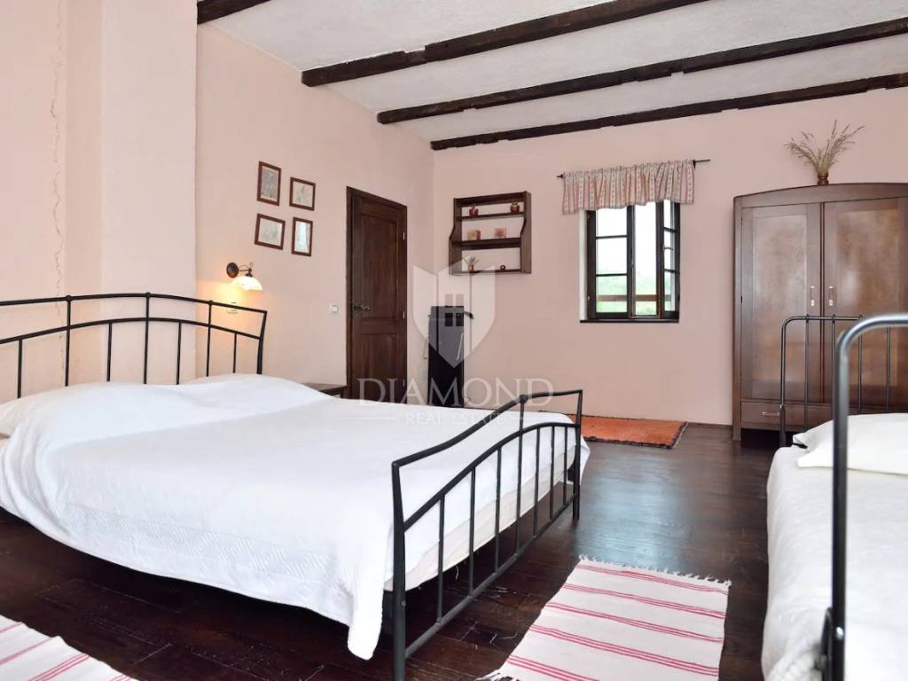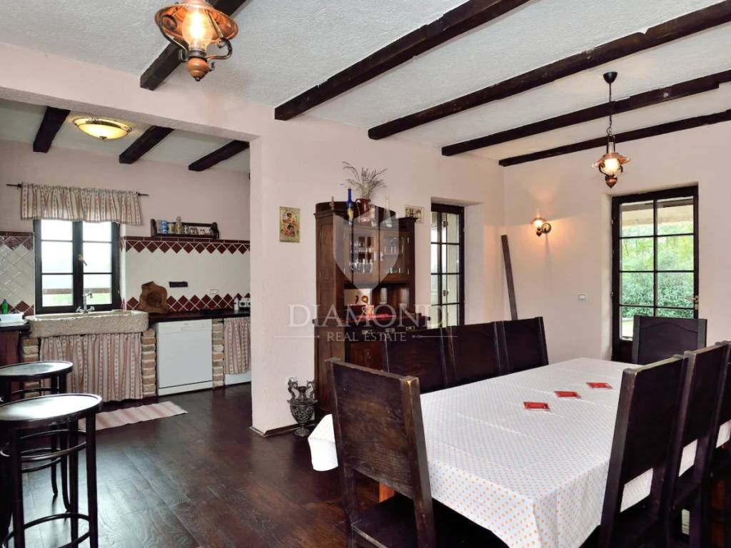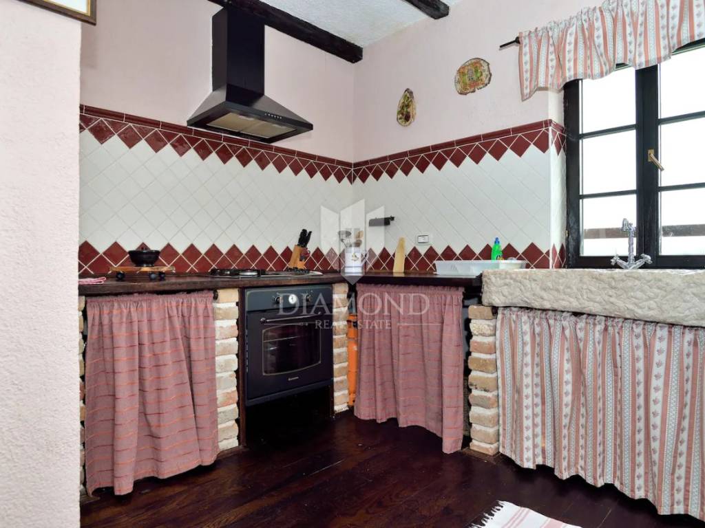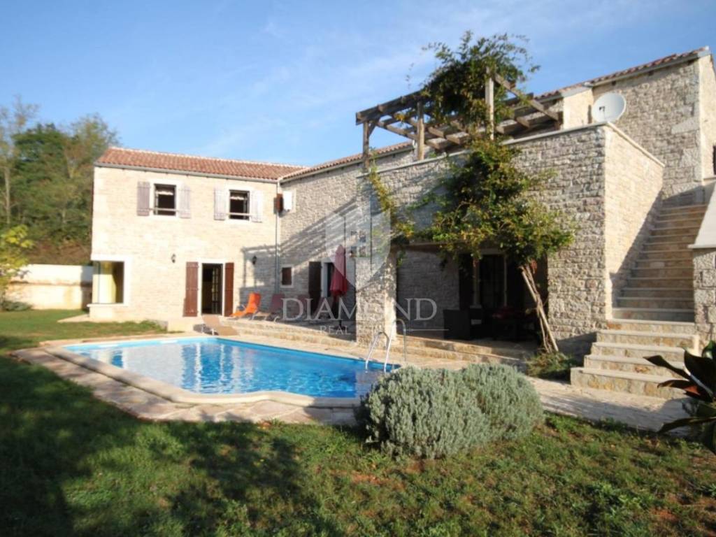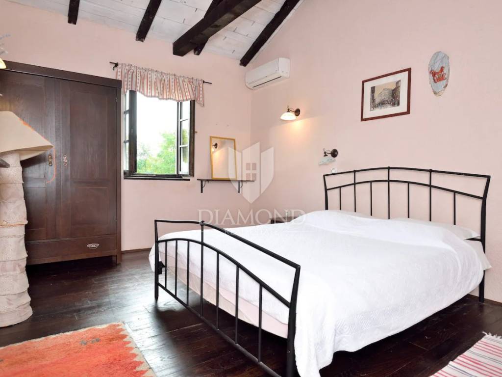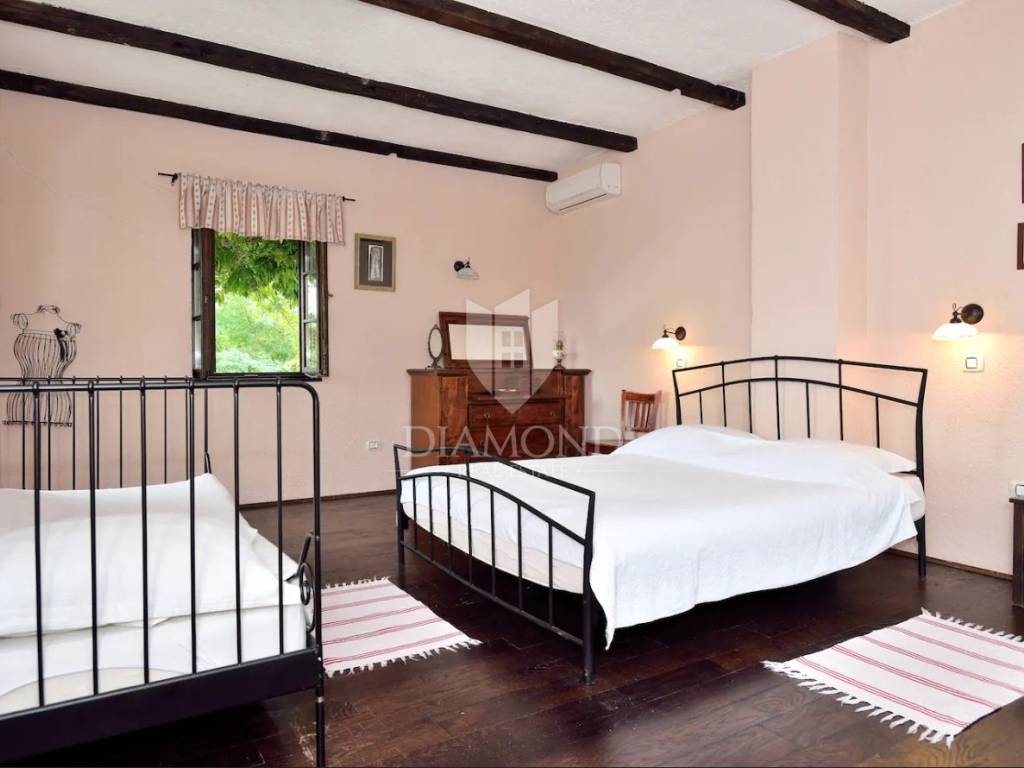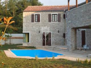 Ova prekrasna kuća za odmor tradicionalnog dizajna koncipirana je kao katnica, ukupne površine 294 m2 a smještena je na prostranoj parceli veličine 1000 m2. Kuća je građena kvalitetnim materijalima i opremljena u tradicionalnom stilu koji nudi funkcionalnost ali i udobnost. Prevladavaju prirodni materijali poput kamena i drveta čiji su detalji prožeti cijelim interijerom. Na katu se nalaze ukupno četiri spavaće sobe od kojih je jedna master soba sa en-suite kupaonicom i izlazom na balkon s kojeg se pruža prekrasan pogled na okolnu netaknutu prirodu, dok ostale spavaće sobe dijele jednu zajedničku kupaonicu. Prizemlje obuhvaća komforan dnevni boravak, potpuno opremljenu kuhinju i blagovaonicu sa izlazom na natkrivenu terasu koja nadgleda bazen i uređenu okućnicu. Tu se nalazi i wellness zona sa saunom i mini teretanom. Pitanje grijanja i hlađenja riješeno je postavljenim klima uređajima u svim prostorijama, klasičnim istarskim kaminom u dnevnom prostoru te podno grijanje u svim kupaonicama. Kuća ima i postavljene solarne panele za proizvodnju vlastite električne energije.