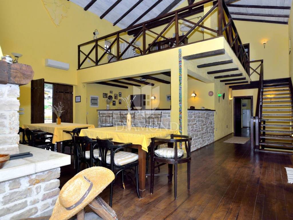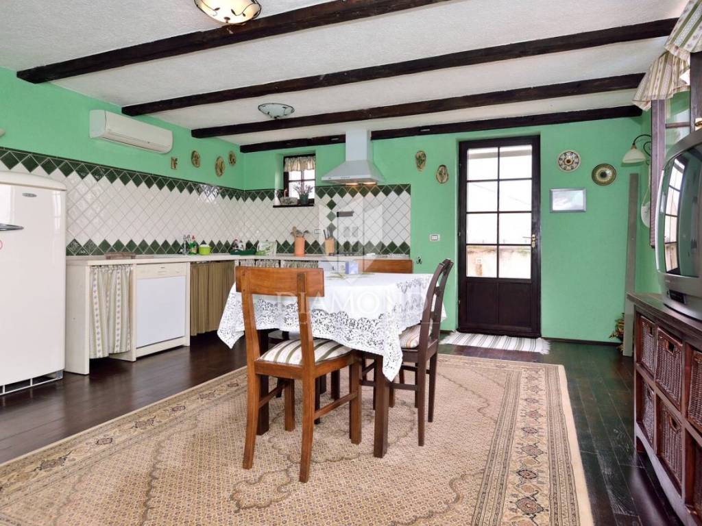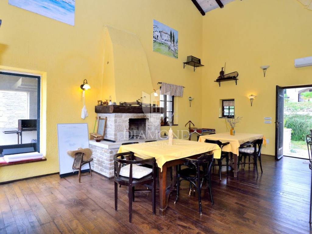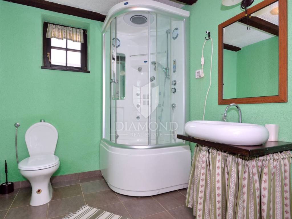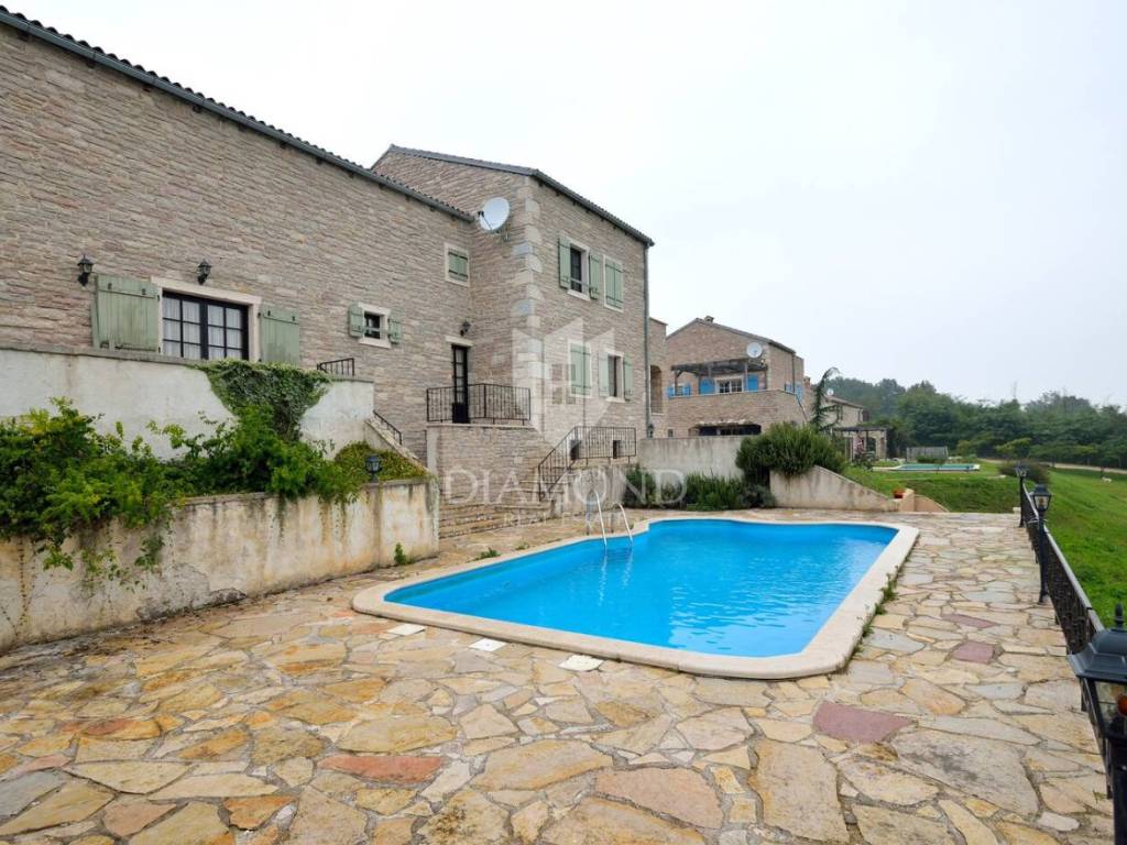 Tradicionalno dizajnirana istarska kamena kuća koncipirana je kao katnica sa podrumom, prizemljem i katom sveukupne površine 323 m2. U podrumu je smješten veliki vinski podrum, praonica, garderoba te dva toaleta. Tu se nalazi i wellness zona sa saunom i nekoliko sprava za vježbanje. Prizemlje je koncipirano kao otvoreni prostor koji obuhvaća blagovaonicu sa barom i kuhinjom te manji apartman koji ima i zaseban ulaz a gdje je smještena spavaća soba sa vlastitom kupaonicom te dnevni boravak i kuhinja. Na katu se nalazi još jedan manji apartman koji također ima zaseban ulaz a koji obuhvaća dvije spavaće sobe, kupaonicu, dnevni boravak i kuhinju s blagovaonicom. Sve prostorije u kući su klimatizirane a provedeno je i podno grijanje u svim kupaonicama. Također, kuća je energetski neovisna sa solarnim panelima za proizvodnju vlastite električne energije.