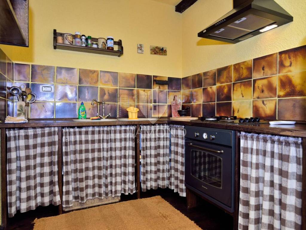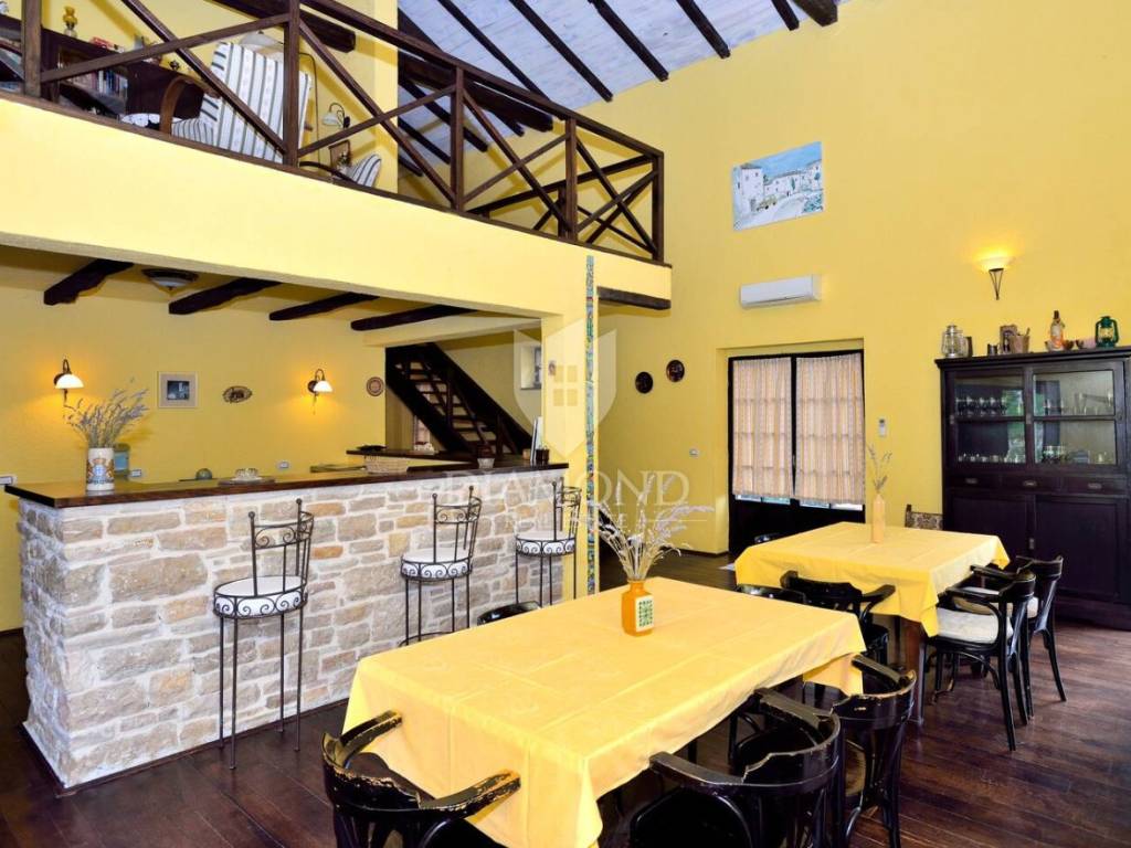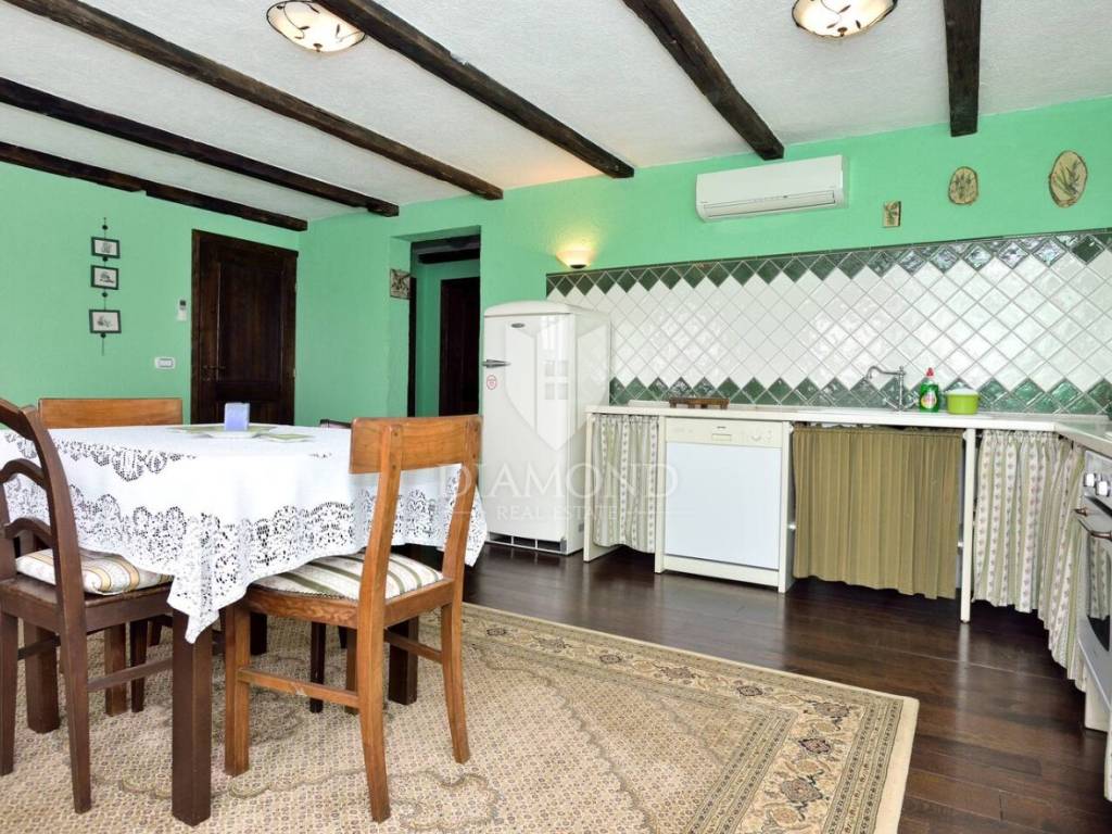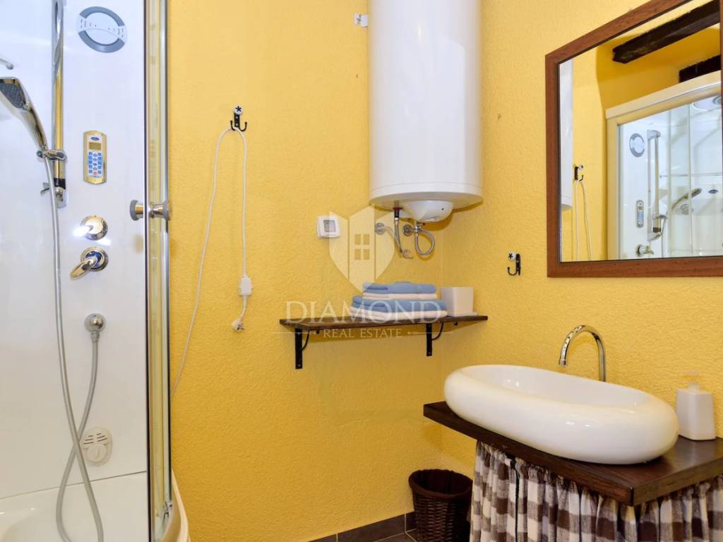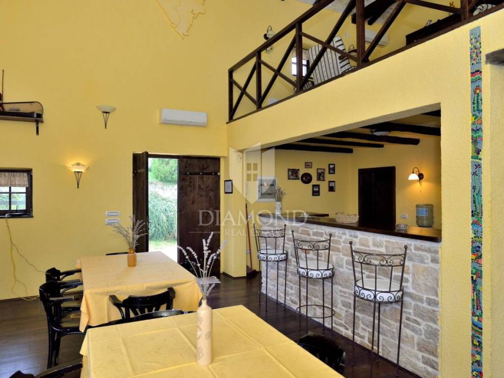 Tradicionalno dizajnirana istarska kamena kuća koncipirana je kao katnica sa podrumom, prizemljem i katom sveukupne površine 323 m2. U podrumu je smješten veliki vinski podrum, praonica, garderoba te dva toaleta. Tu se nalazi i wellness zona sa saunom i nekoliko sprava za vježbanje. Prizemlje je koncipirano kao otvoreni prostor koji obuhvaća blagovaonicu sa barom i kuhinjom te manji apartman koji ima i zaseban ulaz a gdje je smještena spavaća soba sa vlastitom kupaonicom te dnevni boravak i kuhinja. Na katu se nalazi još jedan manji apartman koji također ima zaseban ulaz a koji obuhvaća dvije spavaće sobe, kupaonicu, dnevni boravak i kuhinju s blagovaonicom. Sve prostorije u kući su klimatizirane a provedeno je i podno grijanje u svim kupaonicama. Također, kuća je energetski neovisna sa solarnim panelima za proizvodnju vlastite električne energije.
