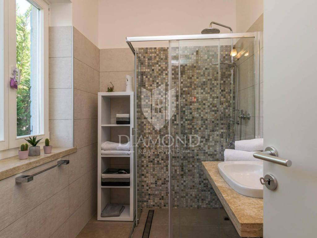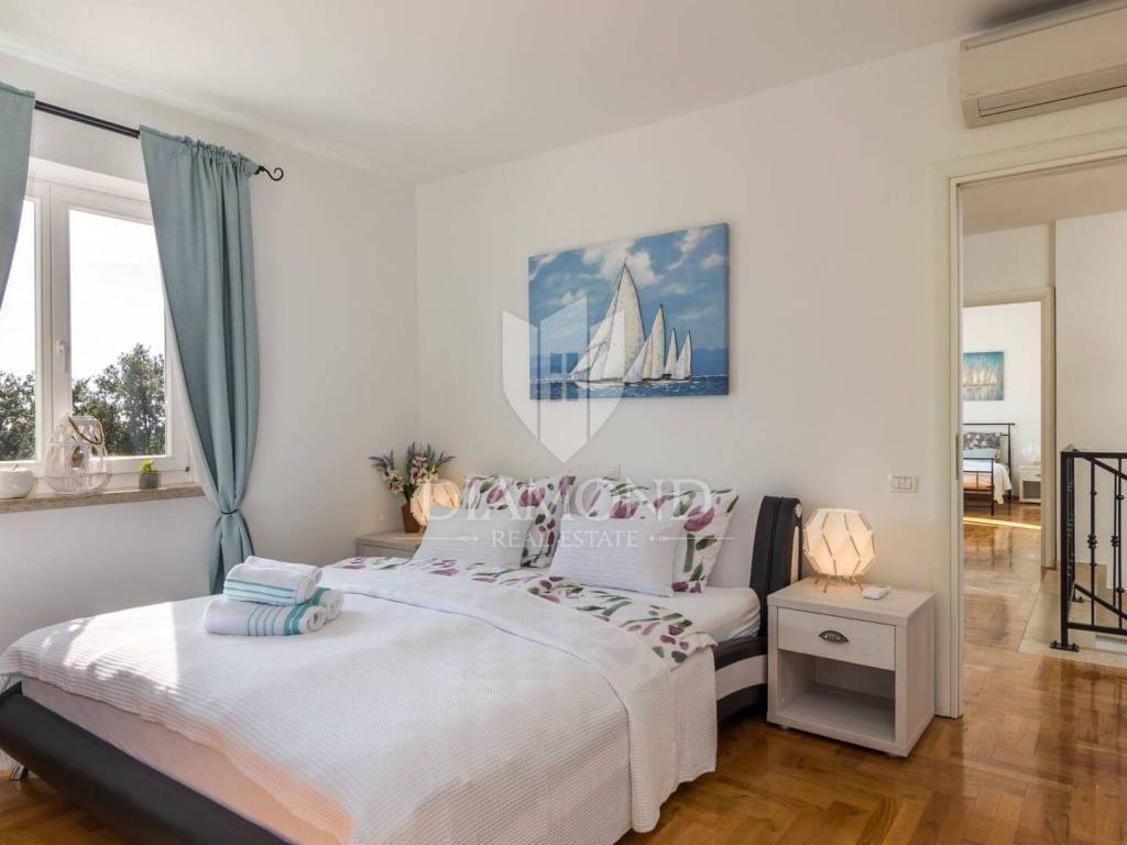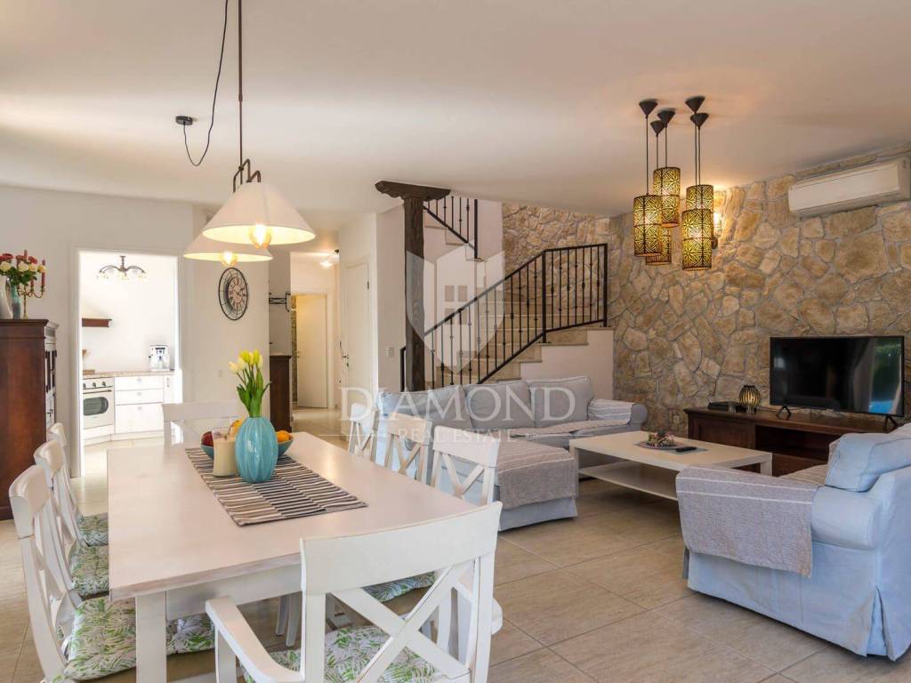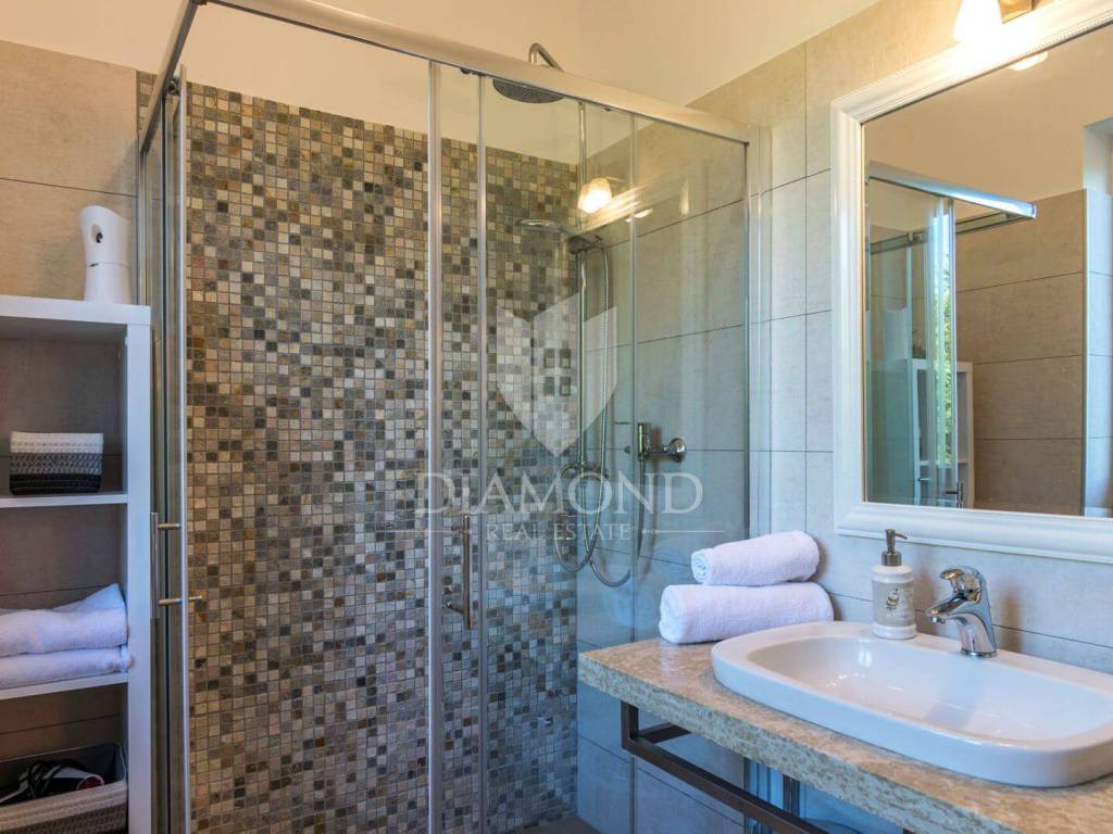 Ova prekrasna Villa sastoji se od prizemlja i kata, a ukupne je kvadrature 180 m2. Prizemlje obuhvaća komforan dnevni boravak, blagovaonicu i kuhinju. Tu se nalazi i jedna spavaća soba, kupaonica te praonica. Na katu su smještene još tri spavaće sobe, od kojih je jedna master soba sa vlastitom kupaonicom i balkonom sa kojeg se prekrasni pogled pruža preko maslinika i do mora. Preostale dvije spavaće sobe dijele jednu zajedničku kupaonicu.