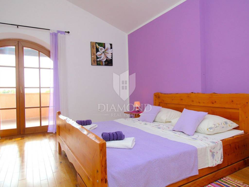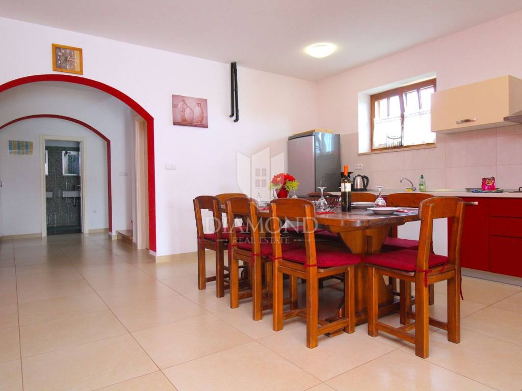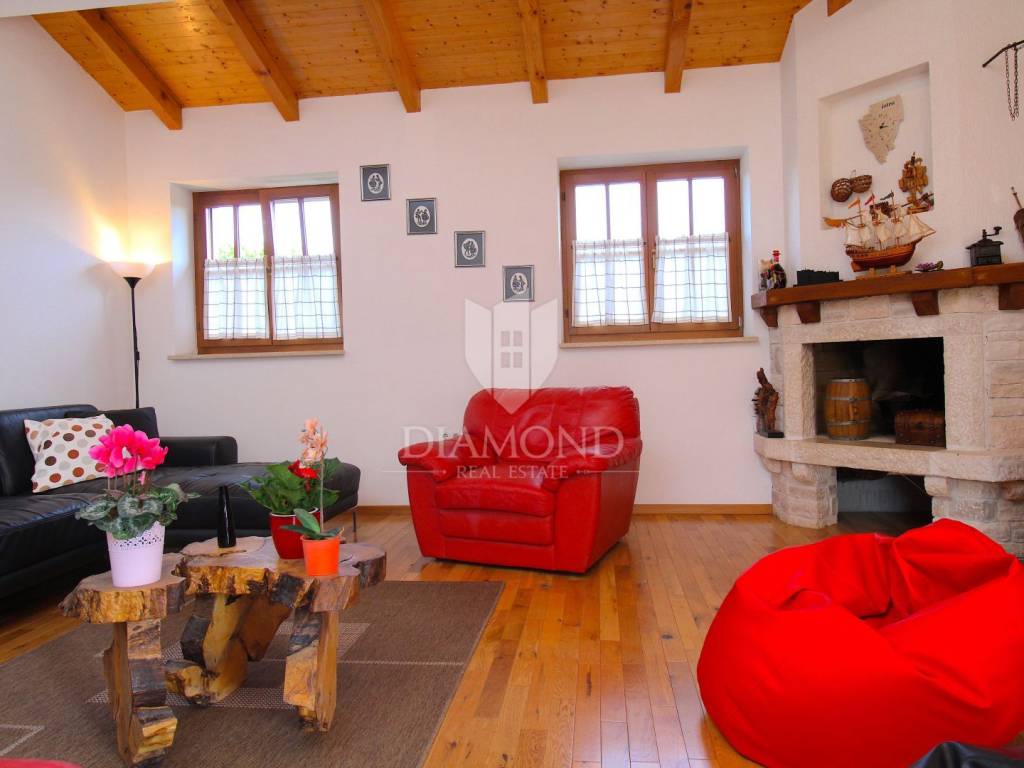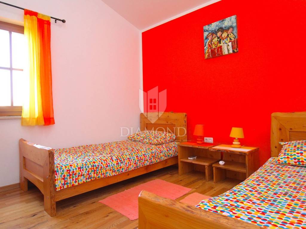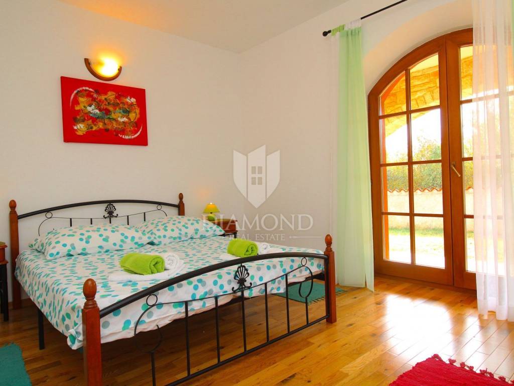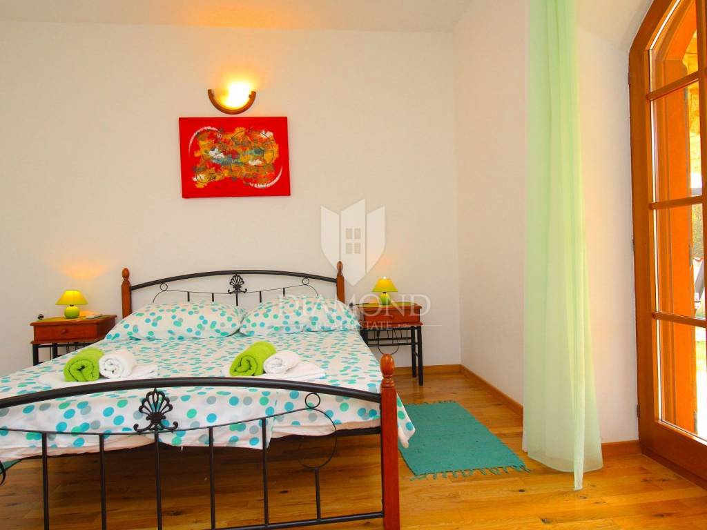 Ova prekrasna komforna kuća prostire se na 240 m² te se sastoji od prizemlja i kata. Prizemlje uključuje prostrani dnevni boravak s kaminom, blagovaonicu, potpuno opremljenu kuhinju, jednu spavaću sobu i jednu kupaonicu. Na katu se nalaze tri spavaće sobe, svaka s vlastitom kupaonicom i izlazom na balkon s kojeg se pruža prekrasan pogled na okolni zeleni krajolik, prirodu i more. Kuća je opremljena kvalitetnim namještajem, a grijanje i hlađenje riješeno je klima uređajima u svakoj spavaćoj sobi te lijepim otvorenim kaminom u dnevnom boravku.