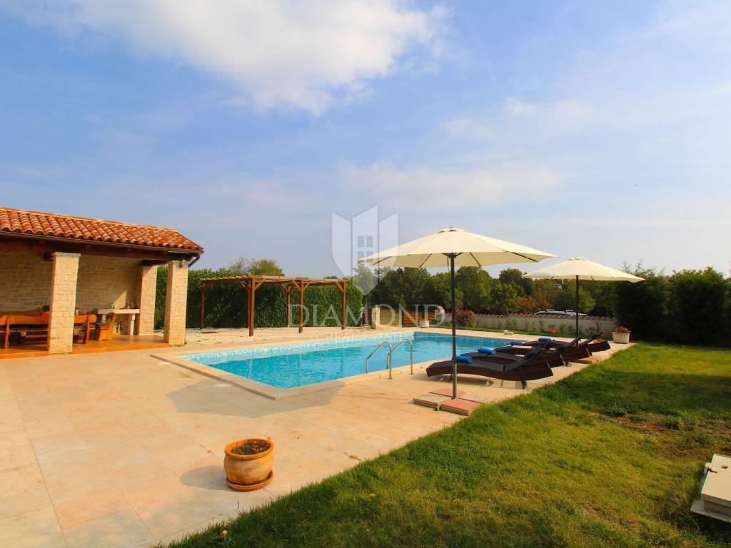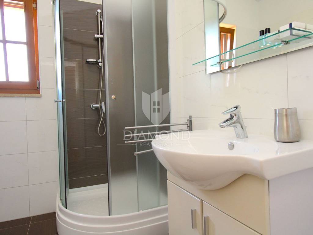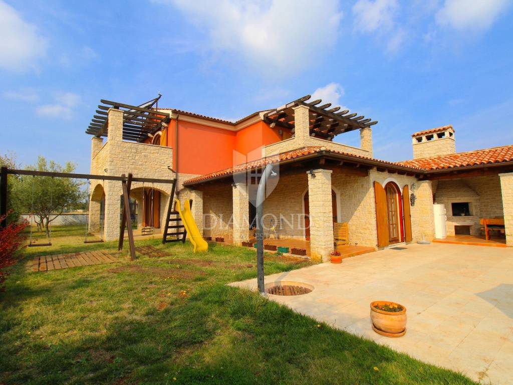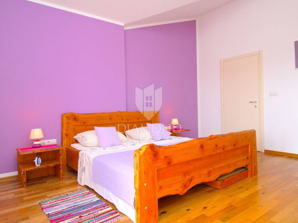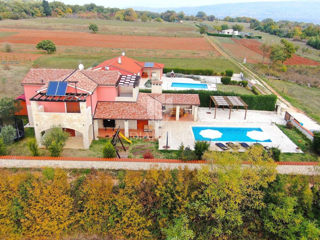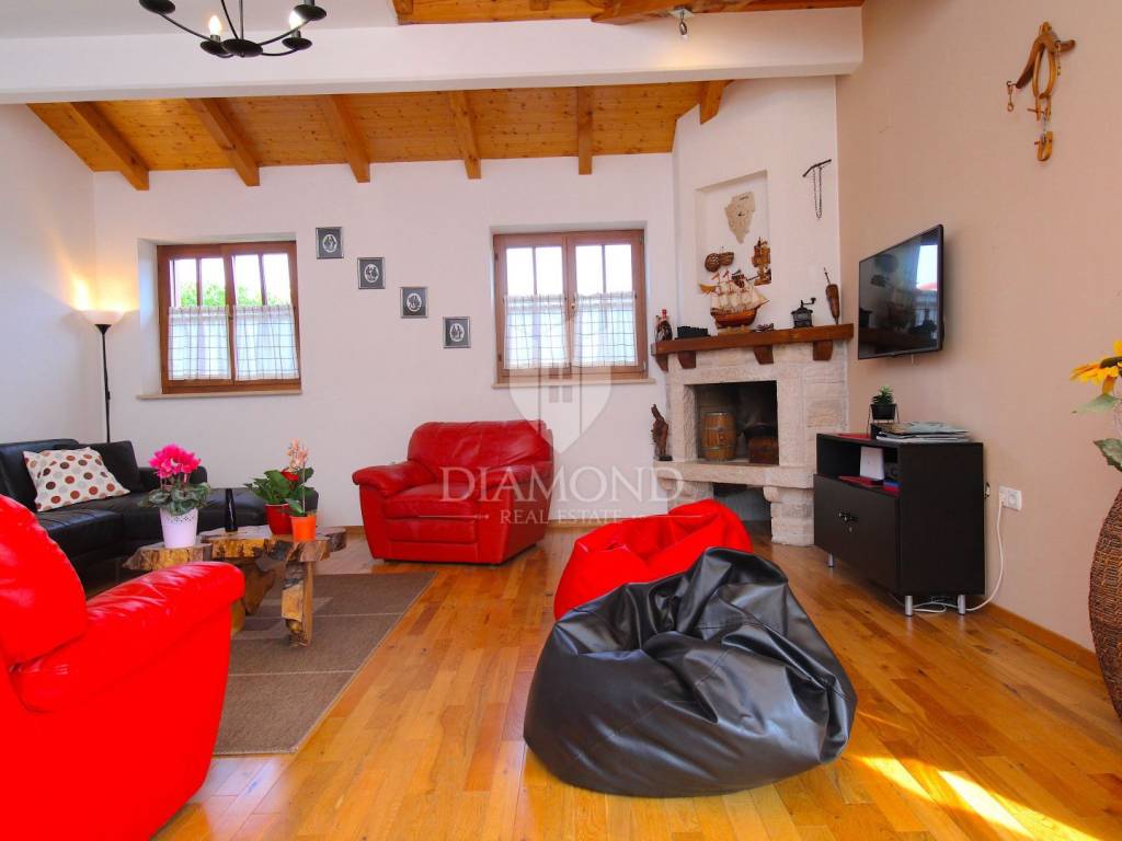 Ova prekrasna komforna kuća prostire se na 240 m² te se sastoji od prizemlja i kata. Prizemlje uključuje prostrani dnevni boravak s kaminom, blagovaonicu, potpuno opremljenu kuhinju, jednu spavaću sobu i jednu kupaonicu. Na katu se nalaze tri spavaće sobe, svaka s vlastitom kupaonicom i izlazom na balkon s kojeg se pruža prekrasan pogled na okolni zeleni krajolik, prirodu i more. Kuća je opremljena kvalitetnim namještajem, a grijanje i hlađenje riješeno je klima uređajima u svakoj spavaćoj sobi te lijepim otvorenim kaminom u dnevnom boravku.