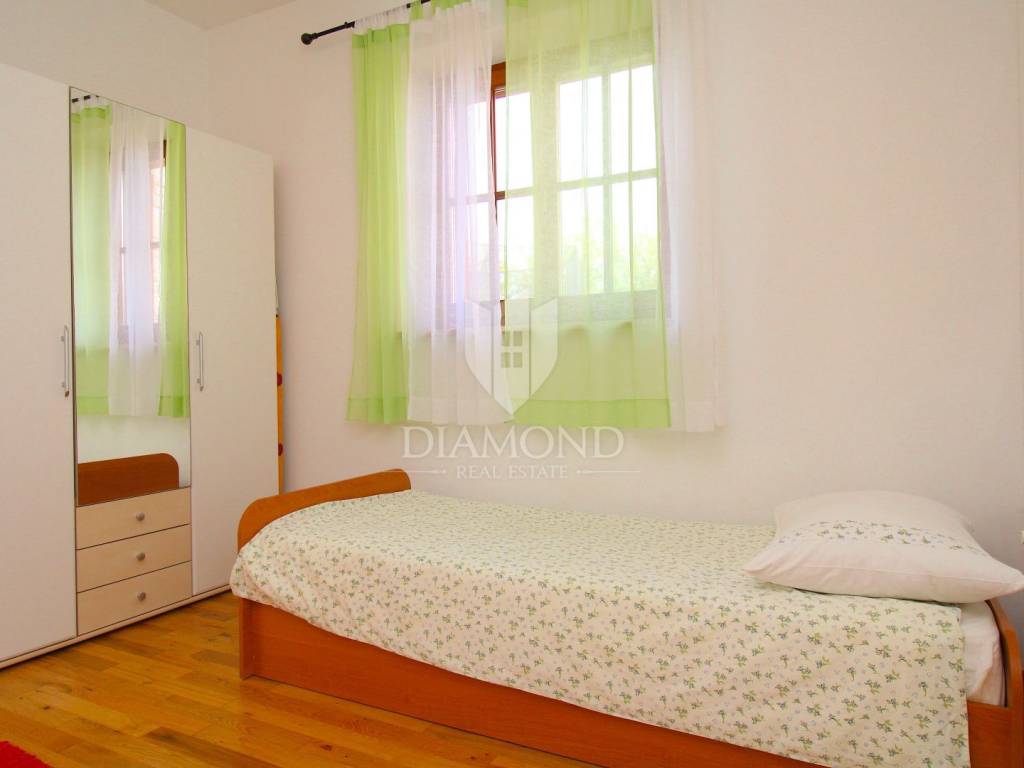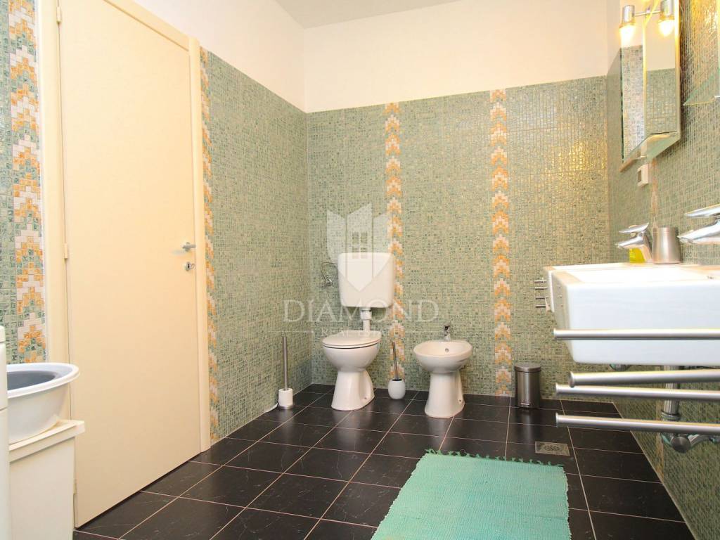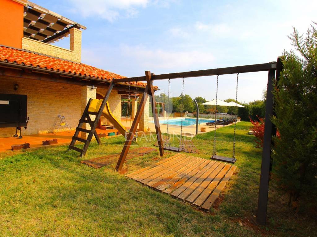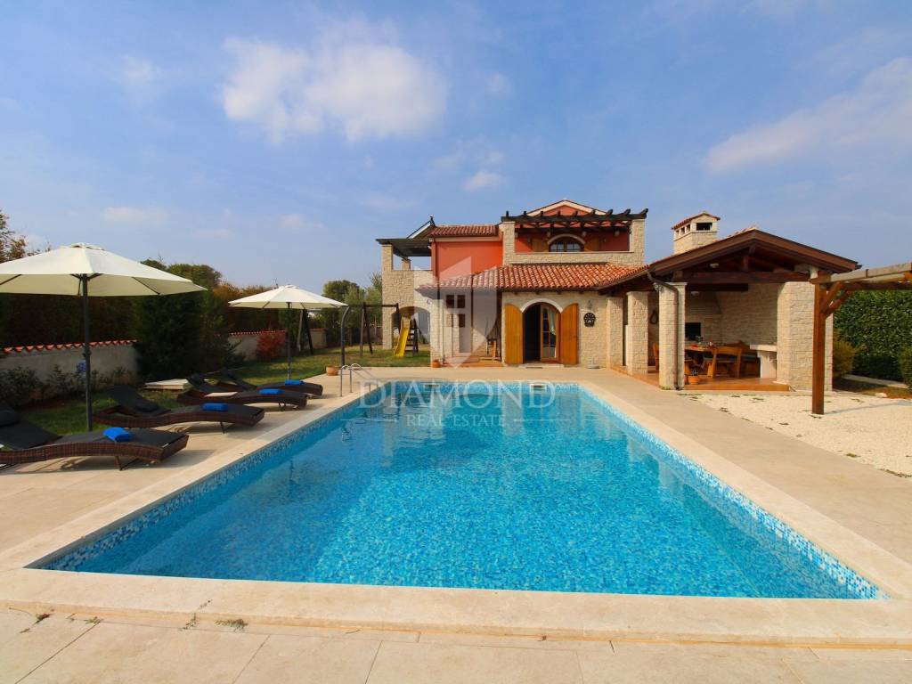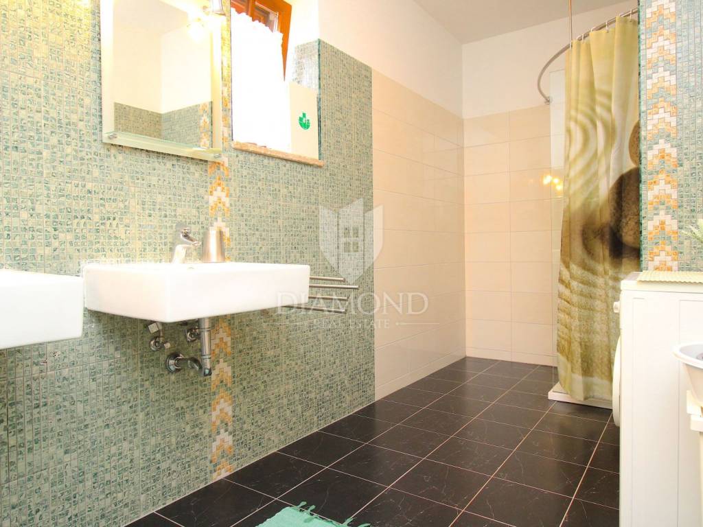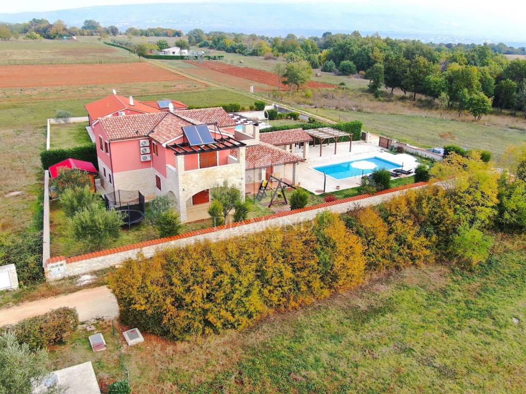Ova prekrasna komforna kuća prostire se na 240 m² te se sastoji od prizemlja i kata. Prizemlje uključuje prostrani dnevni boravak s kaminom, blagovaonicu, potpuno opremljenu kuhinju, jednu spavaću sobu i jednu kupaonicu. Na katu se nalaze tri spavaće sobe, svaka s vlastitom kupaonicom i izlazom na balkon s kojeg se pruža prekrasan pogled na okolni zeleni krajolik, prirodu i more. Kuća je opremljena kvalitetnim namještajem, a grijanje i hlađenje riješeno je klima uređajima u svakoj spavaćoj sobi te lijepim otvorenim kaminom u dnevnom boravku.
