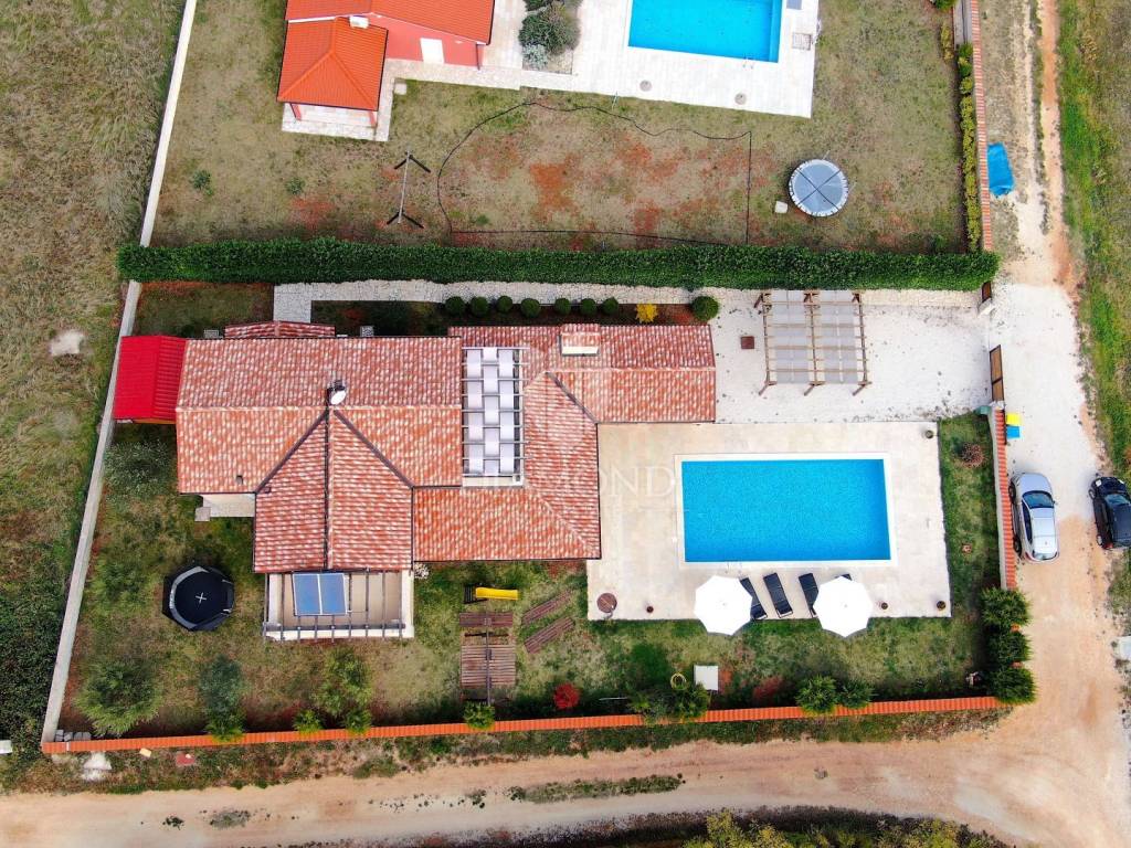 Okućnica se prostire na 1051 m² i uključuje natkriveni parking za dva automobila, natkrivenu terasu s kamenim roštiljem i masivnim drvenim blagovaonskim stolom, dječje igralište s trampolinom te prekrasan bazen veličine 50 m² koji je srce cijelog imanja i glavno mjesto okupljanja i druženja tijekom ljetnih mjeseci.