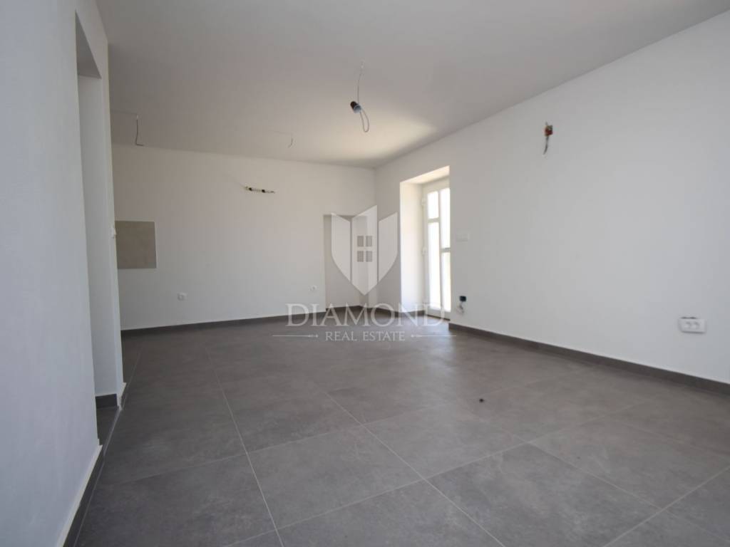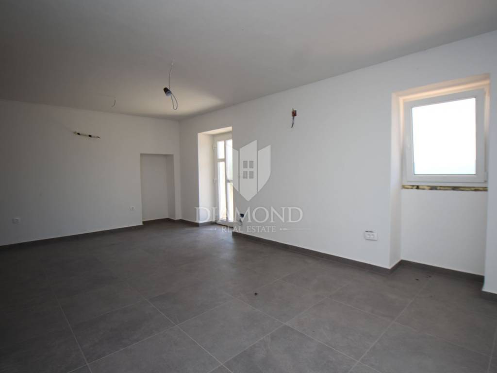Pri vrhu malenog istarskog lučkog mjesta, smjestila se ova potpuno renovirana kamena istarska kuća sa bazenom. Ukupne površine 90 m2, koncipirana je kao katnica sa dvije spavaće sobe i jednom kupaonicom na katu te dnevnog prostora i kuhinje u prizemlju. Spavaće sobe imaju izlaz na zajednički balkon sa kojega se pruža prekrasan pogled na more i okolni krajolik, dok je dnevni dio povezan sa sunčalištem bazena.