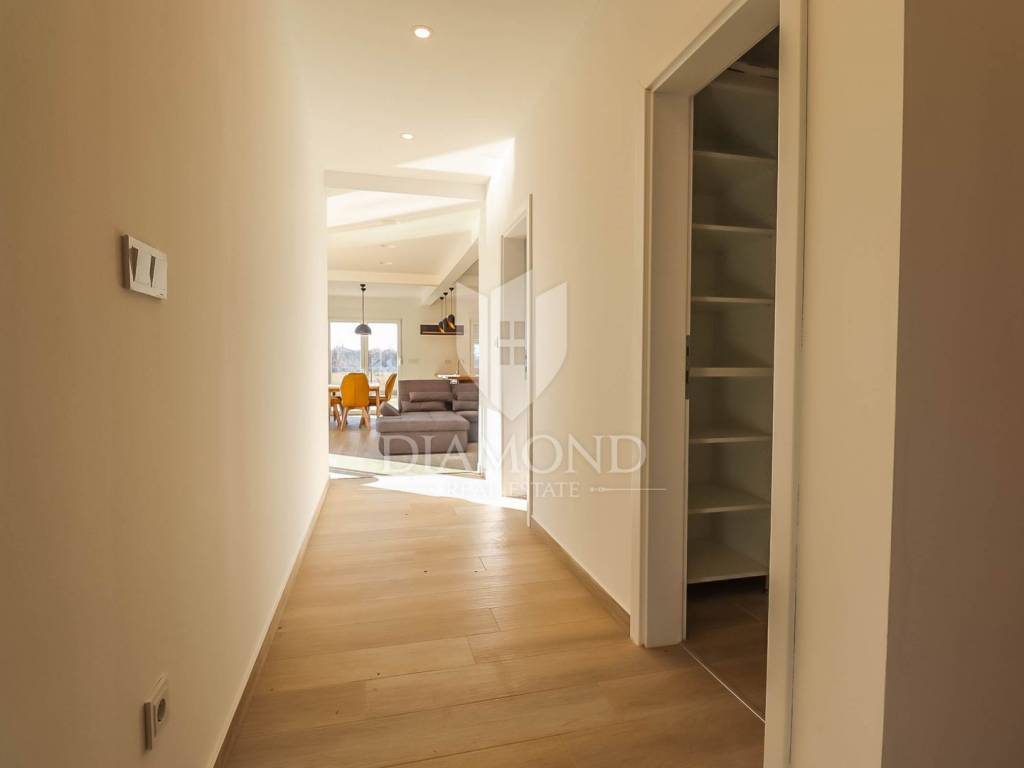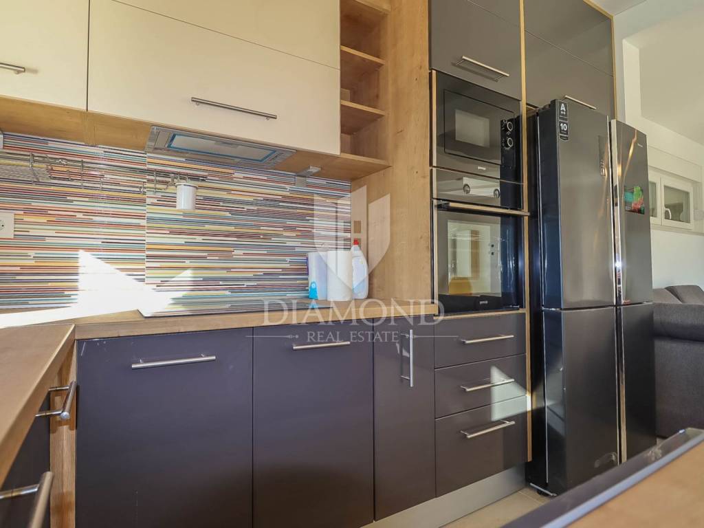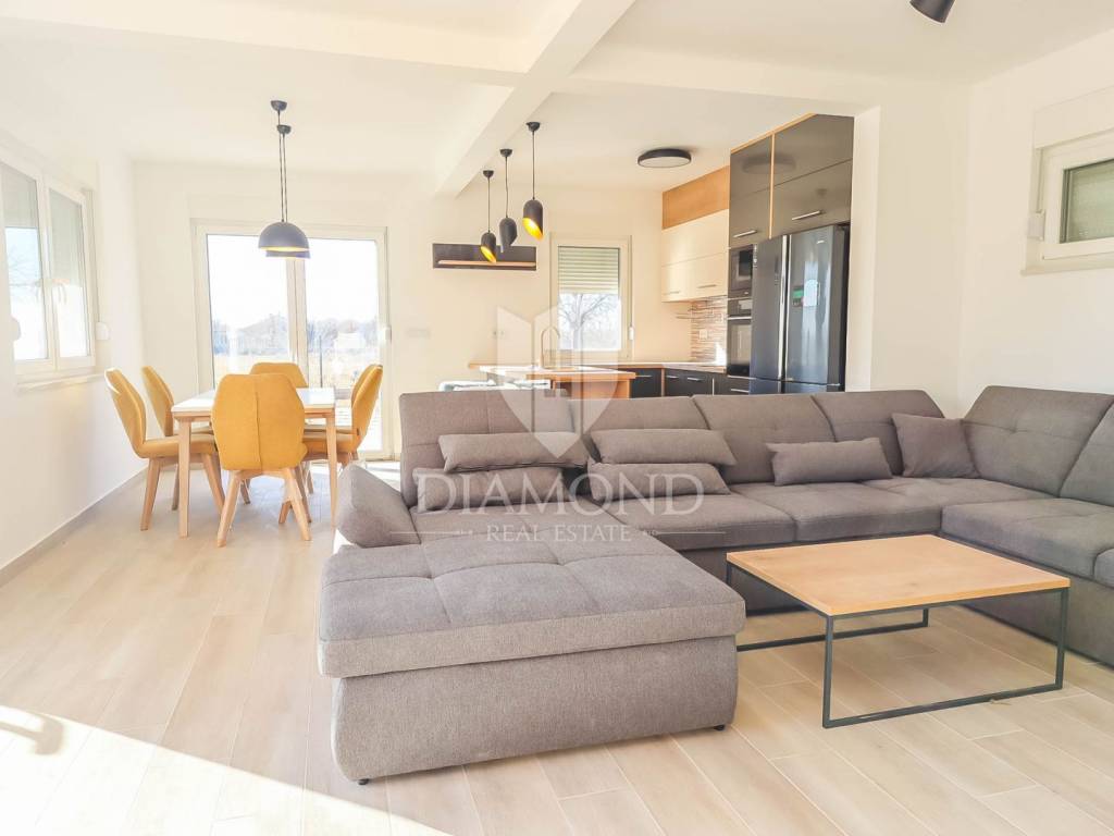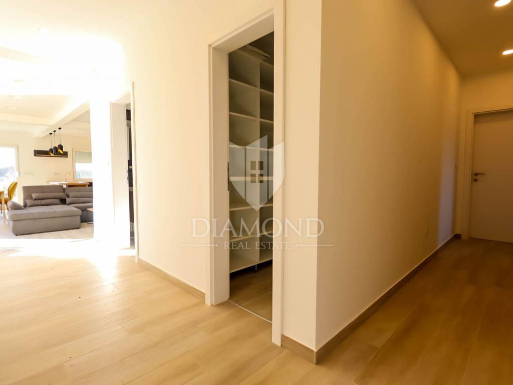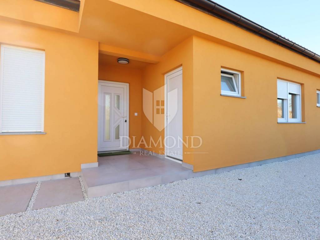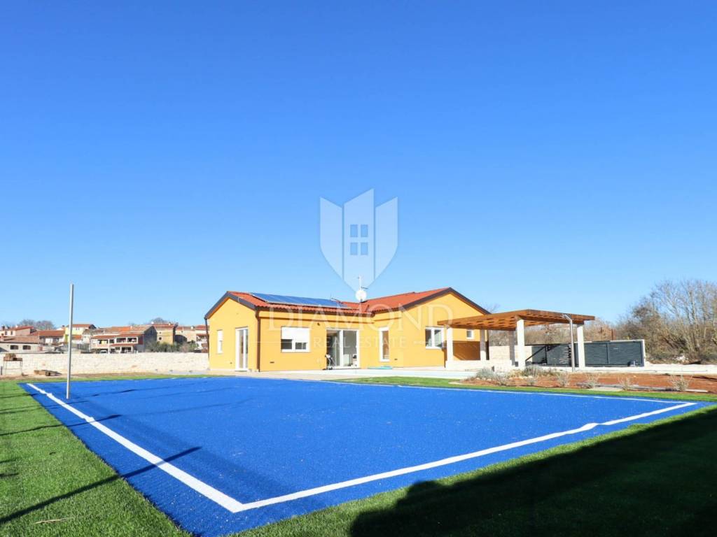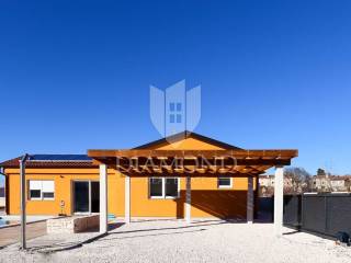 Ova prizemnica stambene površine 145m2 sastoji se od tri spavaće sobe sa vlastitim kupaonicama, velikog open space prostora u kojem je kuhinja sa blagovaonicom i dnevni boravak te još jedna kupaonica. Iz svijetlog dnevnog boravka se izlazi na bazen sa sunčalištem i na prostranu okućnicu sa odbojkaškim/badminton terenom i ljetnom kuhinjom. U sklopu okućnice nalazi se i natkriveni parking za dva automobila.