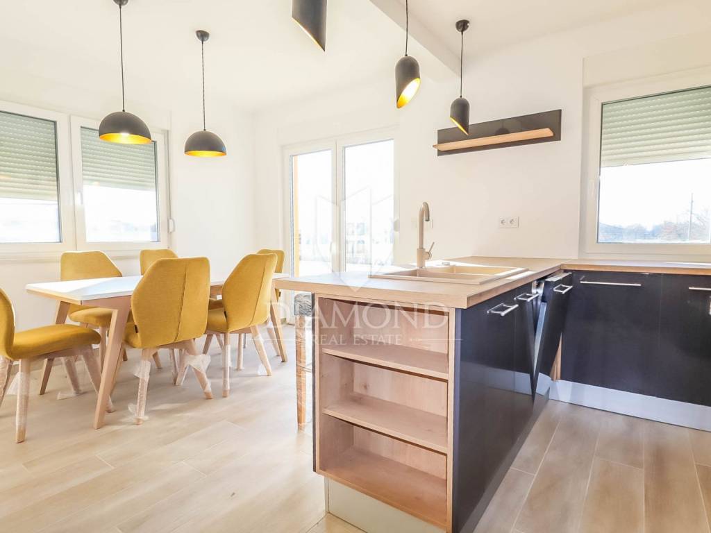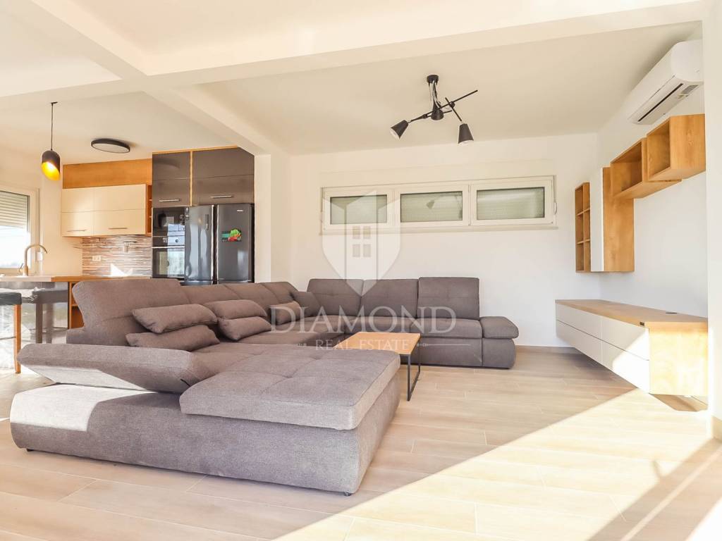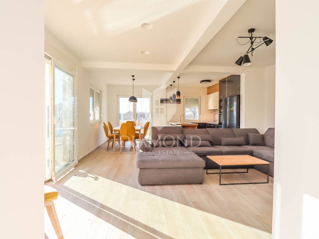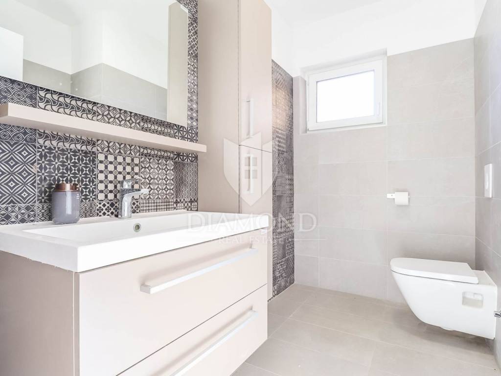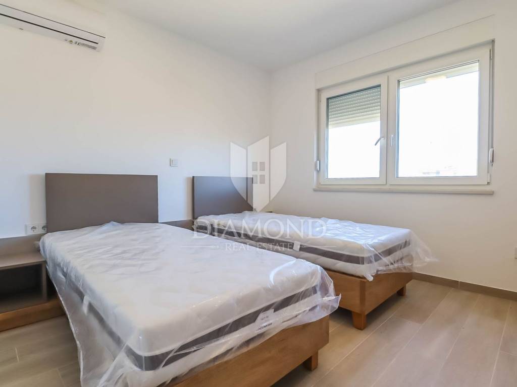 Ova prizemnica stambene površine 145m2 sastoji se od tri spavaće sobe sa vlastitim kupaonicama, velikog open space prostora u kojem je kuhinja sa blagovaonicom i dnevni boravak te još jedna kupaonica. Iz svijetlog dnevnog boravka se izlazi na bazen sa sunčalištem i na prostranu okućnicu sa odbojkaškim/badminton terenom i ljetnom kuhinjom. U sklopu okućnice nalazi se i natkriveni parking za dva automobila.