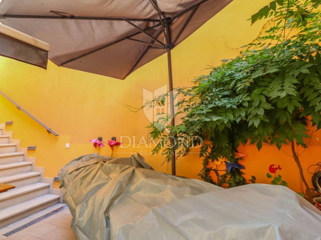 Komfor u centru zbivanja, vlastito malo dvorište, zelenilo te mir glavni su atributi koji opisuju ovu nekretninu. Proteže se kroz tri etaže, sveukupne kvadrature stambenih jedinica oko 200m2, dok dvorište ima 24m2. Svaka stambena jedinica ima svoju prostranu terasu koja je opremljena sa kvalitetnim tendama kako bi svojim korisnicima omogućile željeni hlad. Prizemlje ima uređen studio koji se sastoji od kuhinje s blagovaonicom te dnevnim boravkom, a krevet je odvojen tako da postoji mogućnost da se zatvori i uredi kao spavaća soba jer je taj dio vrlo prostran. Na prvom katu se nalazi jedan studio apartman sa kuhinjom, blagovaonicom, malom ugradbenom ostavom, spavaćim dijelom te kupaonicom. Posebno je to što uz terasu, ovaj studio apartman ima i balkon koji gleda na dvorište. Na drugom katu, visokom potkrovlju je također studio kao i na prvom, uz malo drugačiji raspored. Svaki studio apartman ima svoj zasebni ulaz.