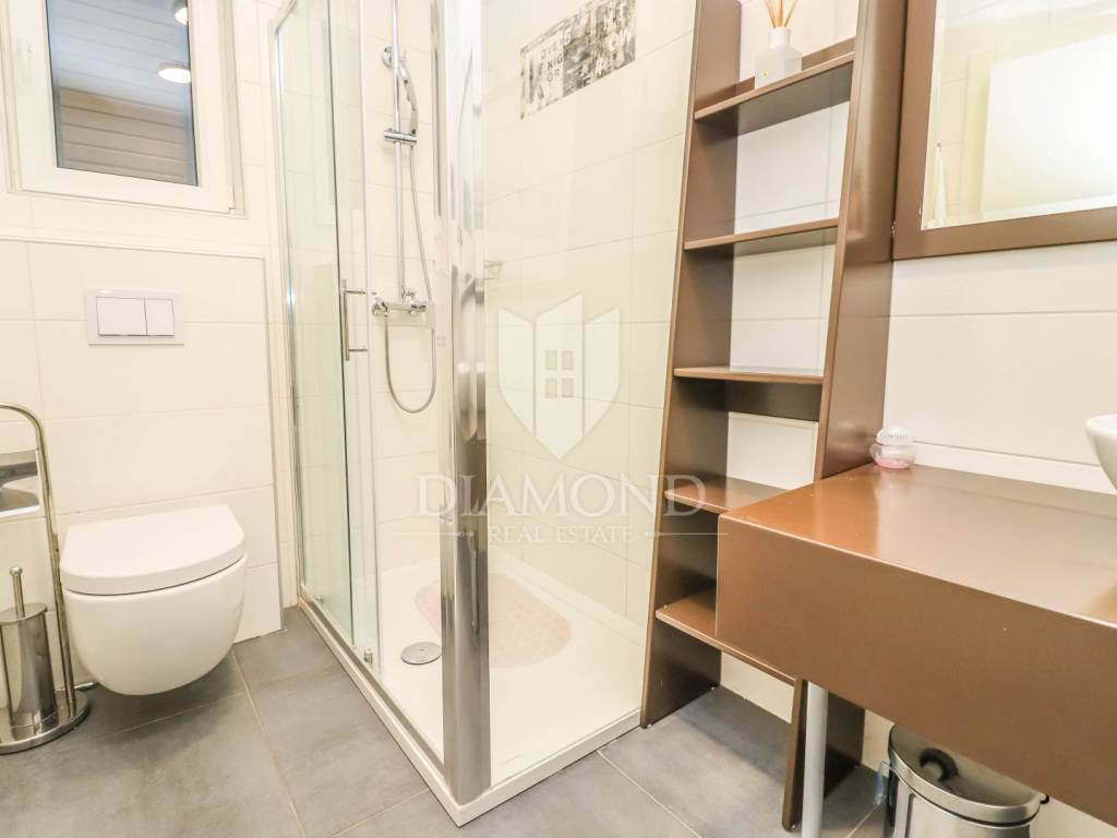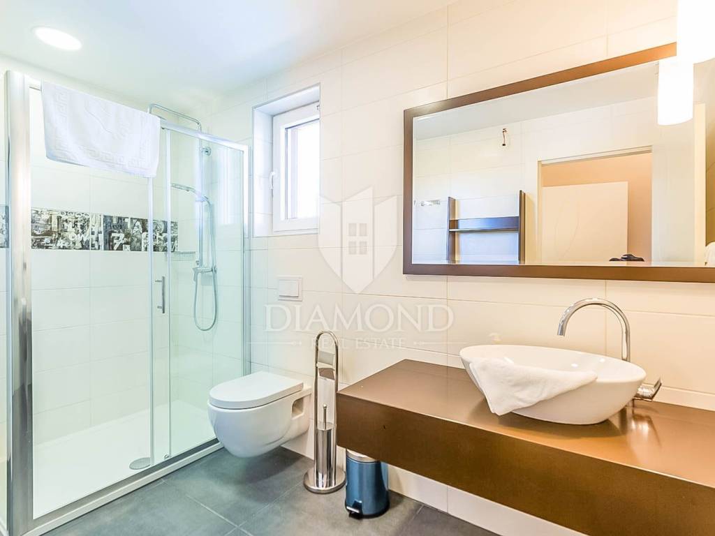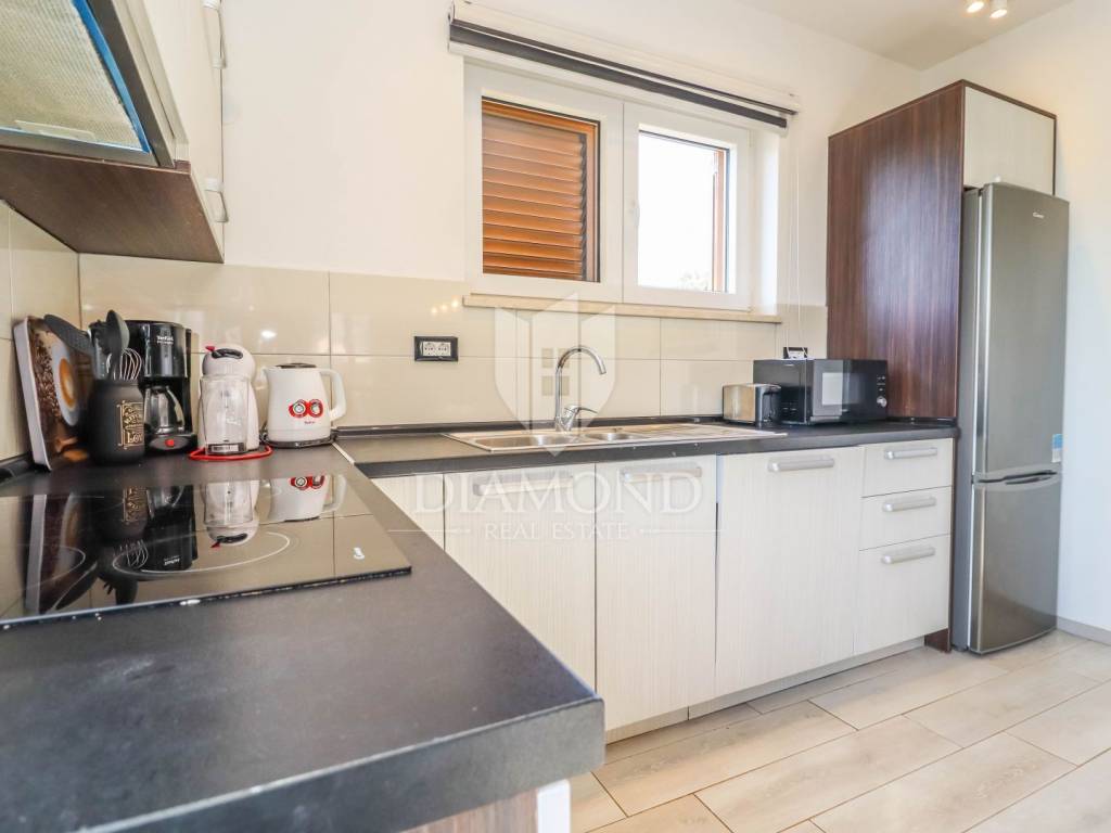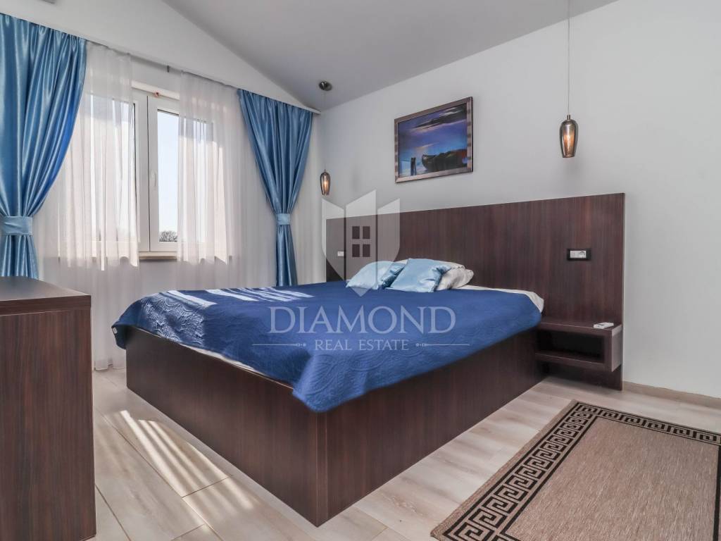 Kuća se nalazi na okućnici veličine 765m2 te se prostire kroz dvije etaže, prizemlje i kat. U prizemlju tako nailazimo na ulazno predsoblje, prostrani dnevni dio sa kuhinjom i blagovaonicom, spavaćom sobom te zajedničkom kupaonicom. Iz dnevnog dijela se izlazi na terasu s koje imate savršen pogled na bazen i uređenu okućnicu. Stubištem se iz ulaznog predsoblja odlazi na kat gdje su se smjestile još dvije spavaće sobe s vlastitim kupaonicama, te ostava/vešeraj.