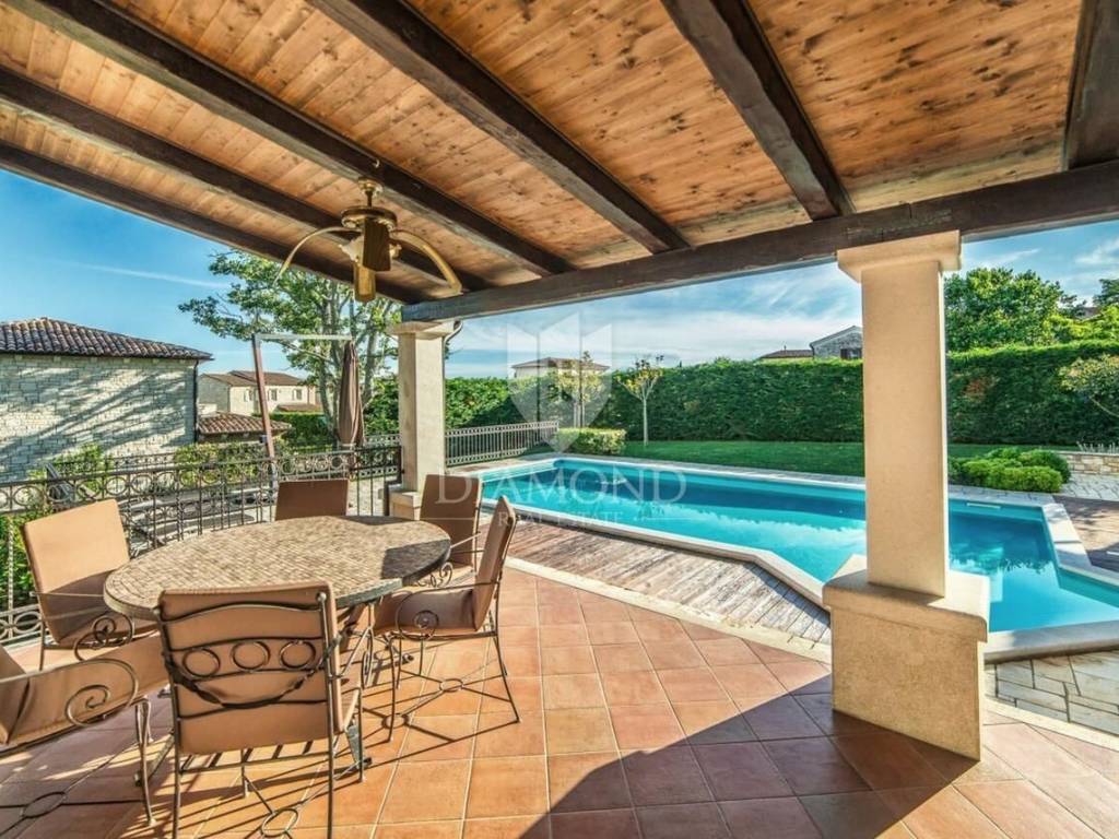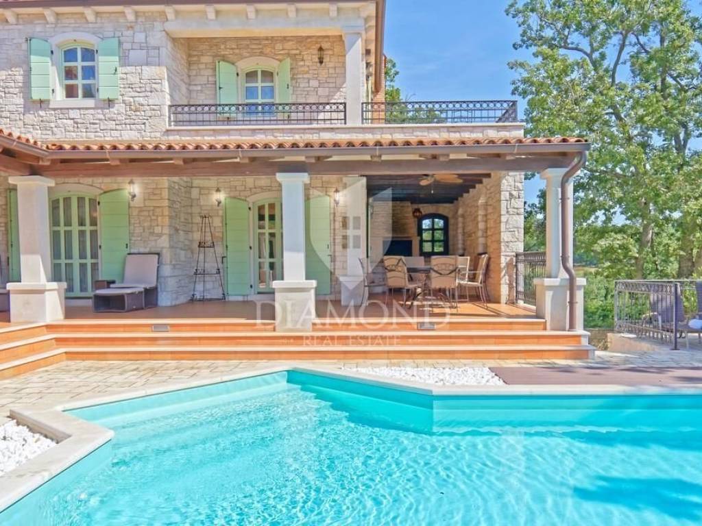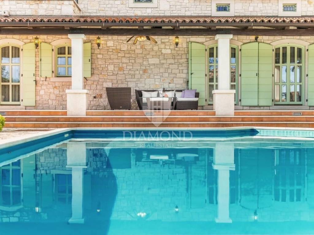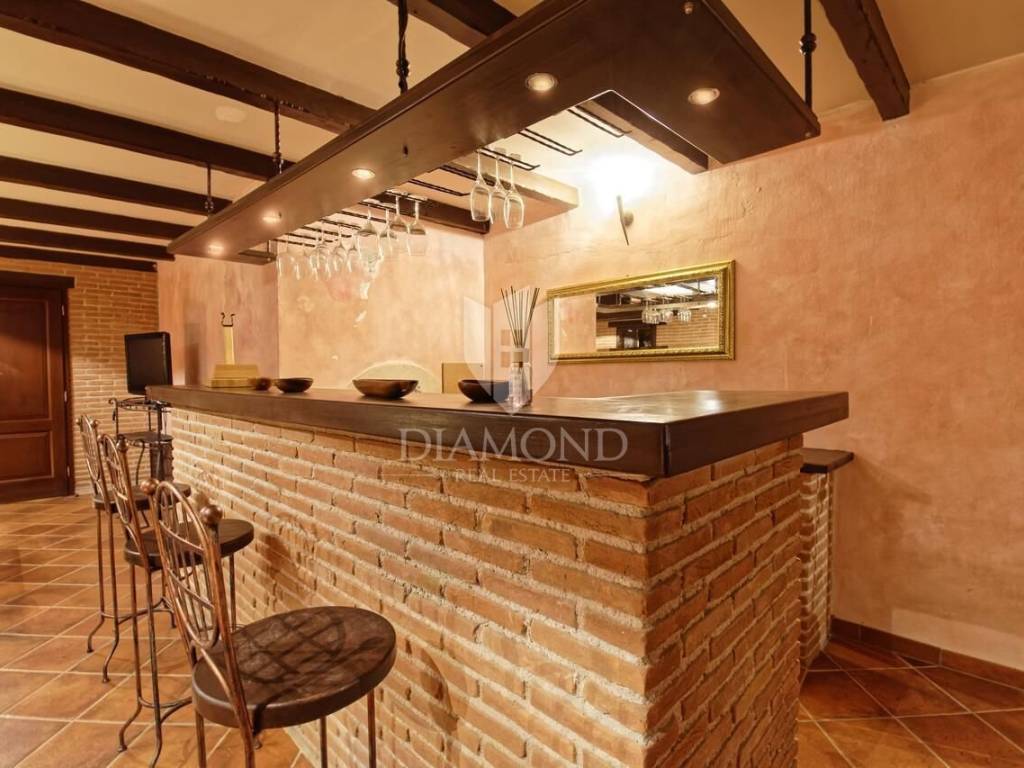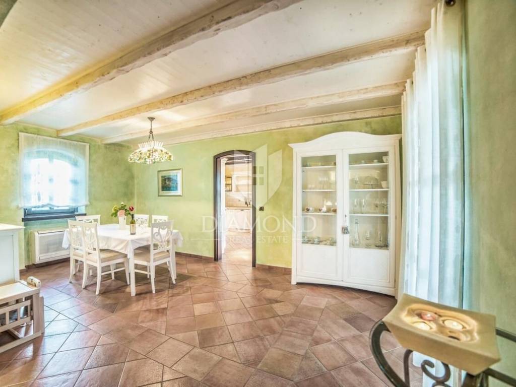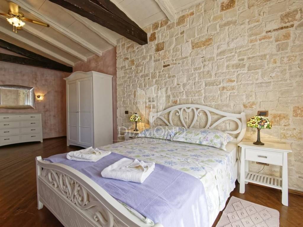 Svega 11 km od centra Poreča i njegovih plaža prodaje se ova autohtona kamena kuća. Nalazi se na mirnoj lokaciji, smještena na parceli preko 1300 m2 na koji se nalazi bazen sa sunčalištem, tretirani zeleni travnjak sa raznim biljem te starijim krošnjama te prostor za ljetno ručanje.