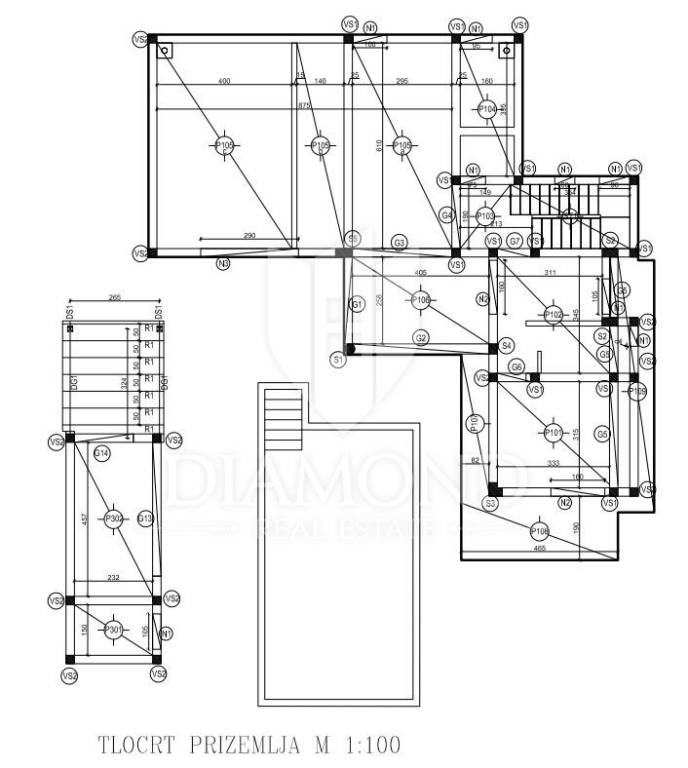 Prizemlje kuće sastojati će se od ulaznog hodnika, prostranog dnevnog boravka sa kuhinjom i blagovaonom po open space konceptu, jedne spavaće sobe sa vlastitom kupaonom i izlazom na natkrivenu terasu i bazen, ostave i wc-a za goste. Kroz cijeli dnevni prostor biti će postavljene staklene stijene koje će prostoru omogućavati dodatni dotok svijetlosti i vode na natkrivenu terasu sa bazenom. U dnevnom boravku nalaziti će se kamin koji će u zimskim danima omogućavati budućim vlasnicima dodatni ugođaj i toplinu. Elegantnim stubištem dolaziti će se na drugu etažu gdje će se nalaziti tri prostrane spavaće sobe sa vlastitim kupaonama i izlazom na terasu, te praona rublja. S vanjske strane kuće nalaziti će se kotlovnica.