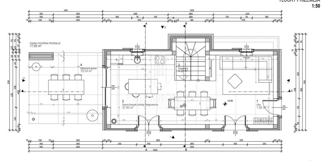 Vila je smještena na zemljištu od 568 m2 i njena površina iznosi 143,17 m2. Vila se sastoji od tri etaže. Na prvoj etaži nalazi se vinski podrum, koji se može urediti i kao wellness i kupaona.. Zatim dolazimo u prizemlje vile gdje se nalazi prostrani dnevni prostor koji se sastoji od dnevnog boravka i kuhinje sa blagovaonom otvorenog tipa. Kroz cijeli dnevni boravak i blagovaonu ugrađene su velike staklene stijene koje omogućavaju veliki dotok sunčanih zraka što daje samom prostoru veliki izvor svijetlosti. Iz dnevnog prostora izlazi se na natkrivenu terasu sa ljetnom kuhinjom, bazenom i kupalištem sa kojeg se pruža pogled na more. Elegantnim stubištem dolazimo na treću etažu kuće gdje se nalaze dvije prostrane spavaće sobe sa vlastitim kupaonama. Soba s desne strane ima vlastitu terasu sa koje će budući vlasnici imati nezaboravne zalaske sunca.
