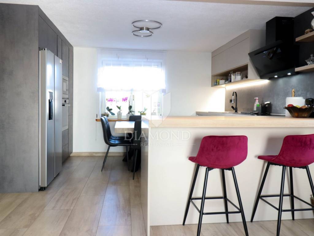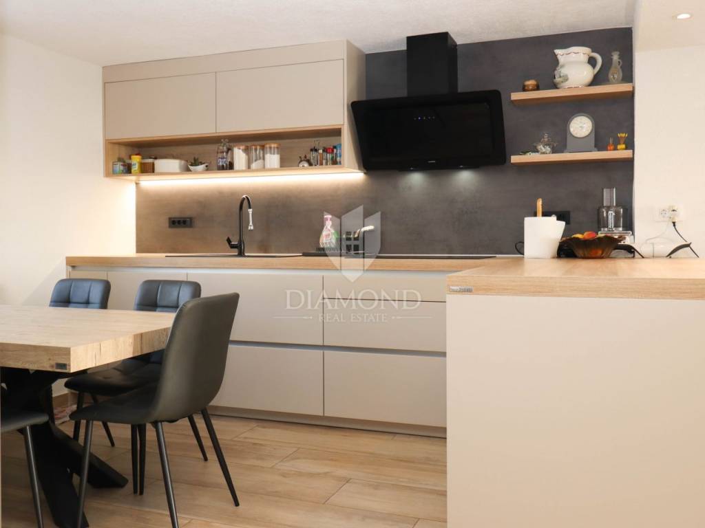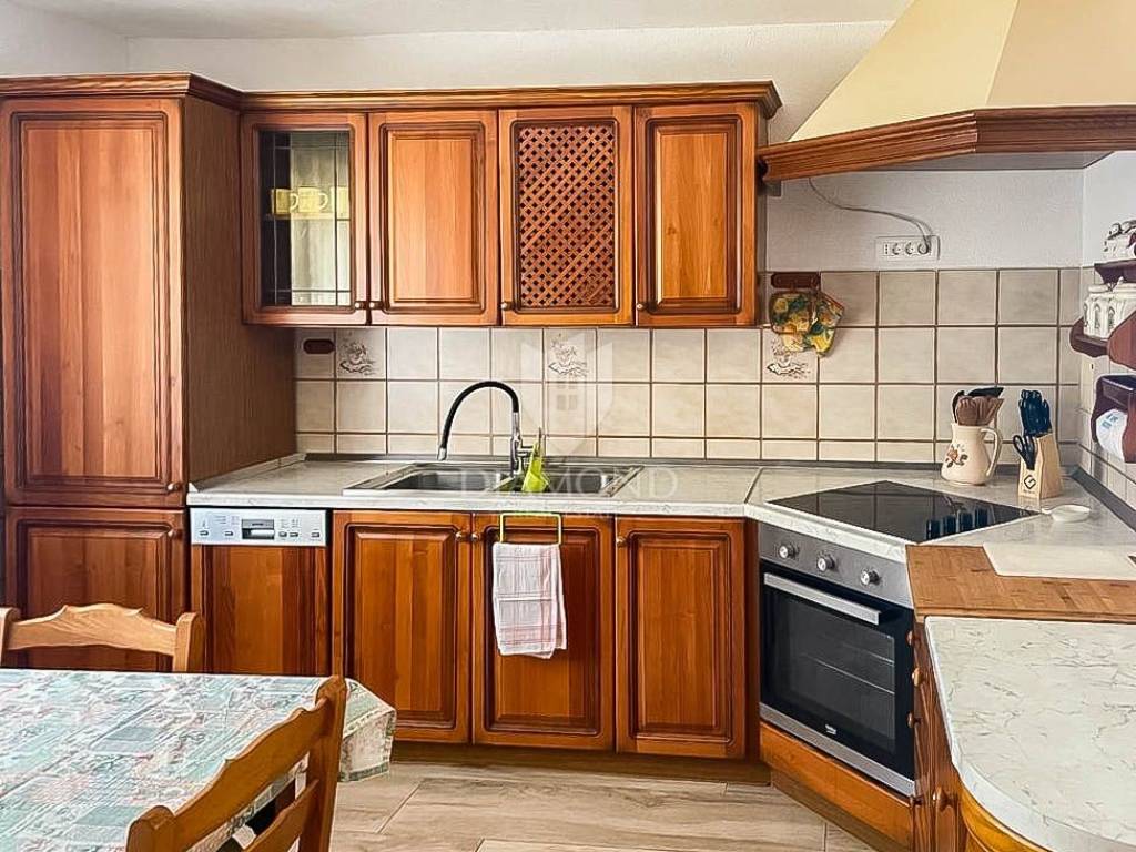 Prodaje se kuća sa prekrasnim pogledom na more. Kuća je je ukupne veličine 234m2 na dviie etaže, izgrađena je na zemljištu od 637 m2. Na svakoj etaži se nalazi zaseban stan sa tri spavaće sobe veličine 117 m2.Svaki stan se sastoji od ulaza ,open-space dnevnog boravka sa kuhinjom i blagovaonicom iz kojeg se izlazi na terasu sa koje se pruža prekrasan pogled na more i prirodu. U nastavku ulaza dolazimo do hodnika u kojem se nalaze tri spavaće sobe i kupaonica. Podno grijanje je postavljeno kroz cijeli kat, hlađenje je pomoću klima uređaja, kuća ima i dimljak. Na kući su postavljeni solarni paneli za struju i vodu jačine 10 kw. Kuća je renovirana 2023. godine. Okućnica je veličine 441m2,na kojoj se nalazi garaža i nadstrešnica gdje se nalazi ljetna kuhinja.