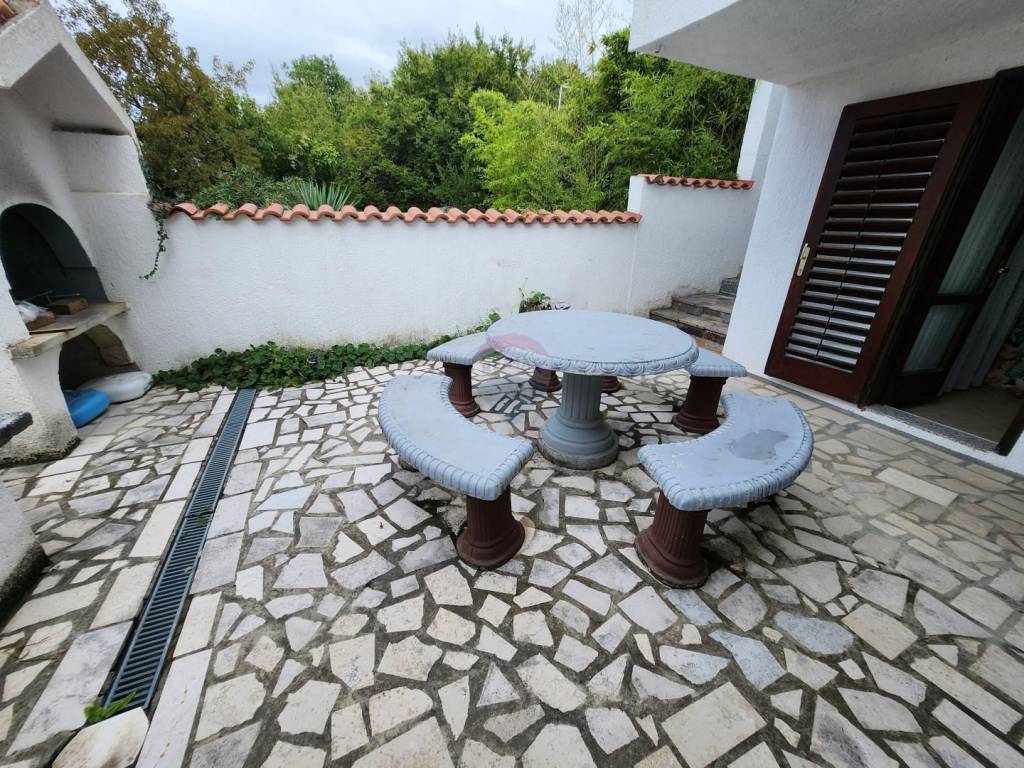 Na terasi je kameni kamin i garnitura sa stolom i klupama.