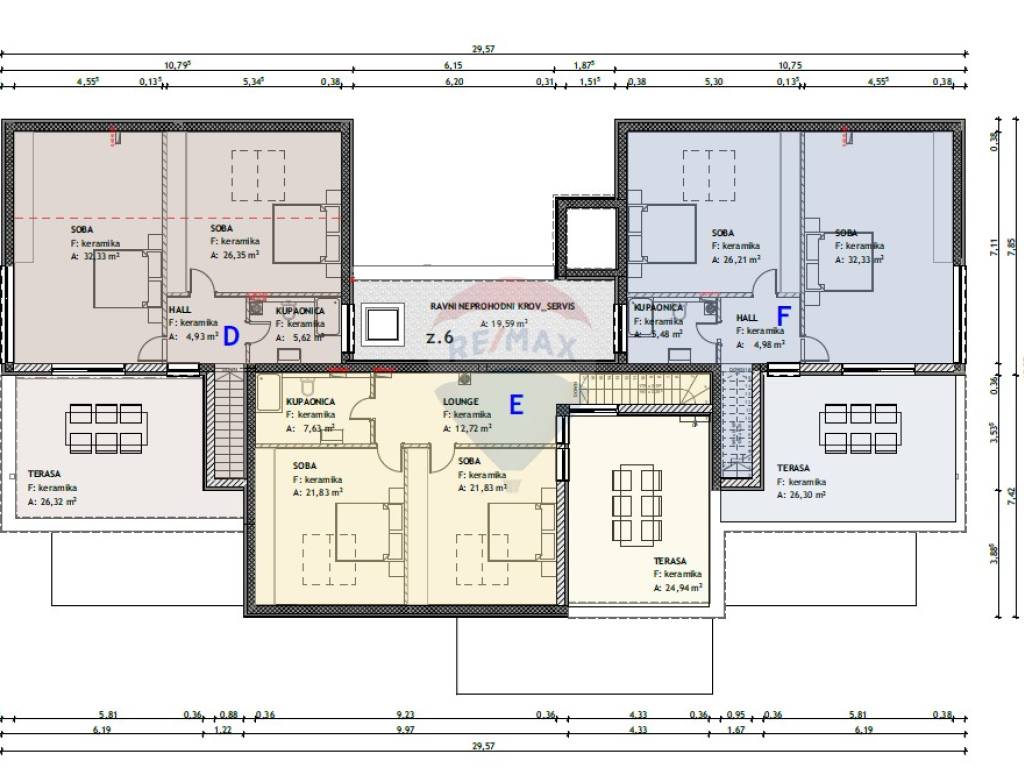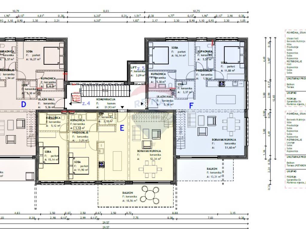 Prodajemo dvoetažni stan u kvalitetnoj novogradnji koja broji ukupno 6 stanova; Ovdje konkretno predstavljamo stan "E"koji se nalazi na 1.katu i visokom potkrovlju i sastoji se od:ulaznog hodnika sa sanitarnim čvorom, 2 spavaće sobe , sa svojim kupaonicoma,velikim dnevnim boravkom s kuhinjom i terasom na 1.katu, i još dvije velike spavaće sobe,kupatila i velike terase u visokom potkrovlju. U podrumu zgrade nalazi se vlastita garaža za 2 automobila i spremište od 5m2. Iz podruma se dalje pristupa na gornje etaže dizalom i širokim stubištem.