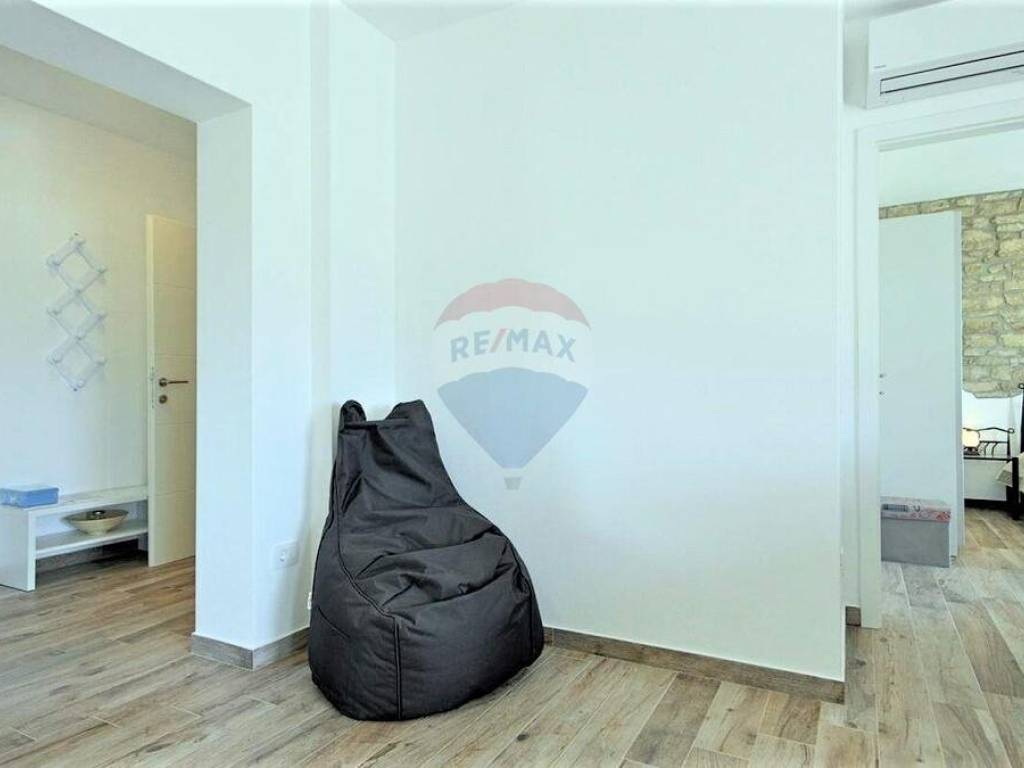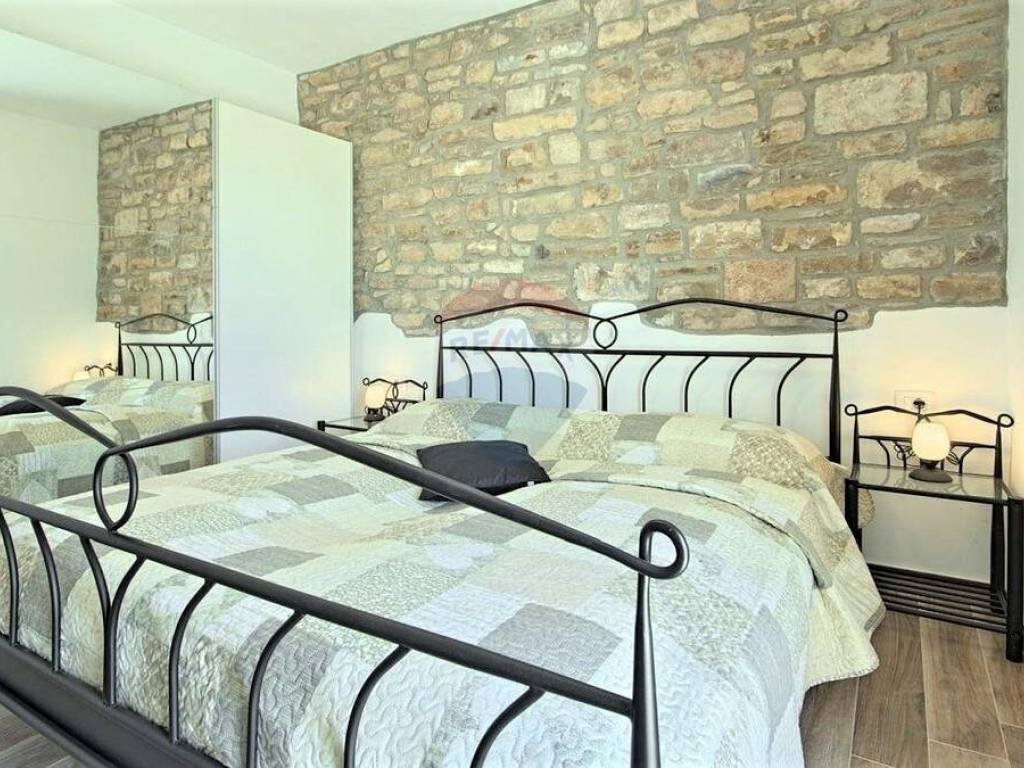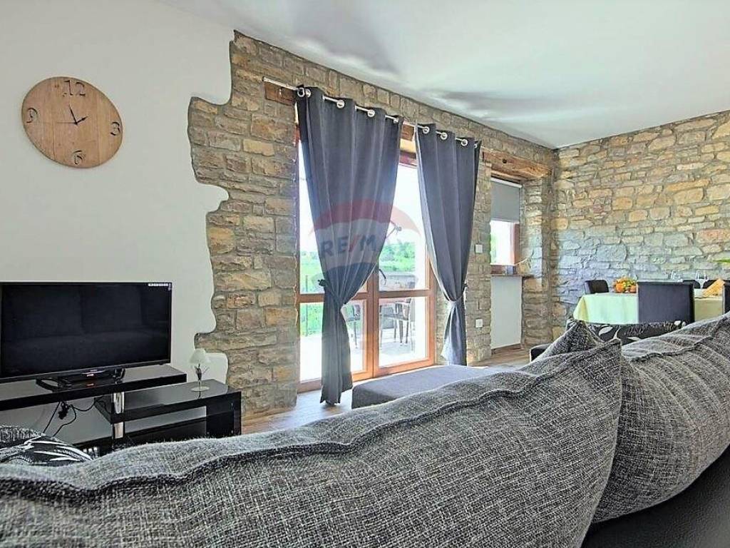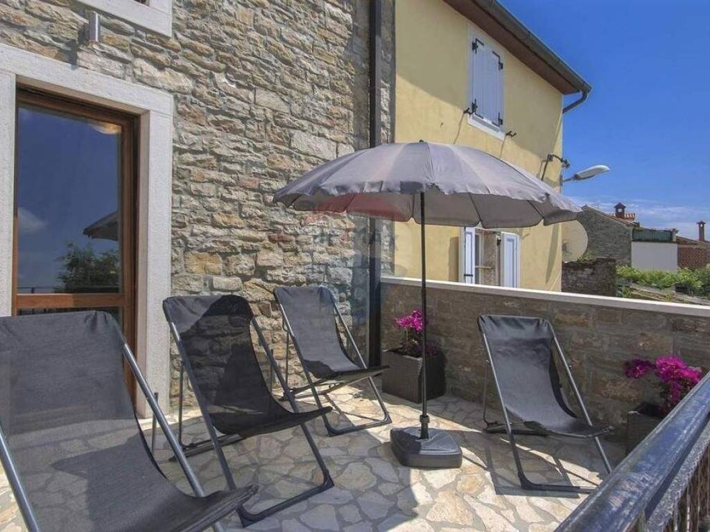 U malom mjestu nedaleko Buja, poznatom po maslinarstvu, smjestila se ova kuća u nizu. Kuća je dijelom adaptirana 2016. godine. Koncipirana je od 3 etaže, prizemlje površine 80 m2 u roh-bau fazi, stan na prvom katu površine 71 m2 i potkrovlja površine 78 m2 također u roh-bau fazi. Stan na prvom katu kuće koncipiran je od ulaznog hodnika, dvije spavaće sobe, ostave, kupaonice i velikog open space dnevnog prostora gdje je smještena kuhinja, blagovaonica i dnevna soba. Lijepo uređeni interijer u kombinaciji s izvornim kamenom daje kući poseban šarm. Iz dnevnog prostora izlazi se na prostranu terasu s koje se pruža neponovljiv panoramski pogled na more. Kući pripada okućnica od 107 m2 na kojoj se nalaze 2 parking mjesta.