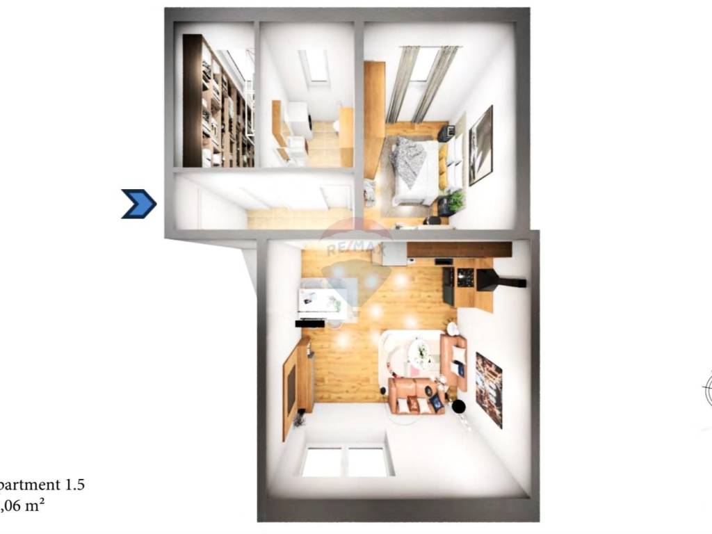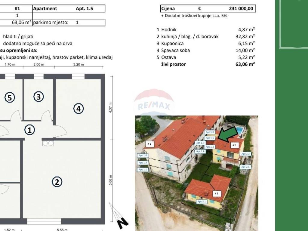 Sa 63.06 m2 prostora, sadrži ulazni hodnik, ostavu, kupaonicu, kuhinju s dnevnim boravkom i spavaću sobu. Savršeno je opremljen vrhunskom kuhinjom, elegantnom kupaonicom, hrastovim parketom i kvalitetnim prozorima.