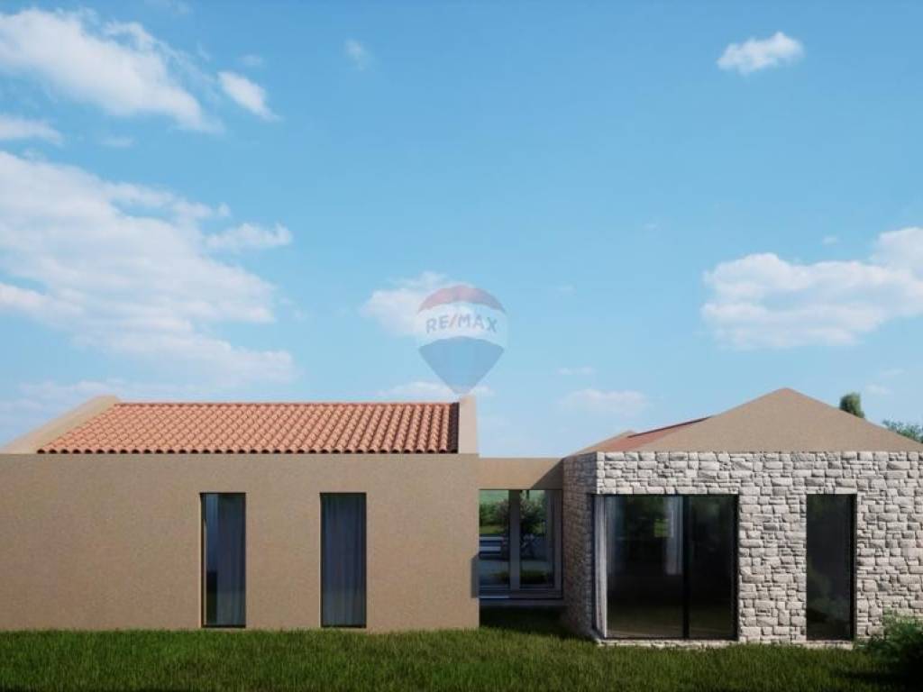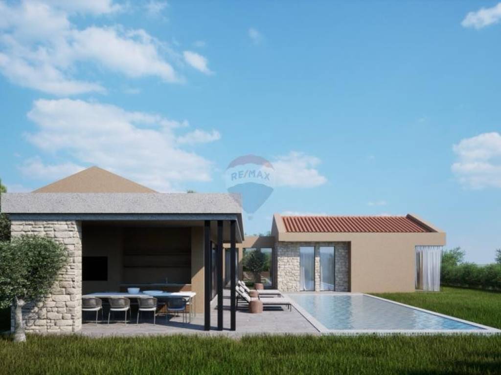 Nekretnina dolazi s potpunom dokumentacijom za gradnju moderne prizemnice ukupne neto površine 200 m² i bazena od 44 m², smješteno na površini od 1000 m², što pruža potpunu privatnost. Kuća je zamišljena kao spoj dvaju kubusnih objekata povezanih hodnikom sa staklenim stijenama.