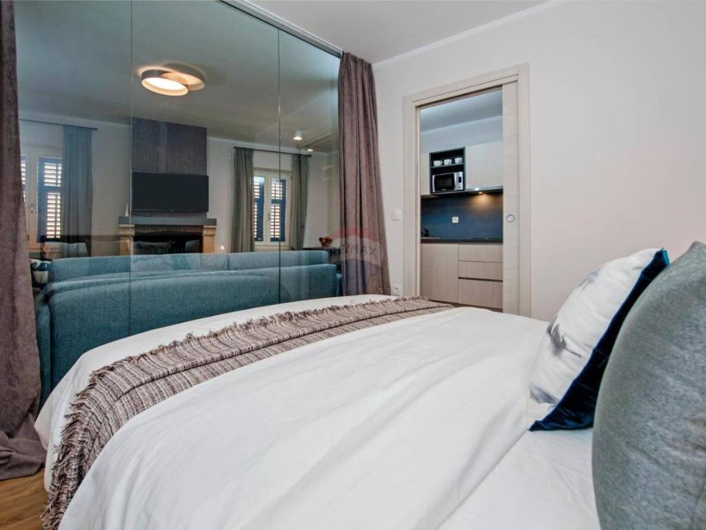 Na trećem katu zgrade u starogradskoj jezgri na traženoj lokaciji s prekrasnim pogledom prodajemo stan. Stan je kompletno renoviran te vrlo lijepo uređen s pomnim odabirom detalja i namještaja. Sastoji se od prostranog dnevnog boravka s kaminom, kuhinje i blagovaone, te izdvojenog dijela sobe za spavanje i kupaonice.