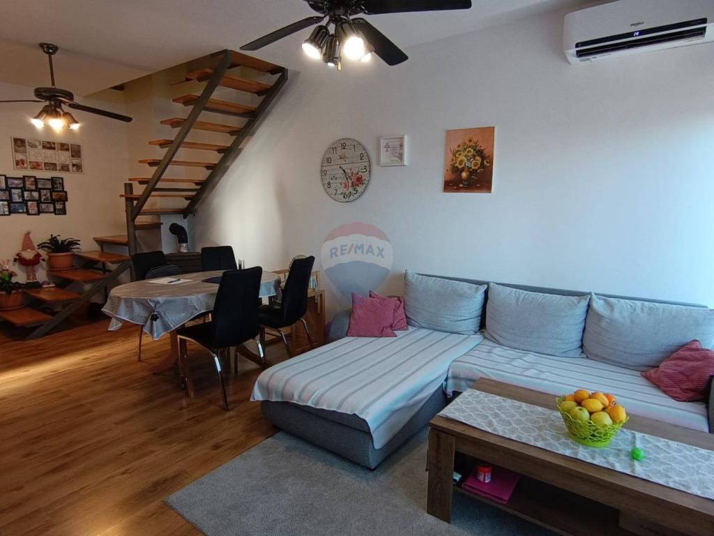 U mirnom predgrađu grada Novigrada smjestio se ovaj dvosoban stan. Stan je dvoetažan , na prvom katu se nalazi na prvom katu zgrade, sastoji se od ulaznog hodnika veličine , blagavaone sa dnevnim boravkom , kupaonom , kuhinja i dvije spavaće sobe. Stepenicama iz dnevnog boravka ide se na drugu etažu kvadrature 22 m2 iznad 2 metra visine te još 20 m2 visine manje od 2 m koja se sastoji od jedne spavaće sobe te prostorije koja je namjenjena kao mali ured te terasa s pogledom na more.