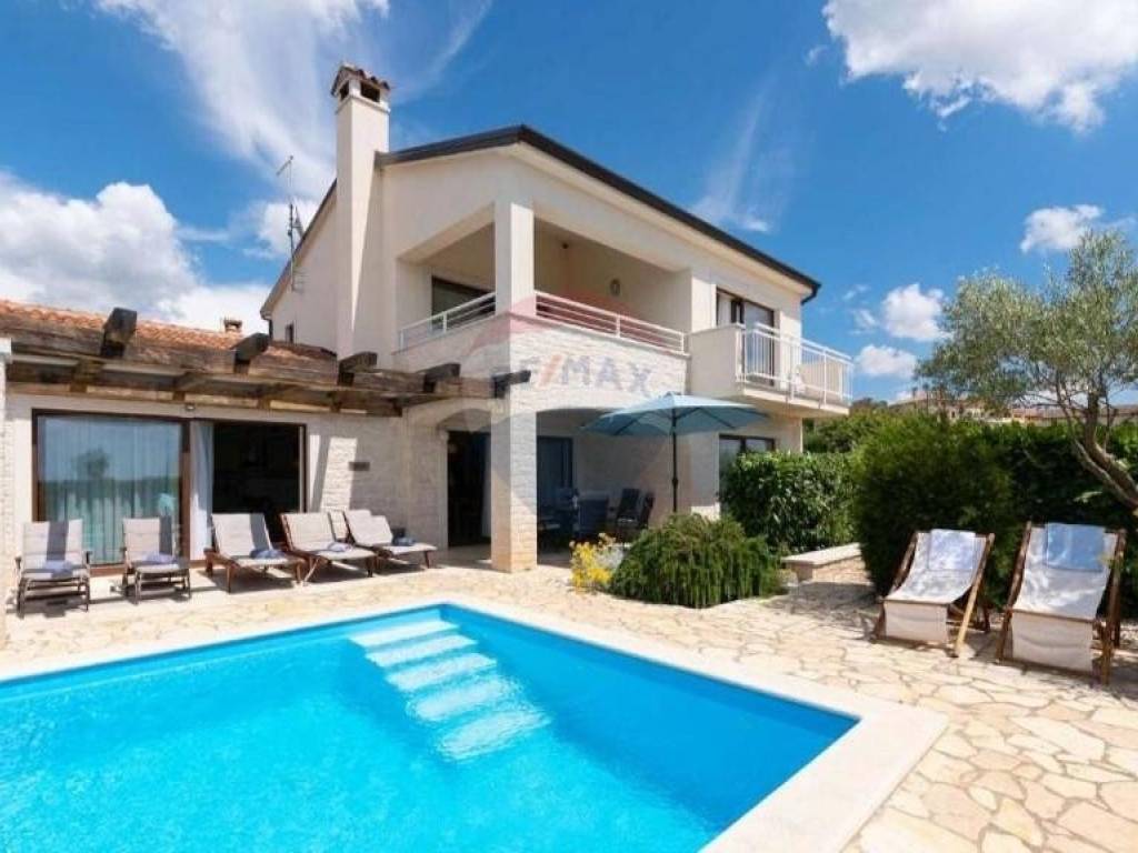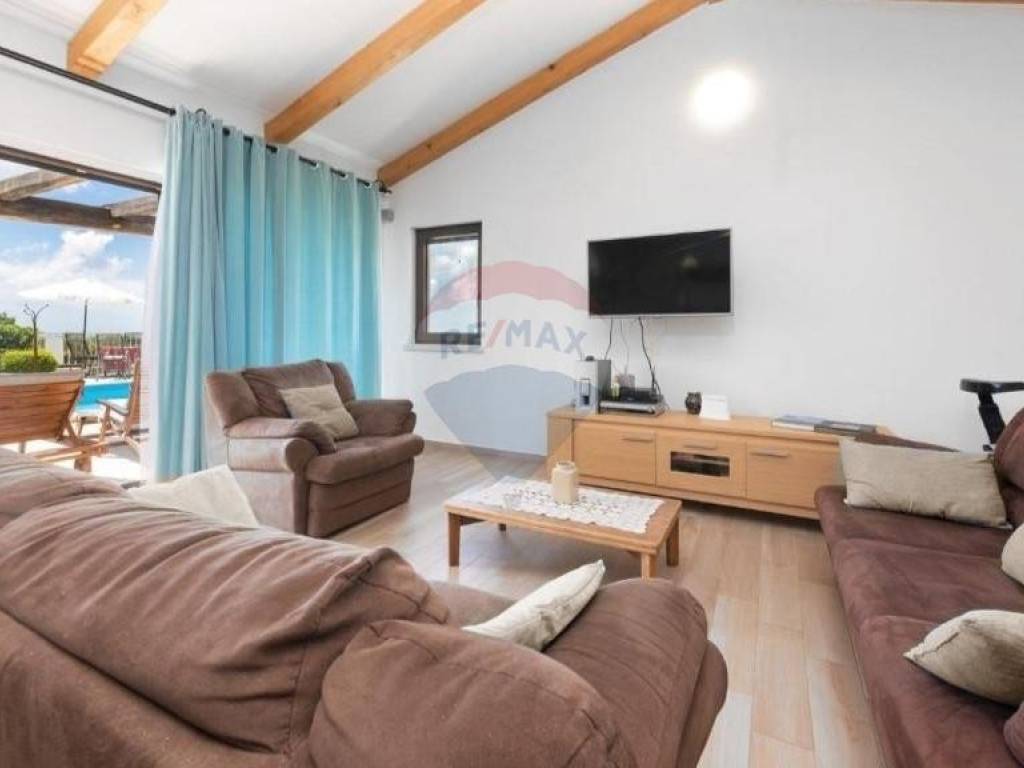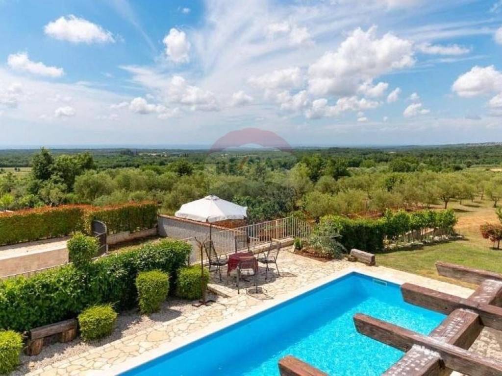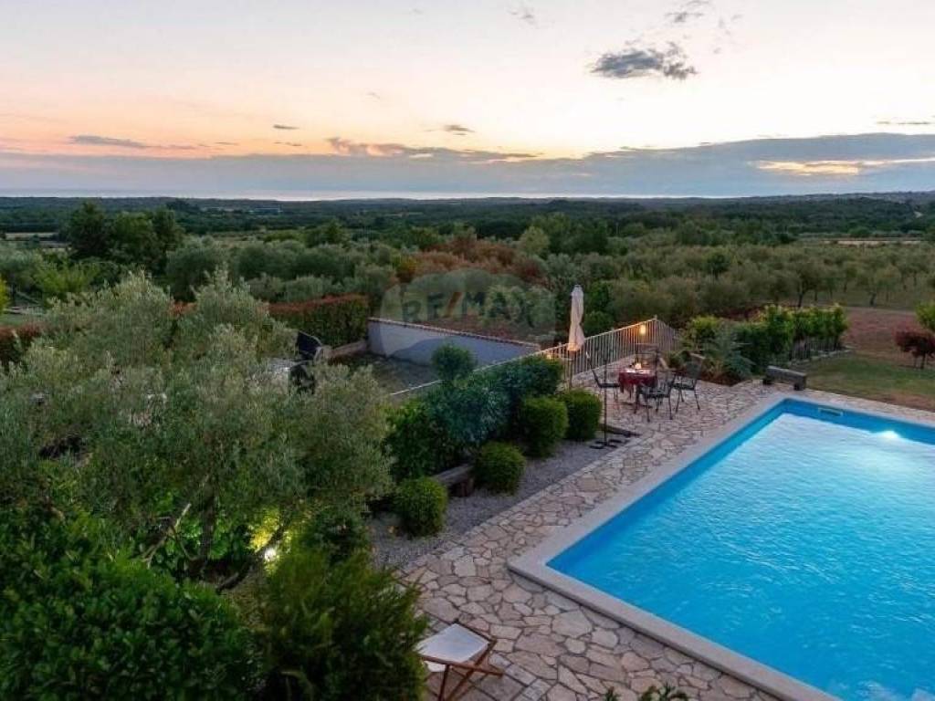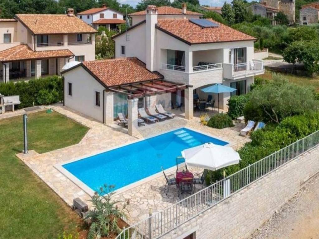 Prodaje se lijepa kuća smještena u blizini Višnjana, na udaljenosti od 13 km do mora. Smještena je na kraju malog, mirnog mjesta što joj pruža otvoreni pogled prema zapadu i moru. Kuća se sastoji od open space dnevnog djela s kuhinjom i blagovaonom, kupatila i jedne spavaće sobe u prizemlju dok su na katu smještene još dvije spavaće sobe, svaka sa svojom kupaonom te izlazom na prostranu, osunčanu terasu s predivnim pogledom na okolne maslinike, vinograde pa sve do mora. Kuća je sagrađena 2018. godine te je smještena na parceli od 762 m2. U svakoj prostoriji su postavljeni klima uređaji, dok se u dnevnom djelu nalazi veliki kamin s opcijom puhanja koji može grijati cijelo prizemlje kuće. Također su postavljene instalacije za podno grijanje kroz cijelu kuću koje je potrebno spojiti na dizalicu topline. Sa svojom odličnom lokacijom u blizini vrhunskih restorana i vinarija te očaravajućim, panoramskim pogledom na more ova je nekretnina idealna za rentu i ljubitelje Istarskog podneblja.