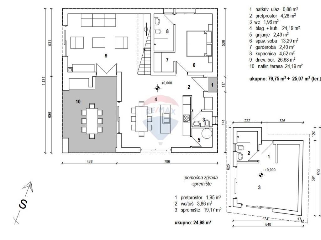 Uz kuću se nalazi pomoćna zgrada koja se sastoji od pretprostora, wc/tuš i spremište.