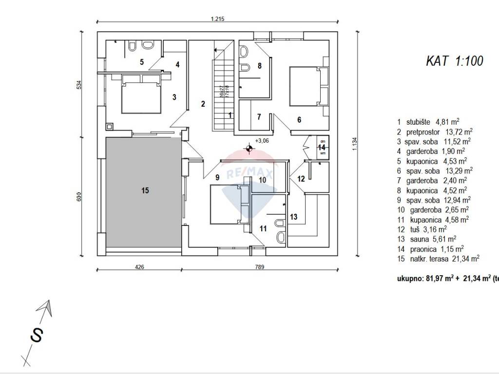 Na prvom katu smjestile su se tri spavaće sobe svaka sa svojom kupaonom i skupnom velikom natkrivenom terasom te praona, garderoba i sauna.