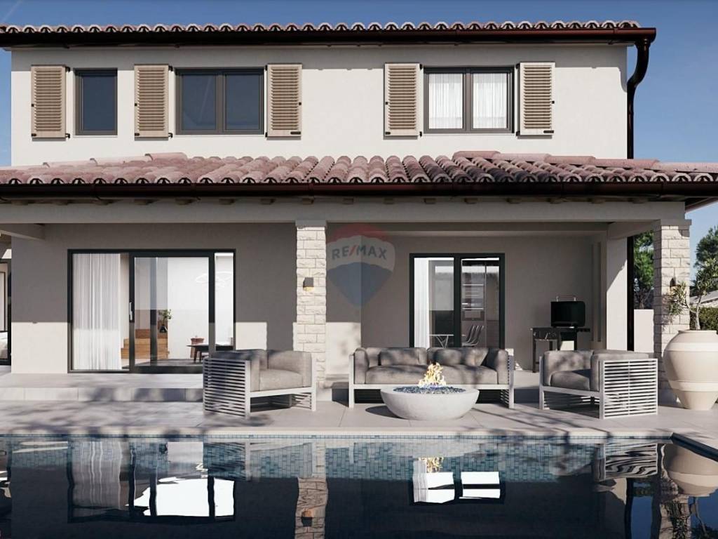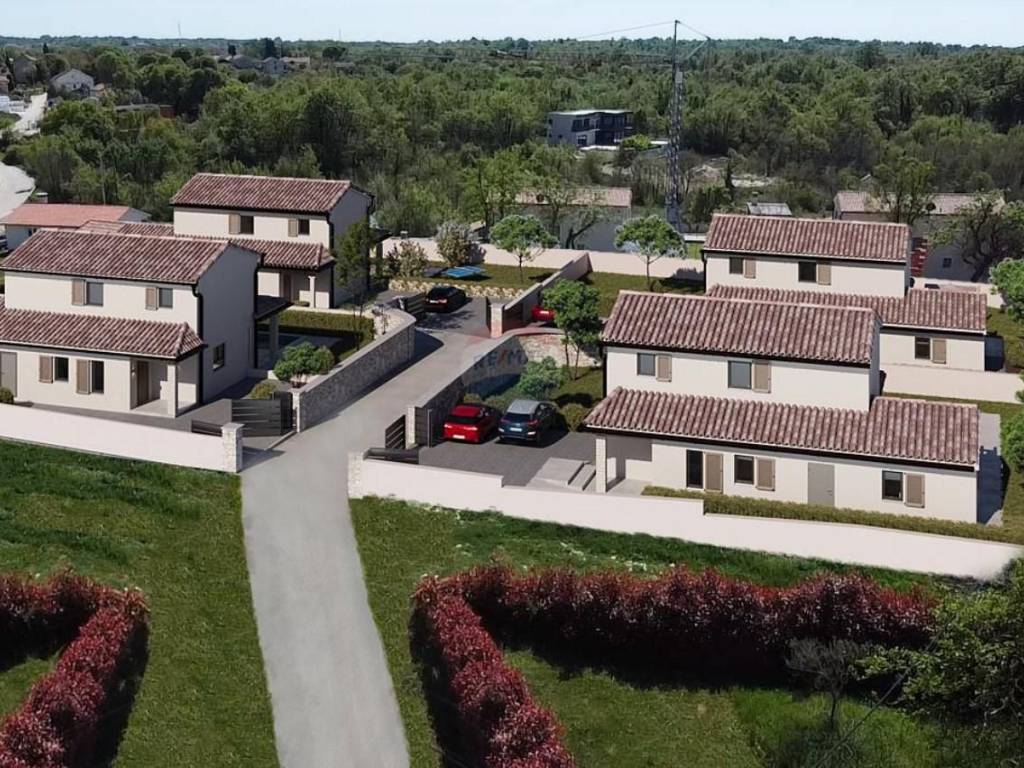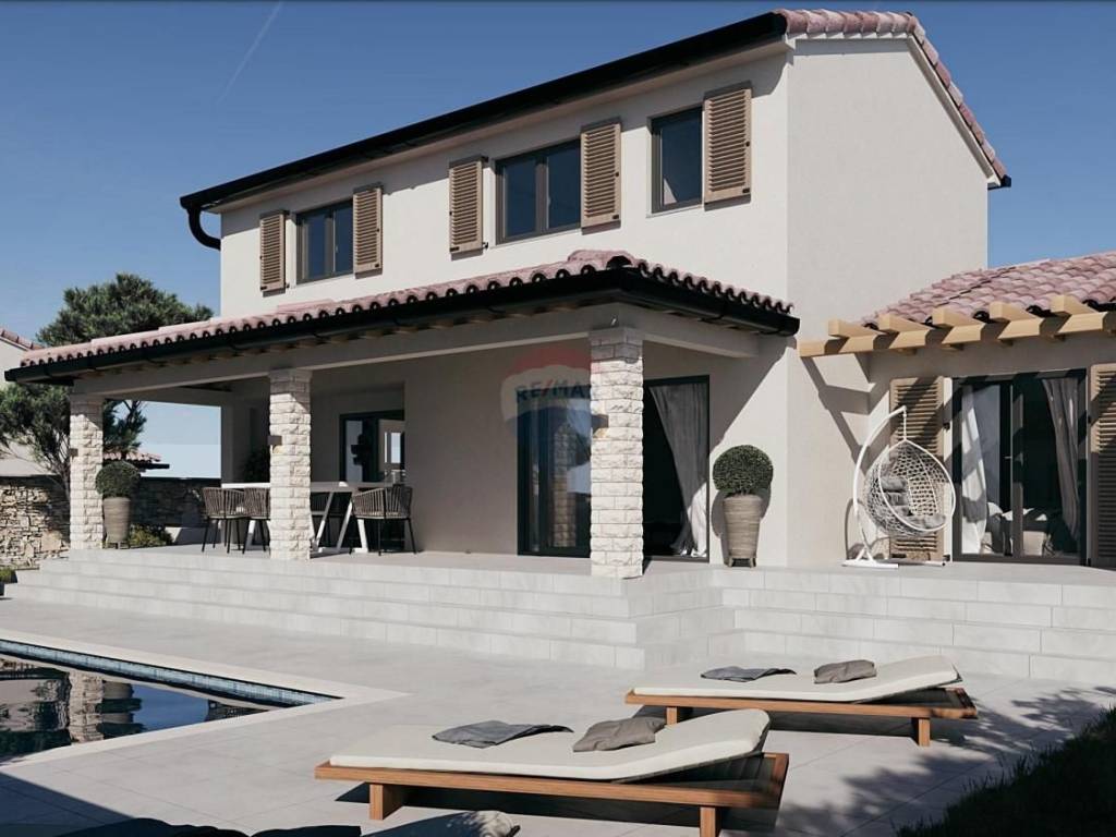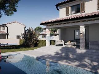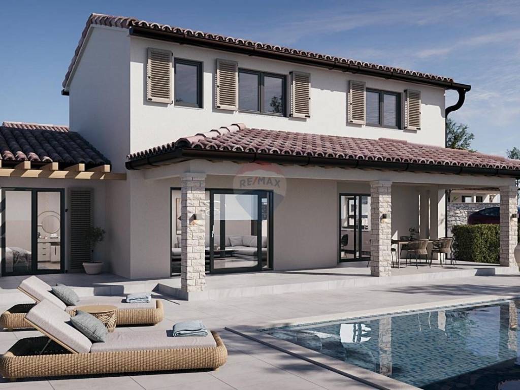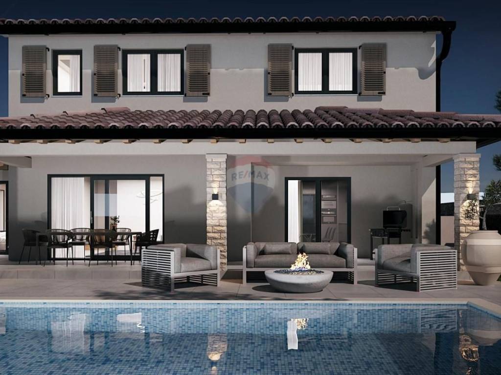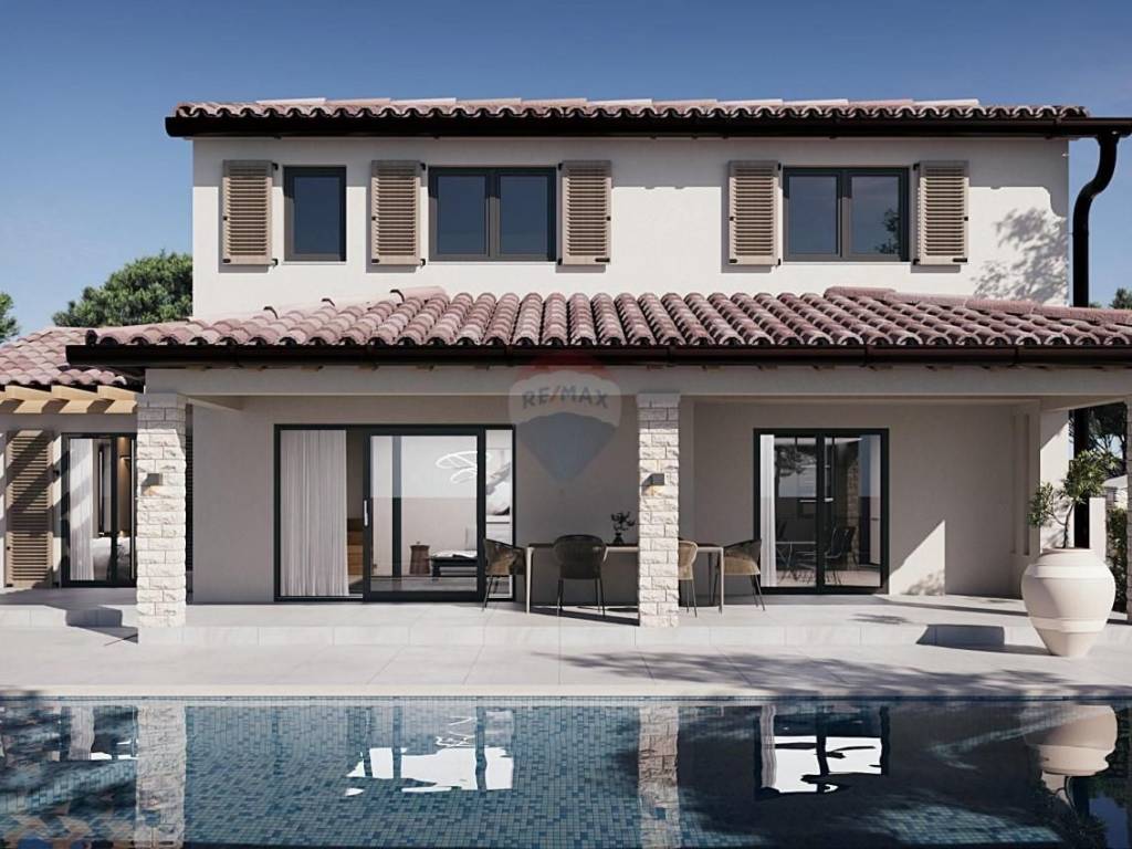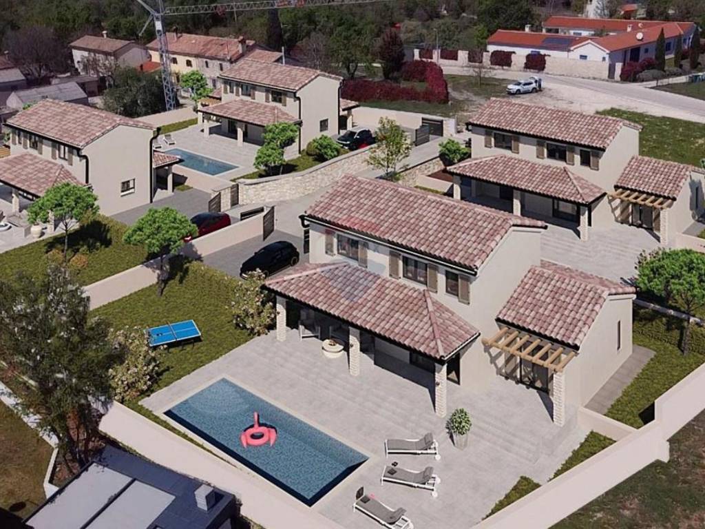 Prodajemo novosagrađenu rustikalnu kuću u mirnom mjestu ukupne površine 193m2. Kuća je koncipirana na dva kata. U prizemlju imamo ulazni hol, wc, dnevni boravak i kuhinju, spremište, sobu sa kupatilom te dvije natkrivene terase od kojih jedna ima izlaz na bazen. Prizemlje ima 136,92m2. Na prvom katu imamo dvije sobe sa kupatilima. Kat ima 55,93m2. Kuća se prodaje u roh bau fazi (zvati za info o stupnju izgrađenosti roh bau faze) Sve dozvole su ishodovane i plaćena su sva davanja. Moguće je dogovoriti i izgradnju kuće do faze useljenja. Kući pripada dvorište od 512m2 na kojem se nalazi bazen. Smještena je na lagano povišenom terenu u mirnom selu u ugodnom okruženju i pruža puno privatnosti. Okolica je idealna za rekreativne aktivnosti poput pješačenja, biciklizma i planinarenja, te uživanja u ljepotama prirode. Kuća je udaljena oko 15 kilometara od brojnih plaža prema zapadnoj i istočnoj strani Istre. Blizina Svetvinčente garantira autentično istarsko iskustvo.