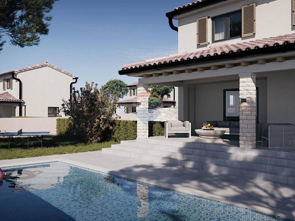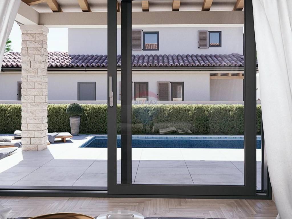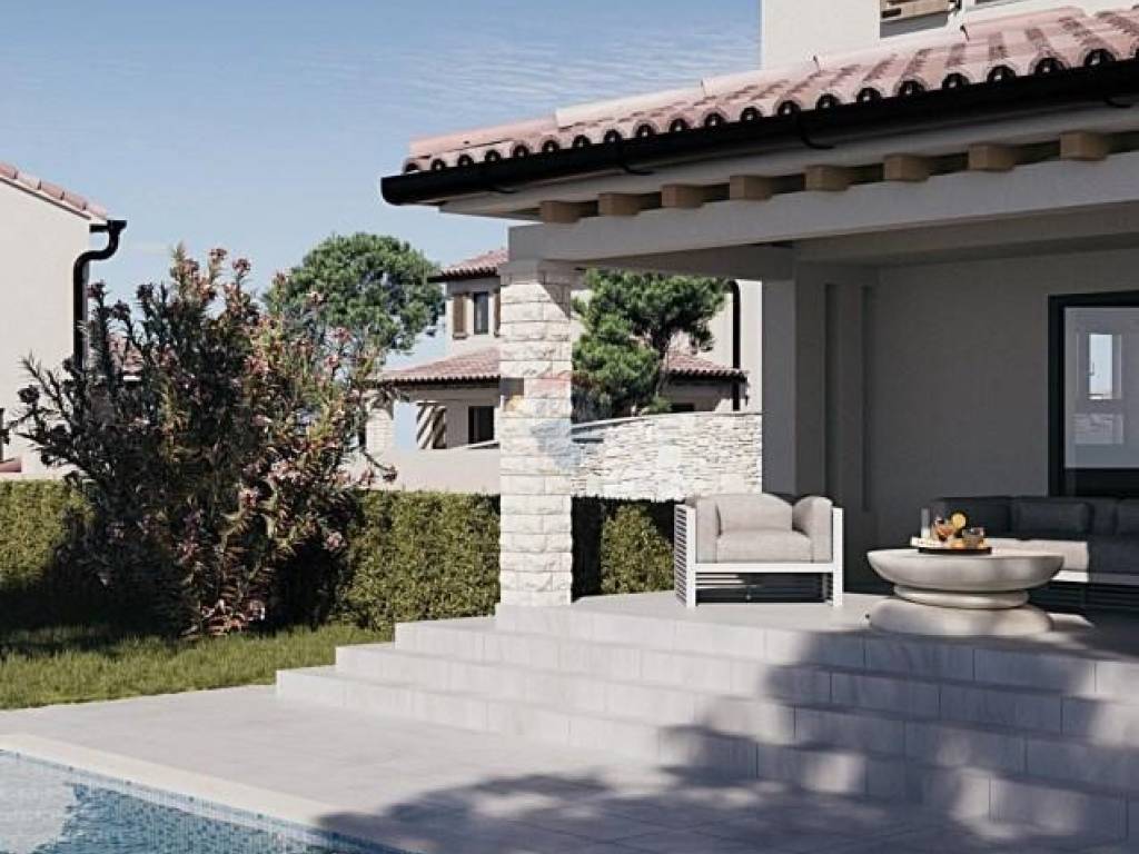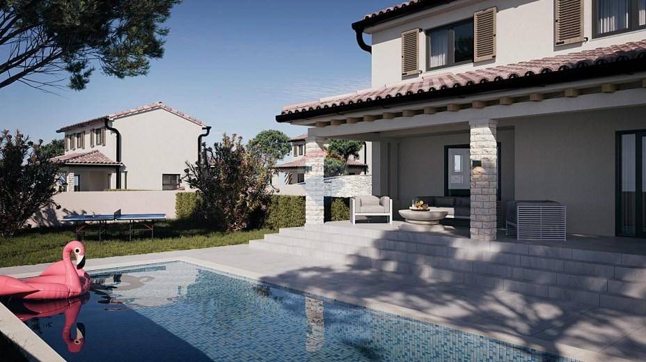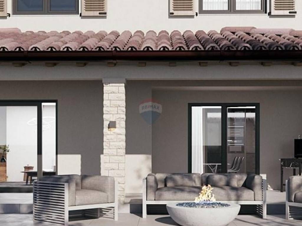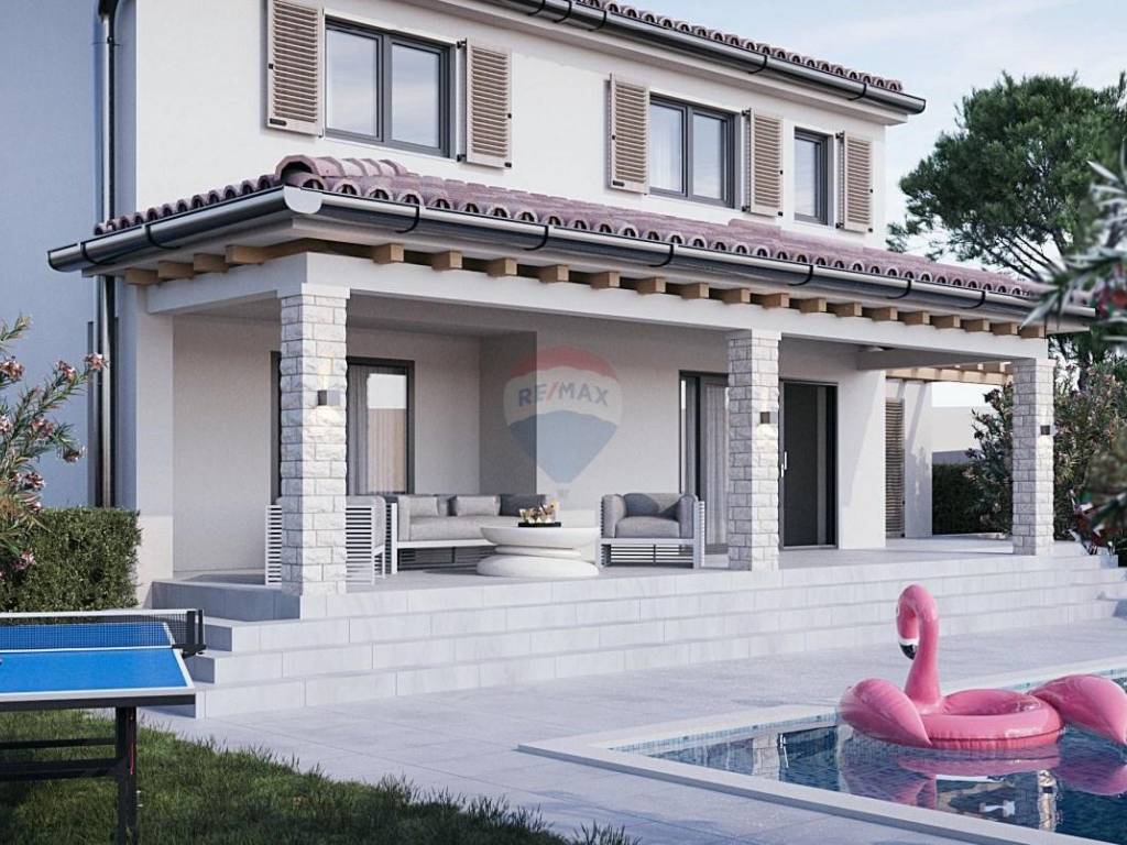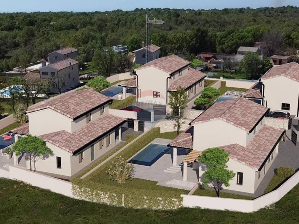 Prodajemo novosagrađenu rustikalnu kuću u mirnom mjestu ukupne površine 193m2. Kuća je koncipirana na dva kata. U prizemlju imamo ulazni hol, wc, dnevni boravak i kuhinju, spremište, sobu sa kupatilom te dvije natkrivene terase od kojih jedna ima izlaz na bazen. Prizemlje ima 136,92m2. Na prvom katu imamo dvije sobe sa kupatilima. Kat ima 55,93m2. Kuća se prodaje u roh bau fazi (zvati za info o stupnju izgrađenosti roh bau faze) Sve dozvole su ishodovane i plaćena su sva davanja. Moguće je dogovoriti i izgradnju kuće do faze useljenja. Kući pripada dvorište od 512m2 na kojem se nalazi bazen. Smještena je na lagano povišenom terenu u mirnom selu u ugodnom okruženju i pruža puno privatnosti. Okolica je idealna za rekreativne aktivnosti poput pješačenja, biciklizma i planinarenja, te uživanja u ljepotama prirode. Kuća je udaljena oko 15 kilometara od brojnih plaža prema zapadnoj i istočnoj strani Istre. Blizina Svetvinčente garantira autentično istarsko iskustvo.